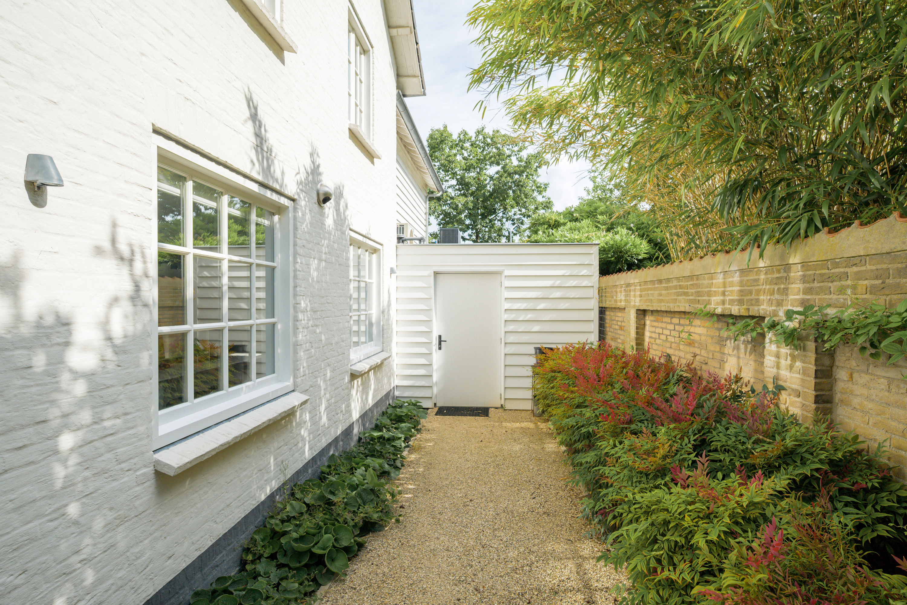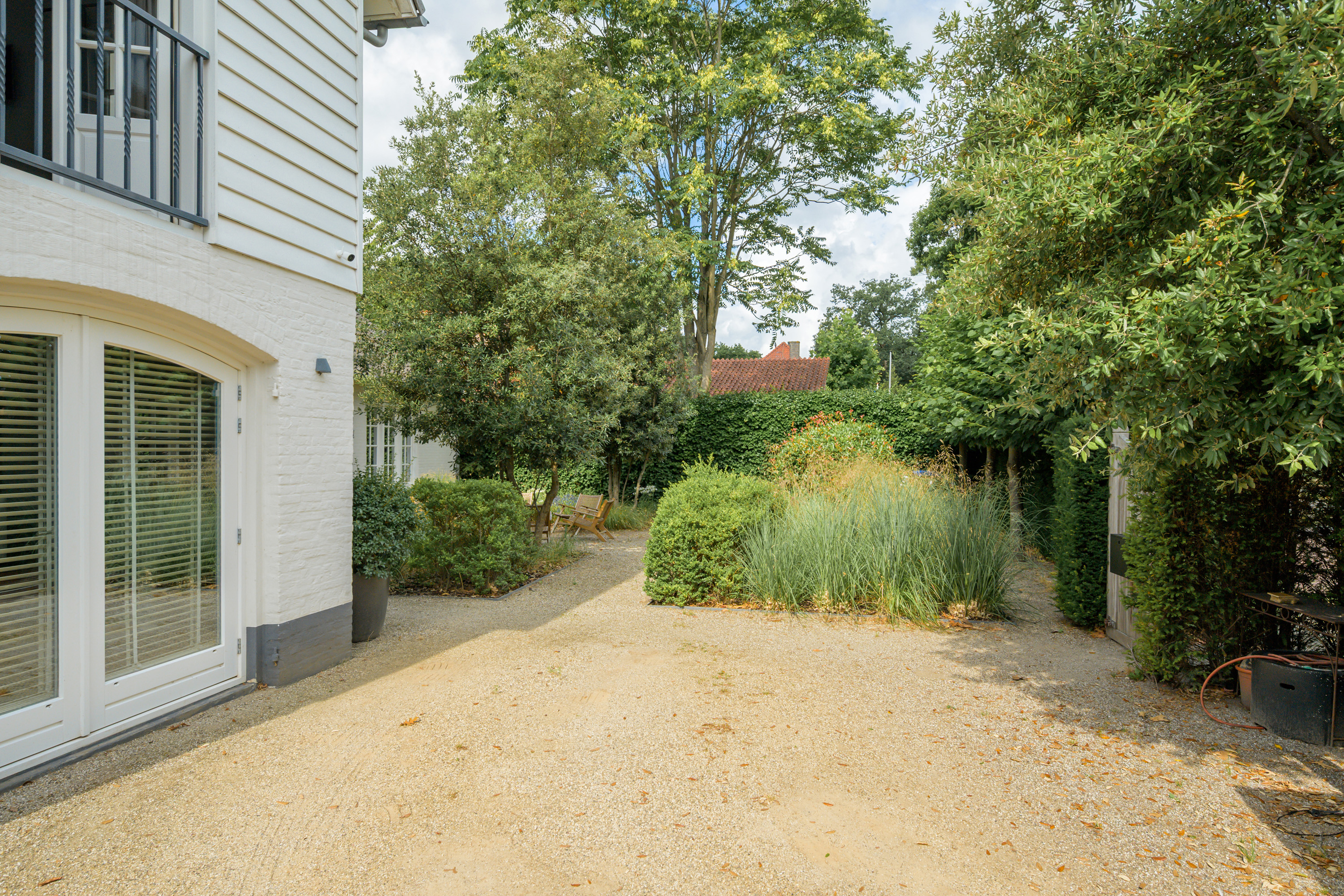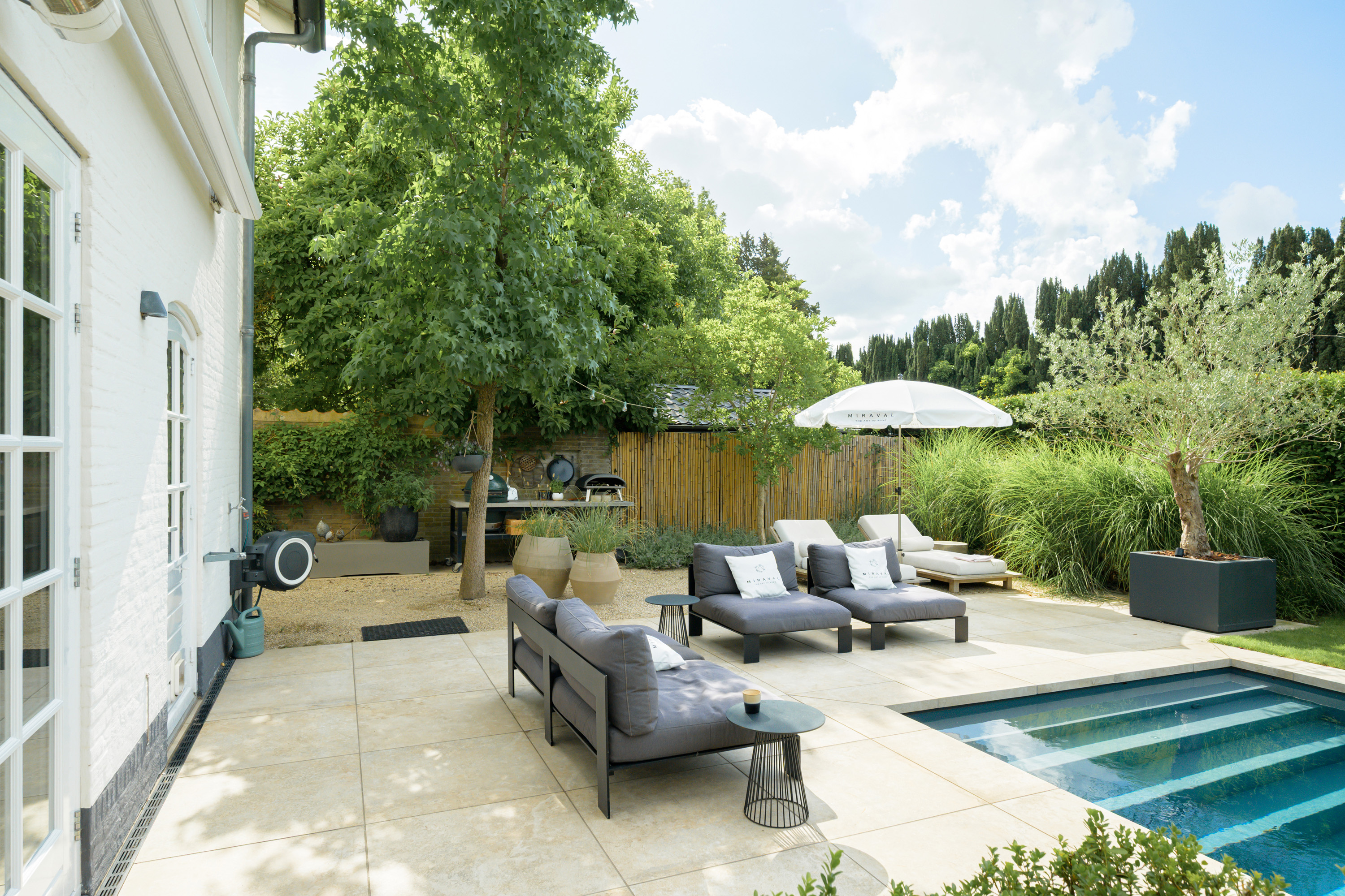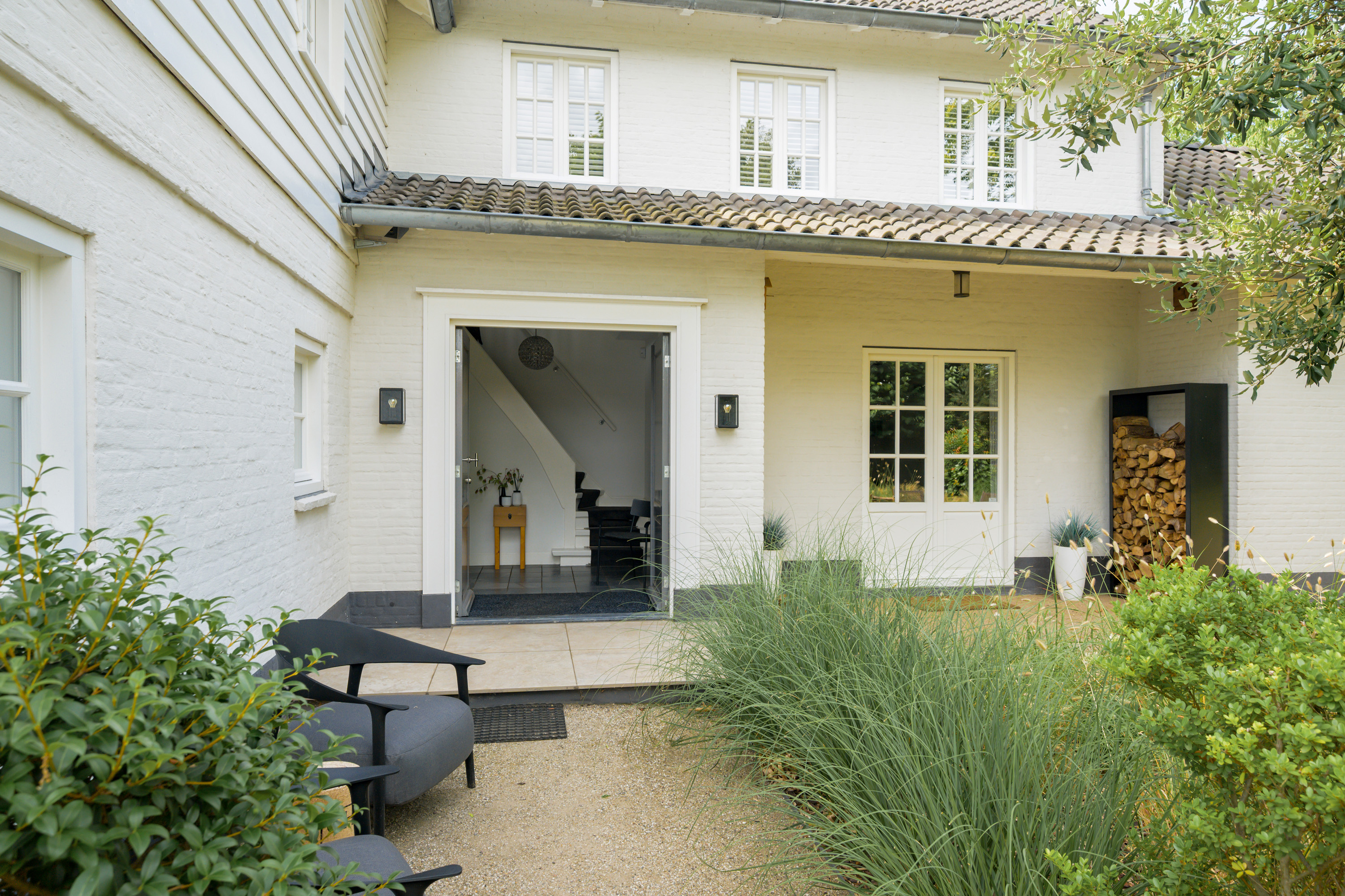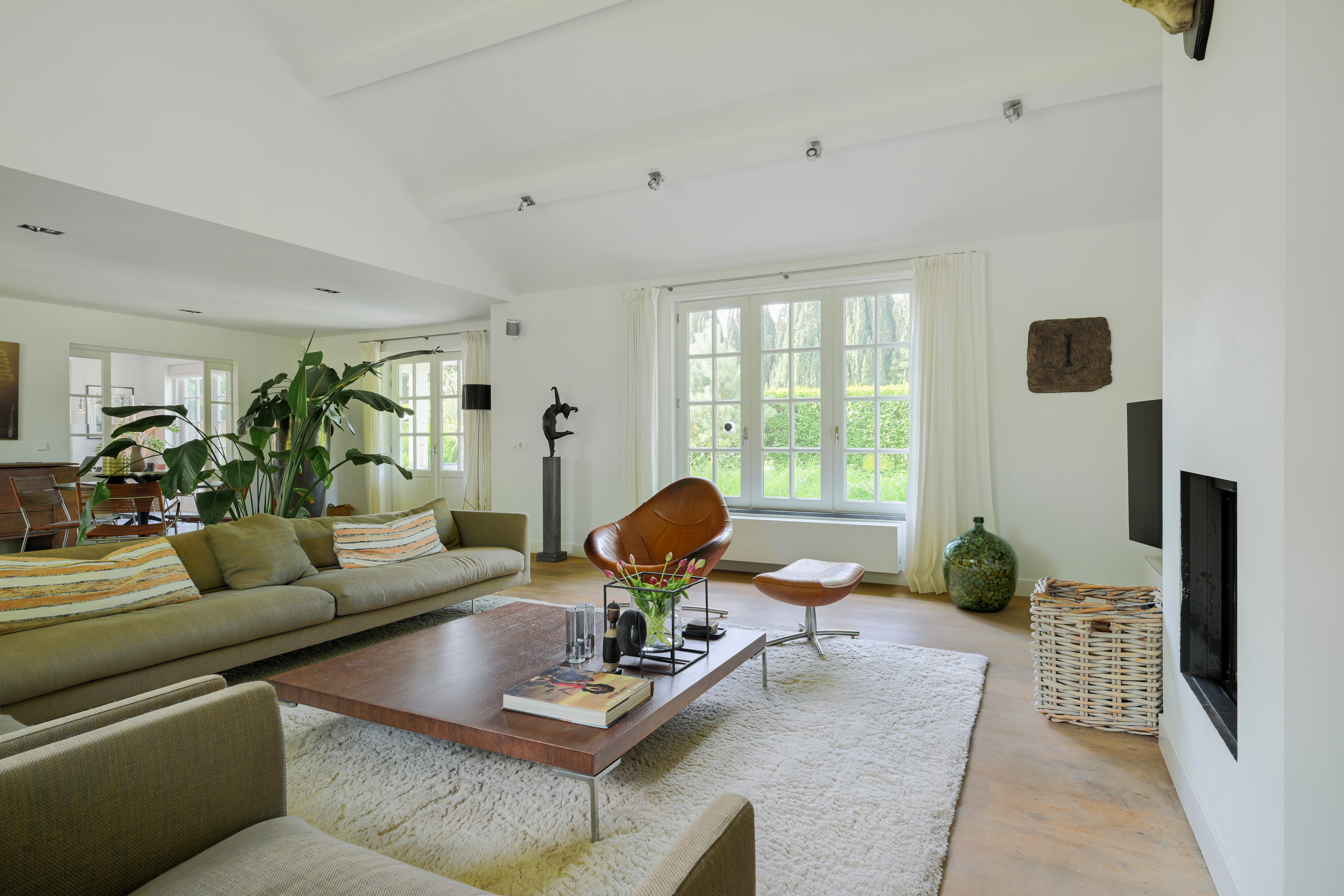 Set on a 660 m² plot, the garden was realized by Ronnie Renette, featuring a sleek heated pool, terraces framed by ornamental grasses, and mature trees for complete seclusion. The outbuilding offers secure storage, a fully automatic pool system, and garage access. An electrically operated gate secures multiple car parking, ensuring privacy and ease.