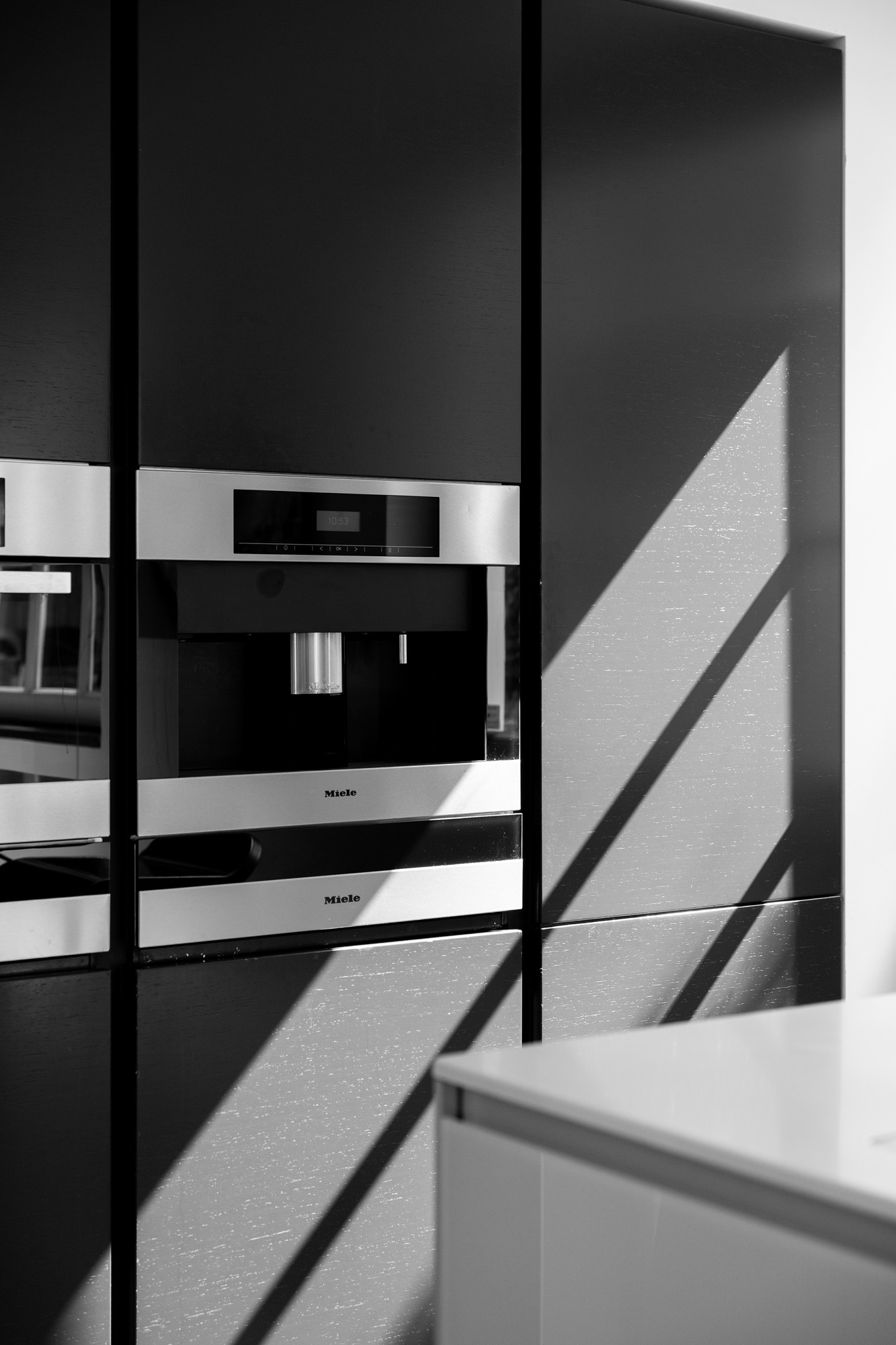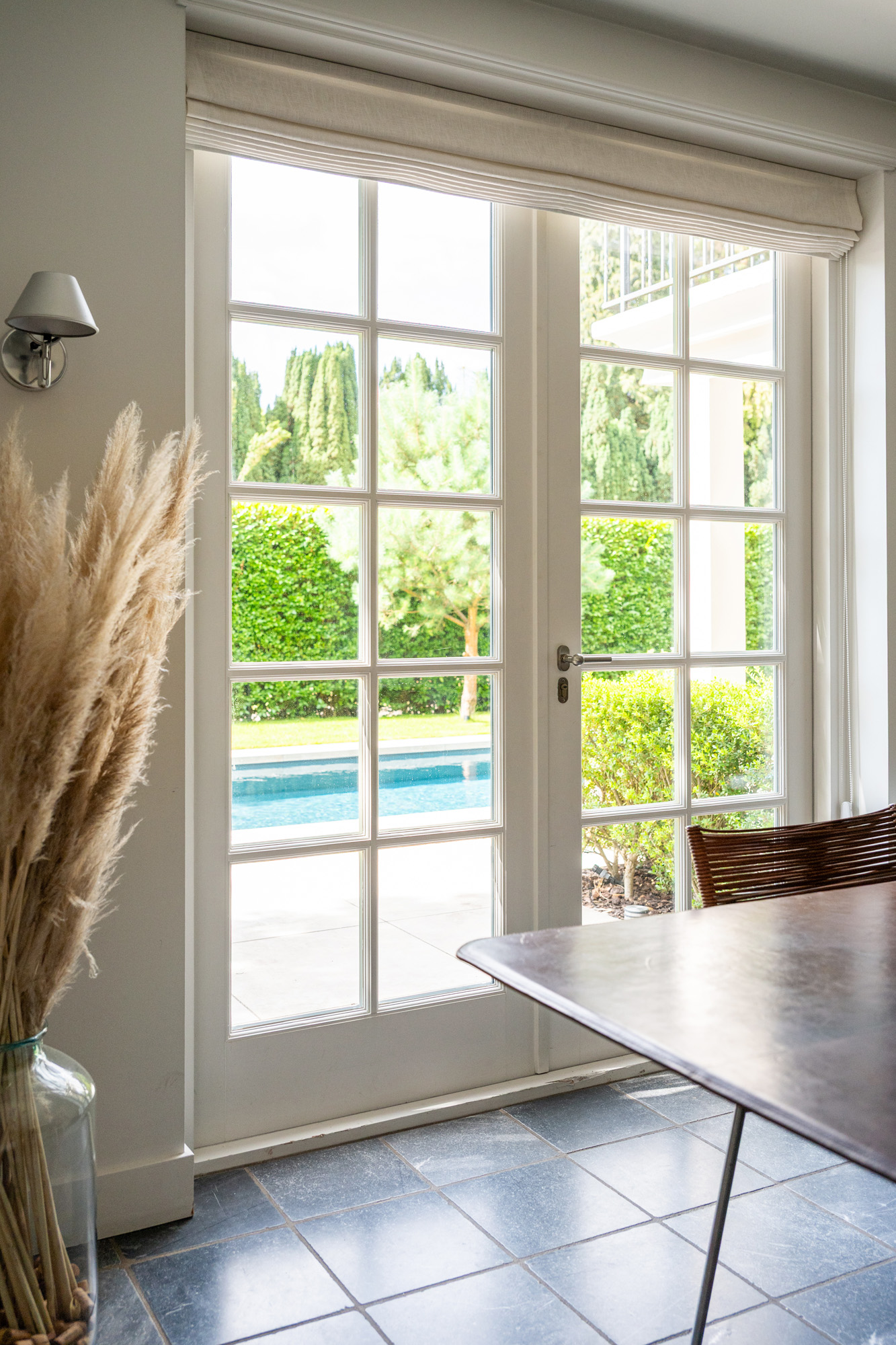 The fluid layout welcomes you through a distinctive entrance hall into airy interiors bathed in natural light. Wide wooden floorboards create a quiet continuity throughout the living areas, while French doors allow for seamless transitions between indoor space and the lush gardens. The living and dining rooms open toward the outdoors, offering layered views and a rhythm suited to both family life and discreet entertainment. The custom Valcucine kitchen integrates sophisticated appliances, composite counters, and a central island, establishing a functional yet inviting heart to the home.