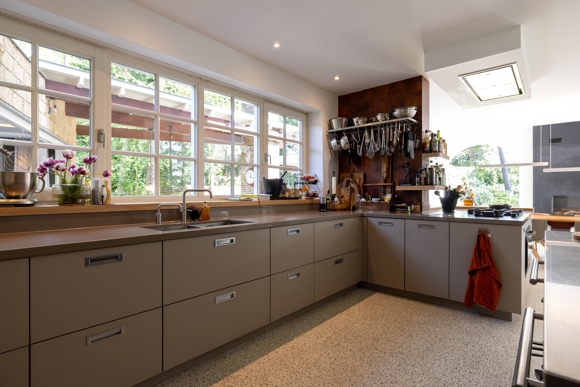 The main level is anchored by a generous living room illuminated by garden-facing windows and a gas fireplace, setting a relaxed rhythm for daily life. The custom-crafted kitchen by Antonissen Interior features premium Gaggenau appliances and connects intuitively to a covered terrace with a second outdoor kitchen, perfect for gathering throughout the seasons.