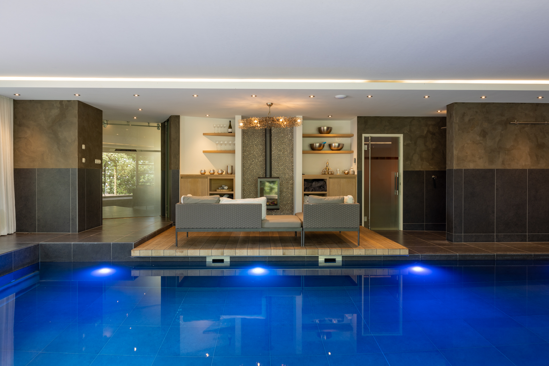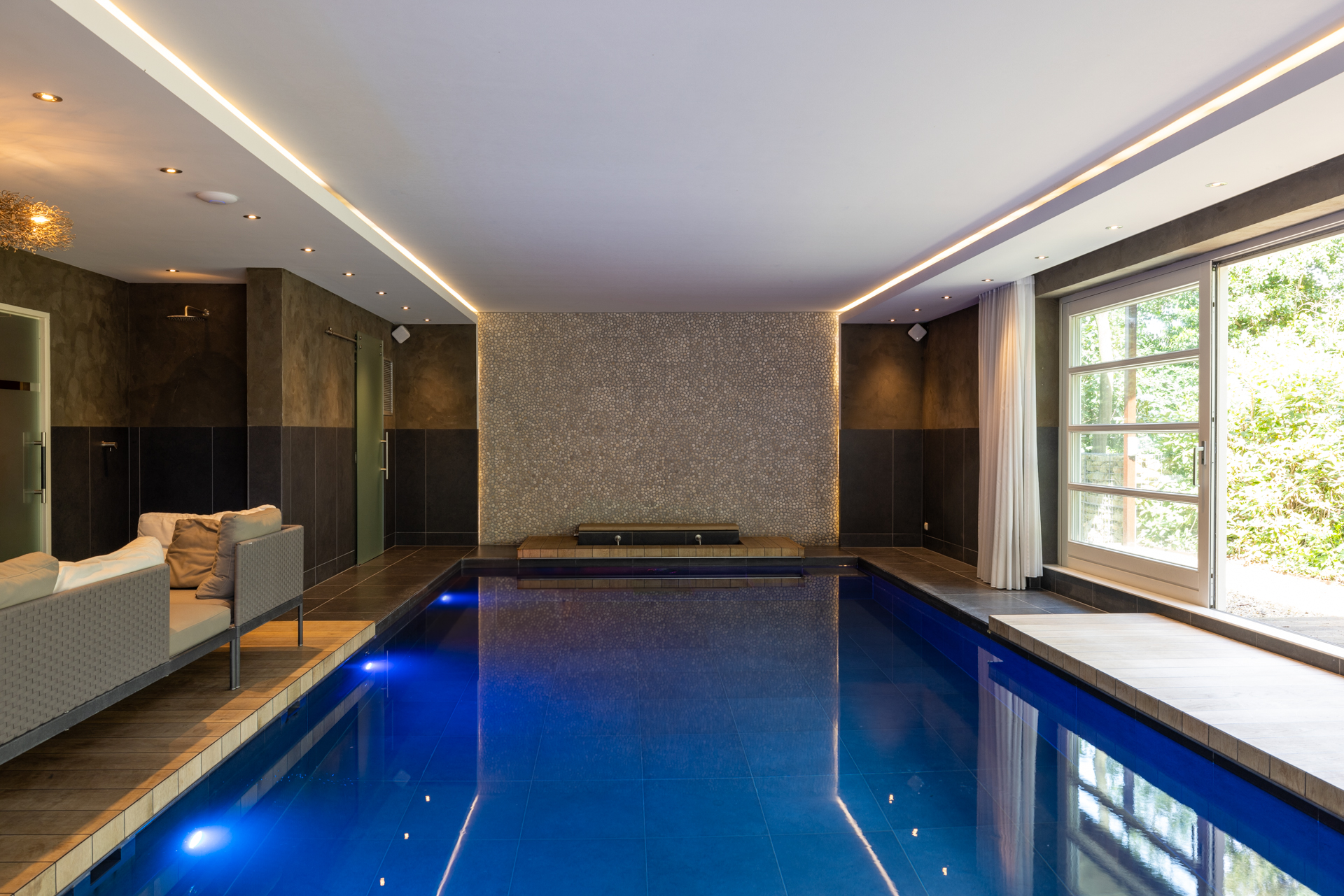 Wellness is at the heart of this villa. A dedicated suite includes a heated indoor pool with jet stream, sauna, rain shower, and relaxation area, opening via sliding doors onto the terrace and gardens. Fitness and office spaces are positioned for flexible, secluded work or recreation.
