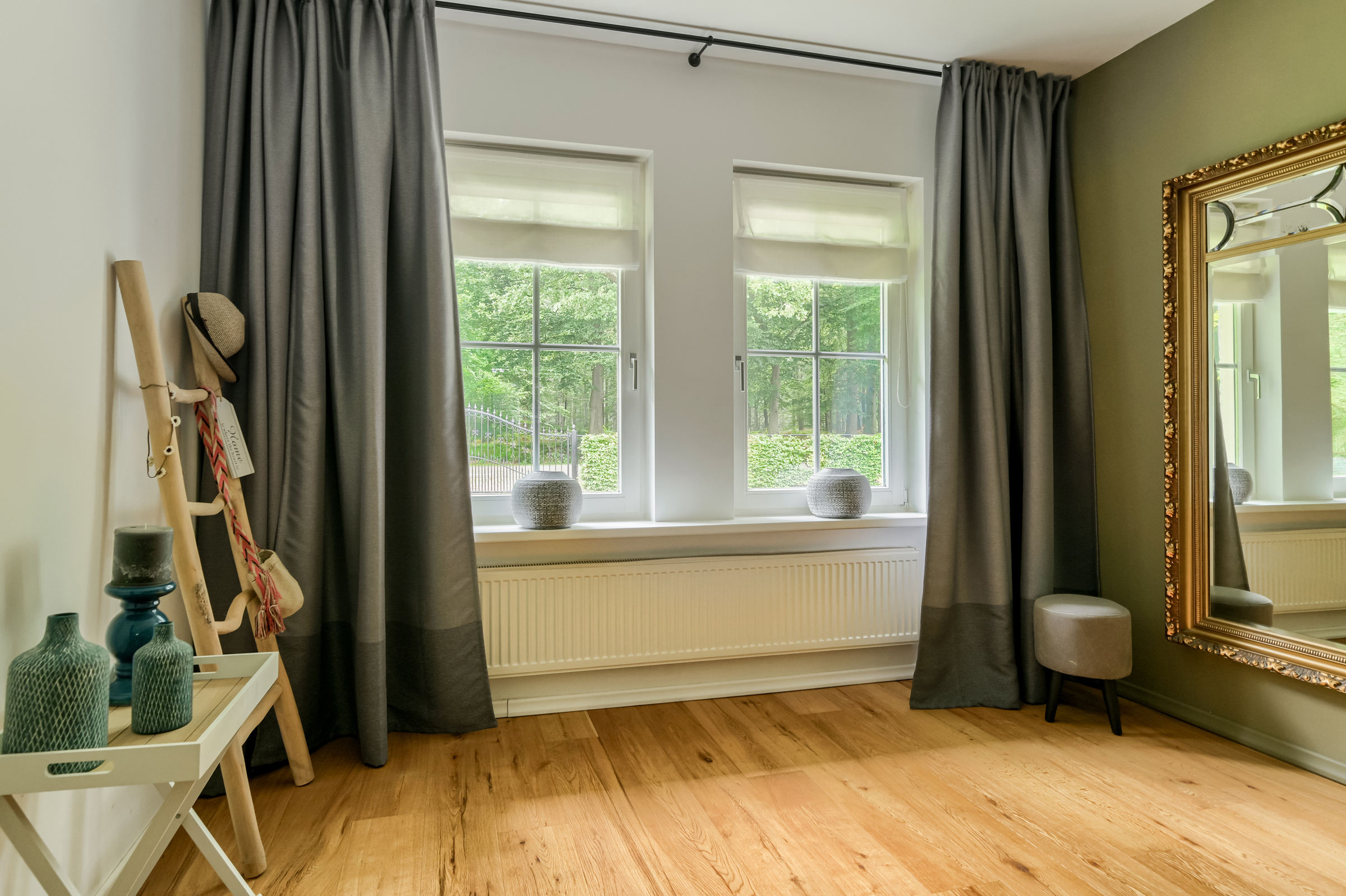 Spacious bedroom with views of the forest, the cozy patio, and beautiful views of the garden on both sides. A sliding door at the rear provides direct access to the garden. The floor is finished with attractive wooden planks.