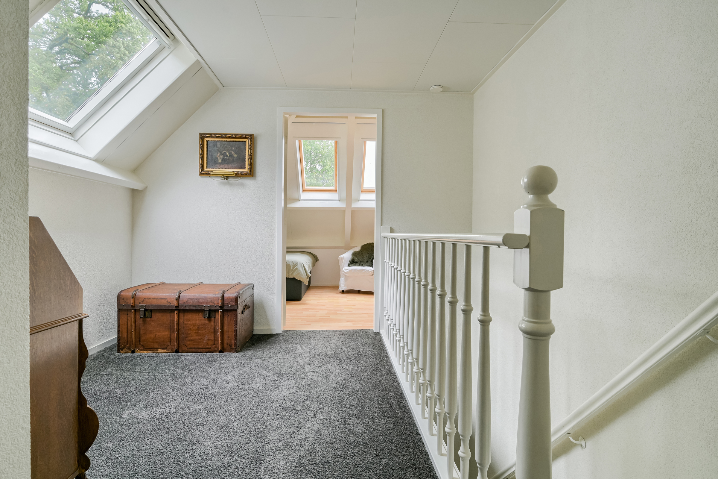 Landing with a large roof window, providing access to: