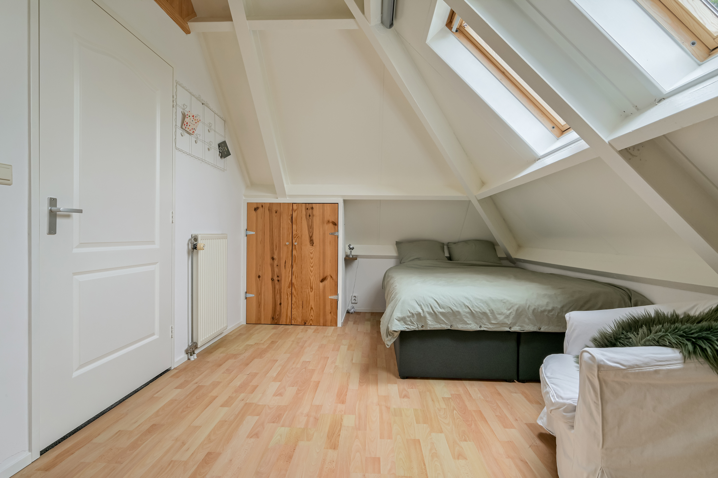 Side bedroom with two Velux roof windows and two built-in wardrobes. This room also provides access to a storage space housing the high-efficiency central heating boiler (circa 2018) and mechanical ventilation unit.