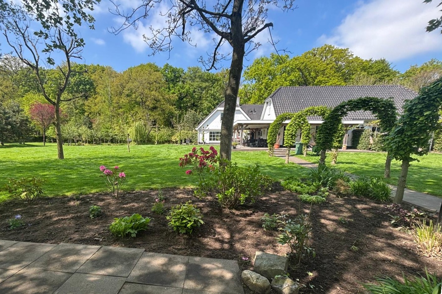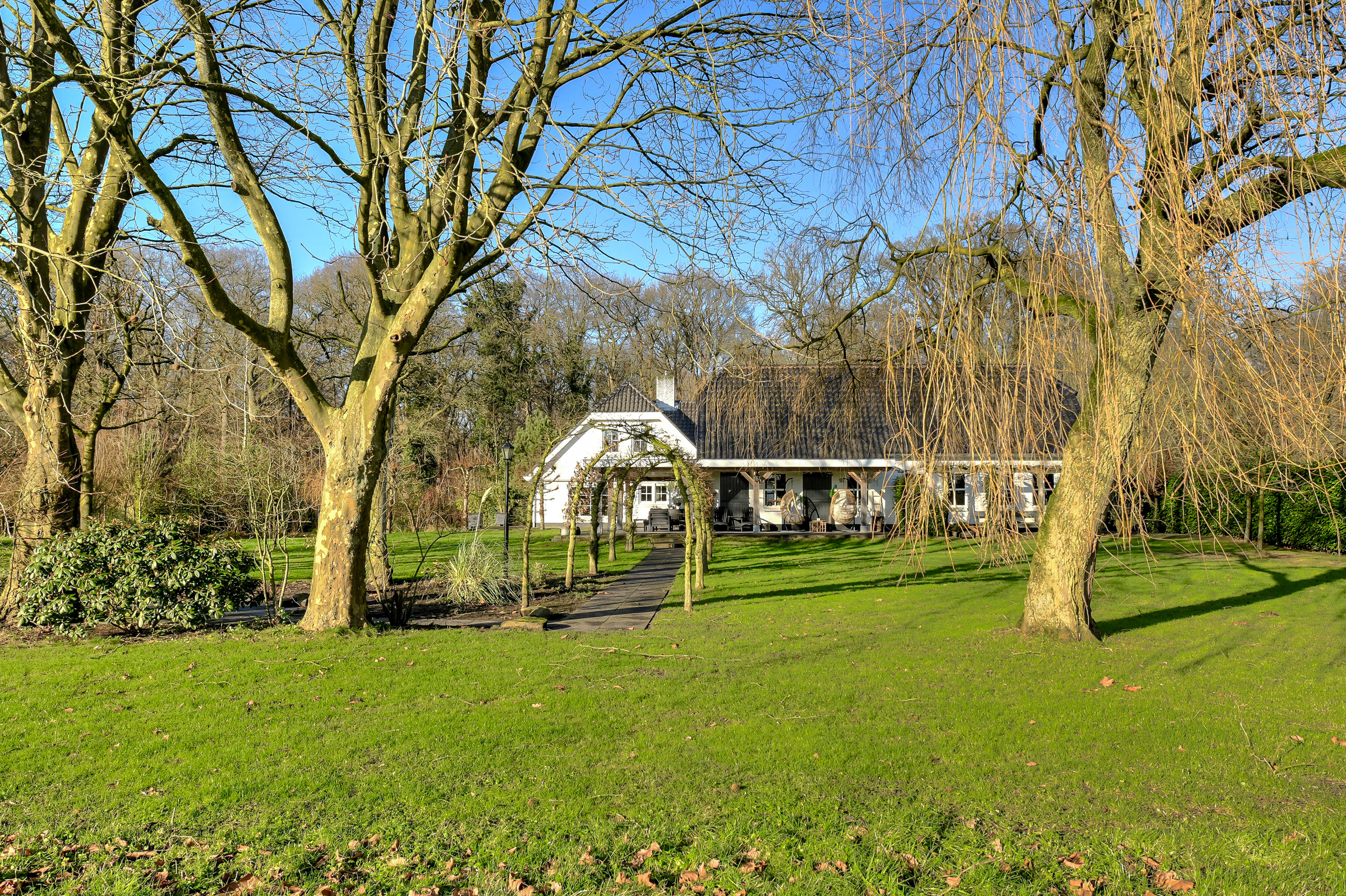 The beautiful, fully enclosed garden surrounds the home, offering maximum privacy and blending seamlessly into the natural surroundings. Several terraces have been laid out around the house with clean-lined concrete tiles. A veranda is situated between the house and the outbuilding and continues alongside and behind the outbuilding, offering wonderful views of the garden. Part of the veranda is equipped with patio heating. The garden includes a large lawn, a fruit orchard, and various trees and hedges. A lovely pond is located next to the house. The driveway, finished with decorative paving, leads to both the carport (space for two vehicles) and the large barn.