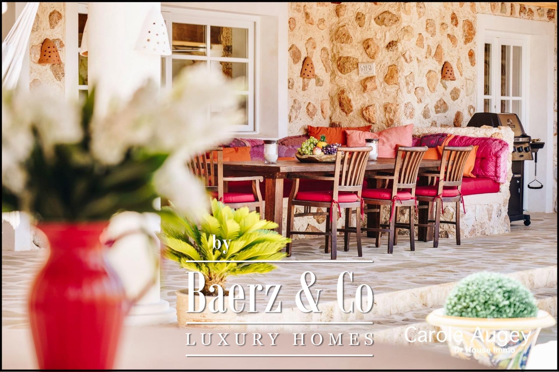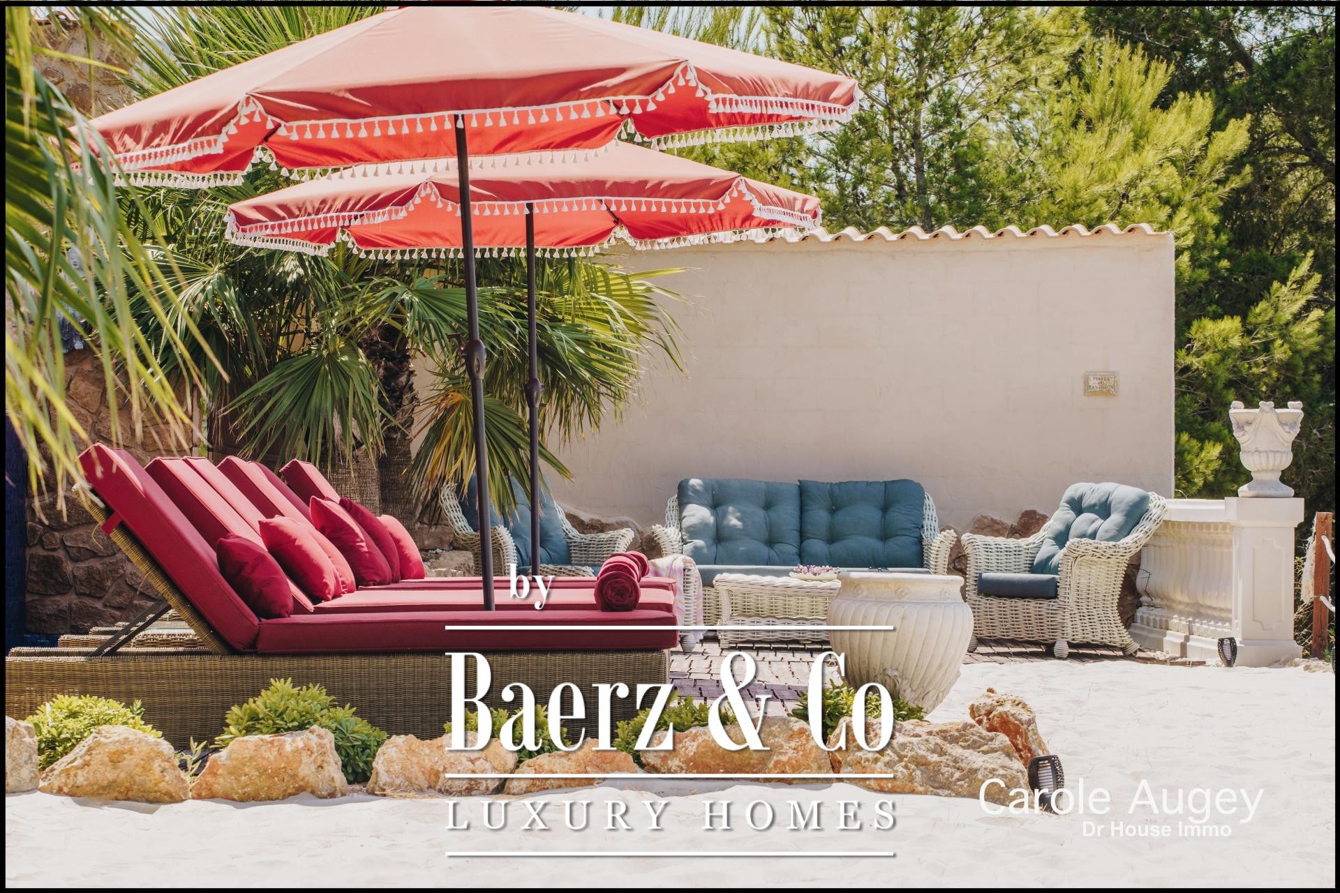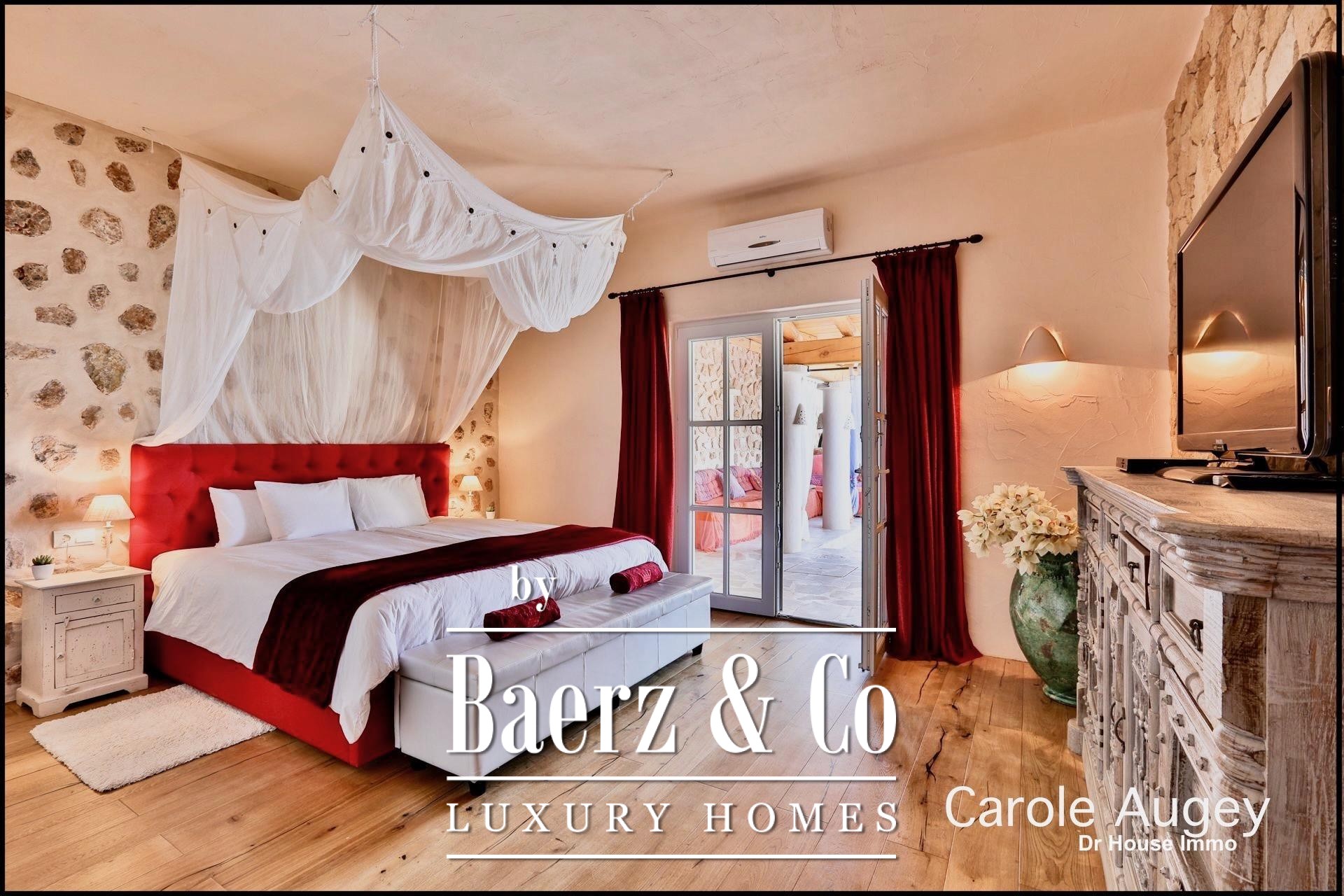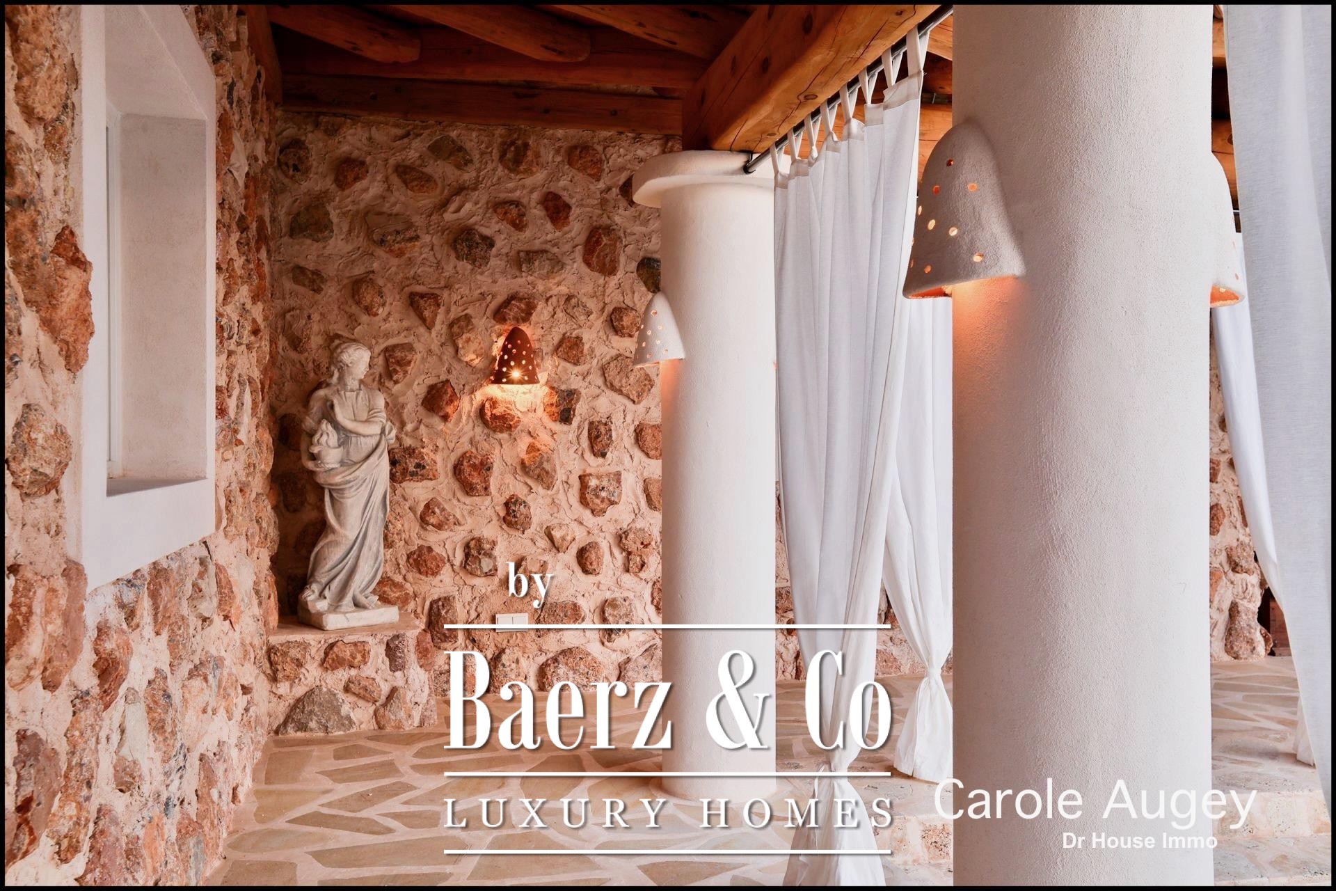 Looking for an authentic stay in absolute tranquility? Want to experience IBIZA in a different way? We propose staying in this 435m2 air-conditioned villa with 6 suites, located in a secure urbanization, with breathtaking views of the golf course and partial sea views. The property is close to Santa Eularia, Ibiza, and Santa Gertrudis, and only 5 minutes from a cove. Recently built on a hilly terrain, respecting the style of Mediterranean houses, its staircase, golden stone walls, and beautiful fountain immediately transport you elsewhere. There is an atmosphere of letting go, relaxation mixed with a cozy feeling. The villa features 6 or 4 air-conditioned