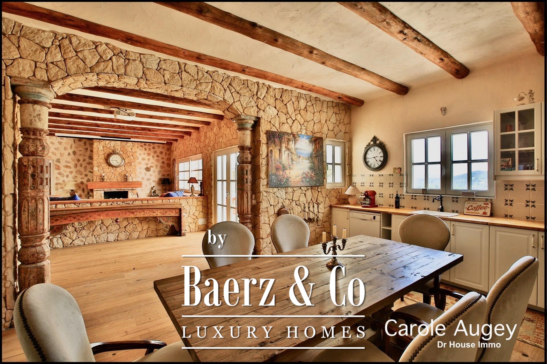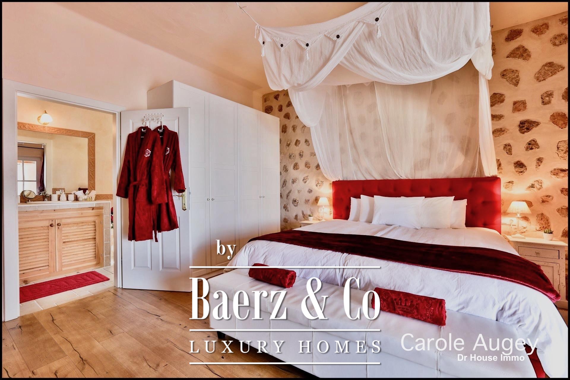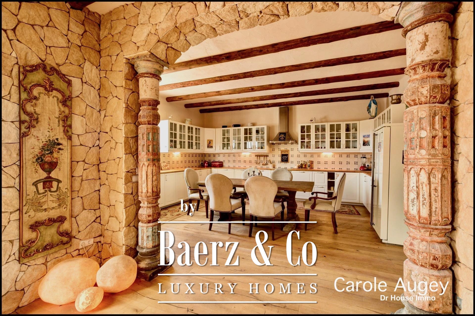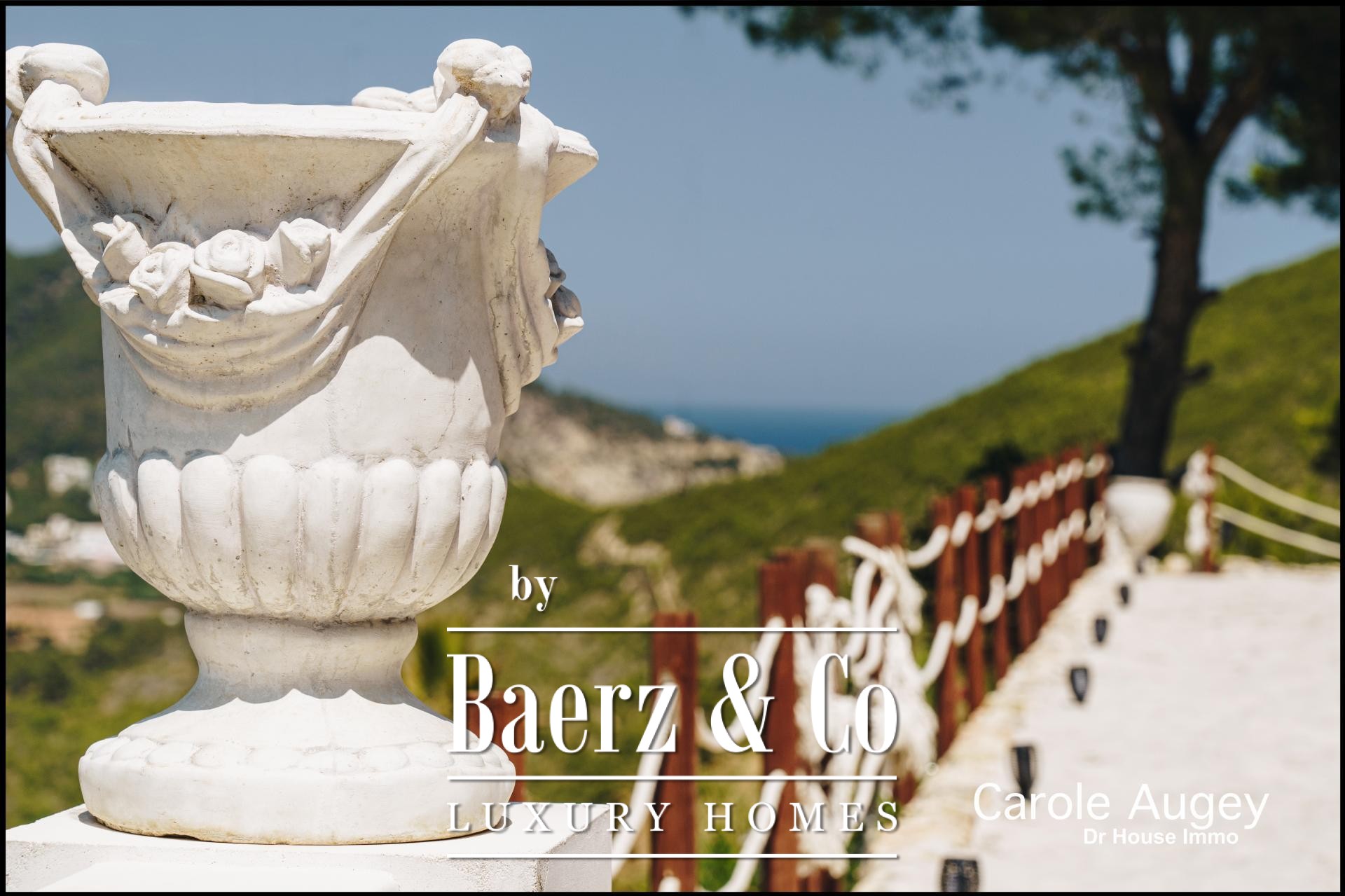 Looking for an authentic stay in absolute tranquility? Want to experience IBIZA in a different way? We propose staying in this 435m2 air-conditioned villa with 6 suites, located in a secure urbanization, with breathtaking views of the golf course and partial sea views. The property is close to Santa Eularia, Ibiza, and Santa Gertrudis, and only 5 minutes from a cove. Recently built on a hilly terrain, respecting the style of Mediterranean houses, its staircase, golden stone walls, and beautiful fountain immediately transport you elsewhere. There is an atmosphere of letting go, relaxation mixed with a cozy feeling. The villa features 6 or 4 air-conditioned