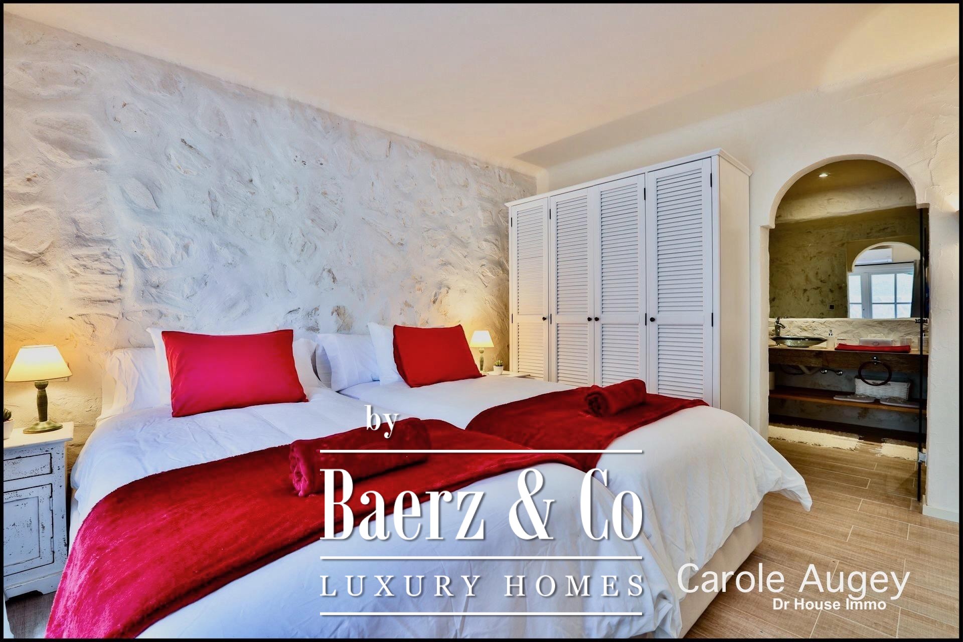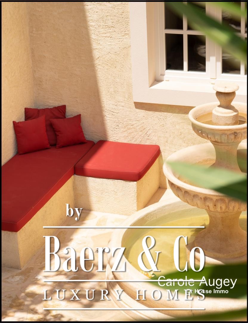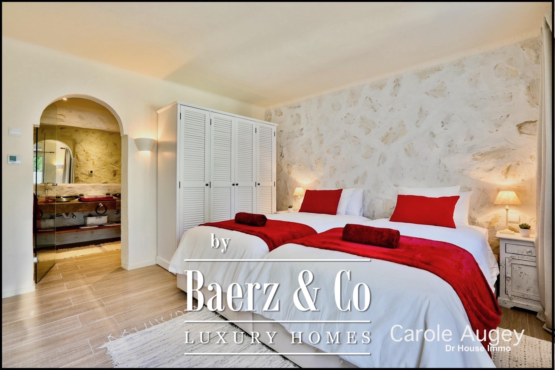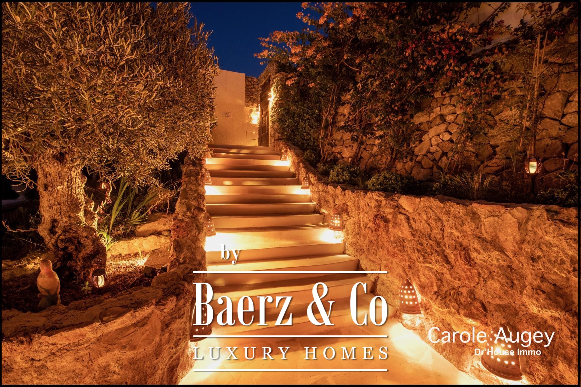 suites, a large open living space opening onto the terrace and pool area. In the living area, there is a state-of-the-art home cinema, a large fireplace, and a spacious fully equipped kitchen. On the terrace, there is a large table for epicurean gatherings, several sofas under pergolas inviting relaxation, and a beautiful heated infinity pool. Not to mention the beautiful sandy beach nearby. Three washing machines, three dryers, a barbecue, and a few fitness machines are at your disposal. The villa is fully air-conditioned and heated with underfloor heating in winter. Concierge service and airport transfers are available upon request.