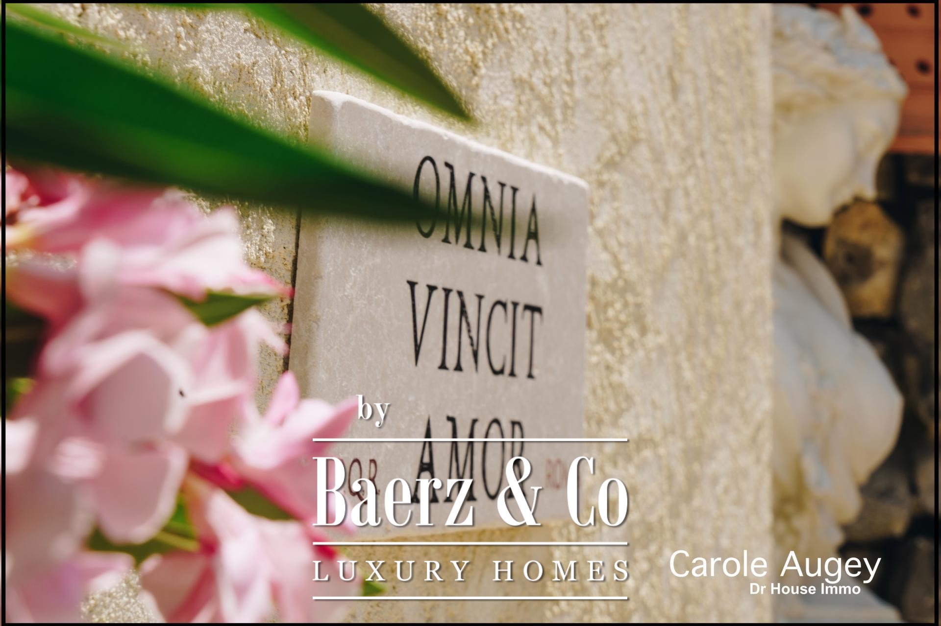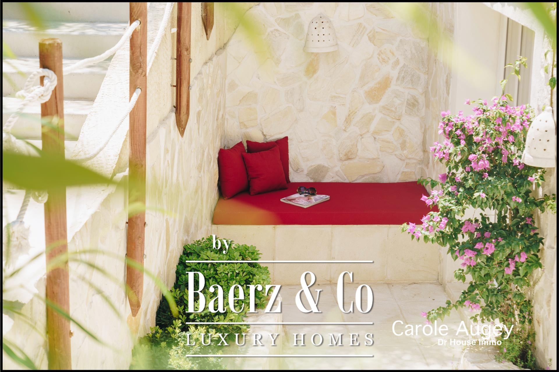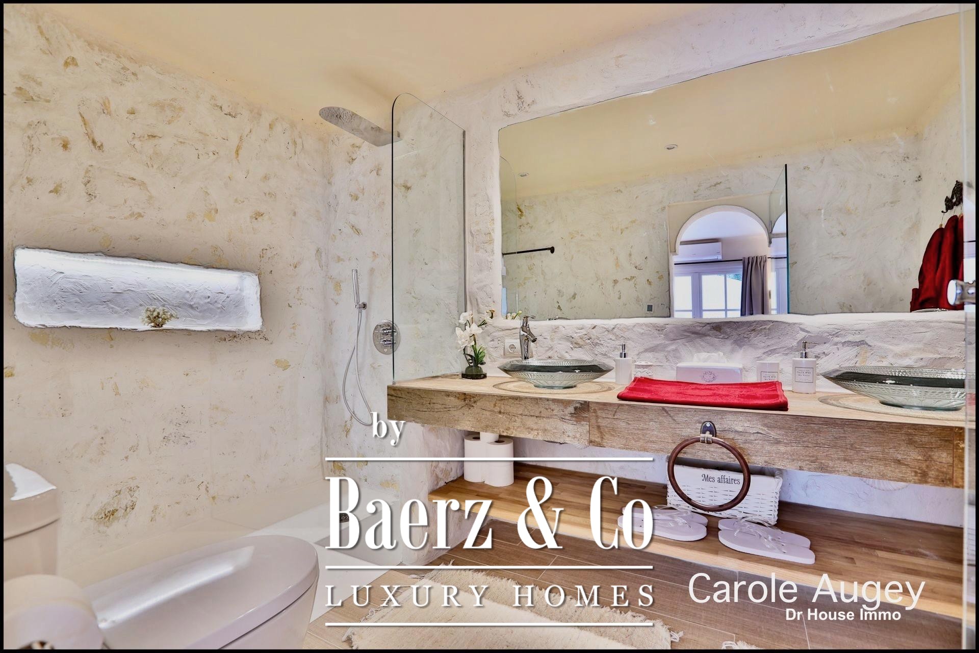 suites, a large open living space opening onto the terrace and pool area. In the living area, there is a state-of-the-art home cinema, a large fireplace, and a spacious fully equipped kitchen. On the terrace, there is a large table for epicurean gatherings, several sofas under pergolas inviting relaxation, and a beautiful heated infinity pool. Not to mention the beautiful sandy beach nearby. Three washing machines, three dryers, a barbecue, and a few fitness machines are at your disposal. The villa is fully air-conditioned and heated with underfloor heating in winter. Concierge service and airport transfers are available upon request.