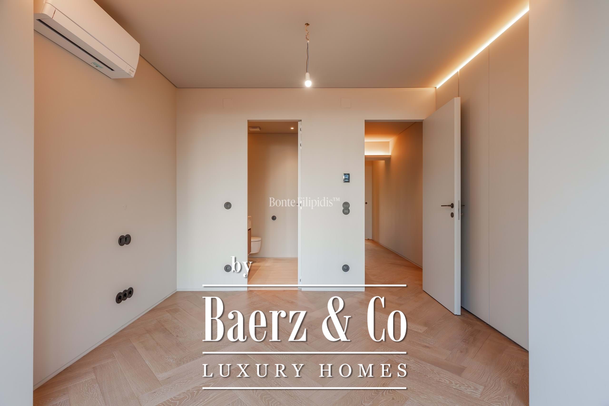 A grand entrance hall introduces a generous 48 m² living room, capturing abundant natural light and river views from an inviting balcony. The space flows seamlessly to a modern kitchen of 15.4 m², fitted with Smeg appliances, perfect for both daily living and quiet gatherings. Underfloor heating and air conditioning bring year-round comfort, complemented by double glazing throughout.