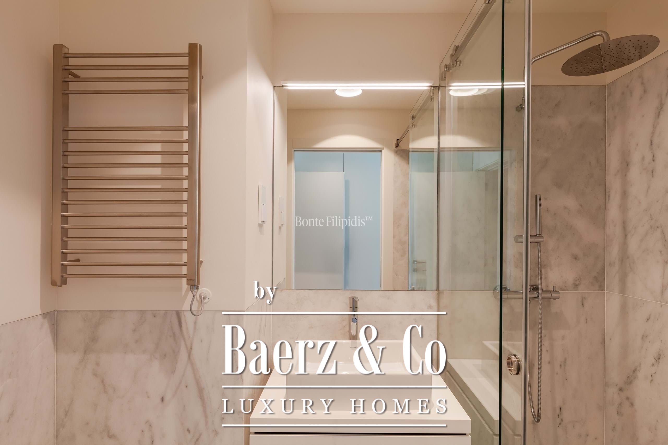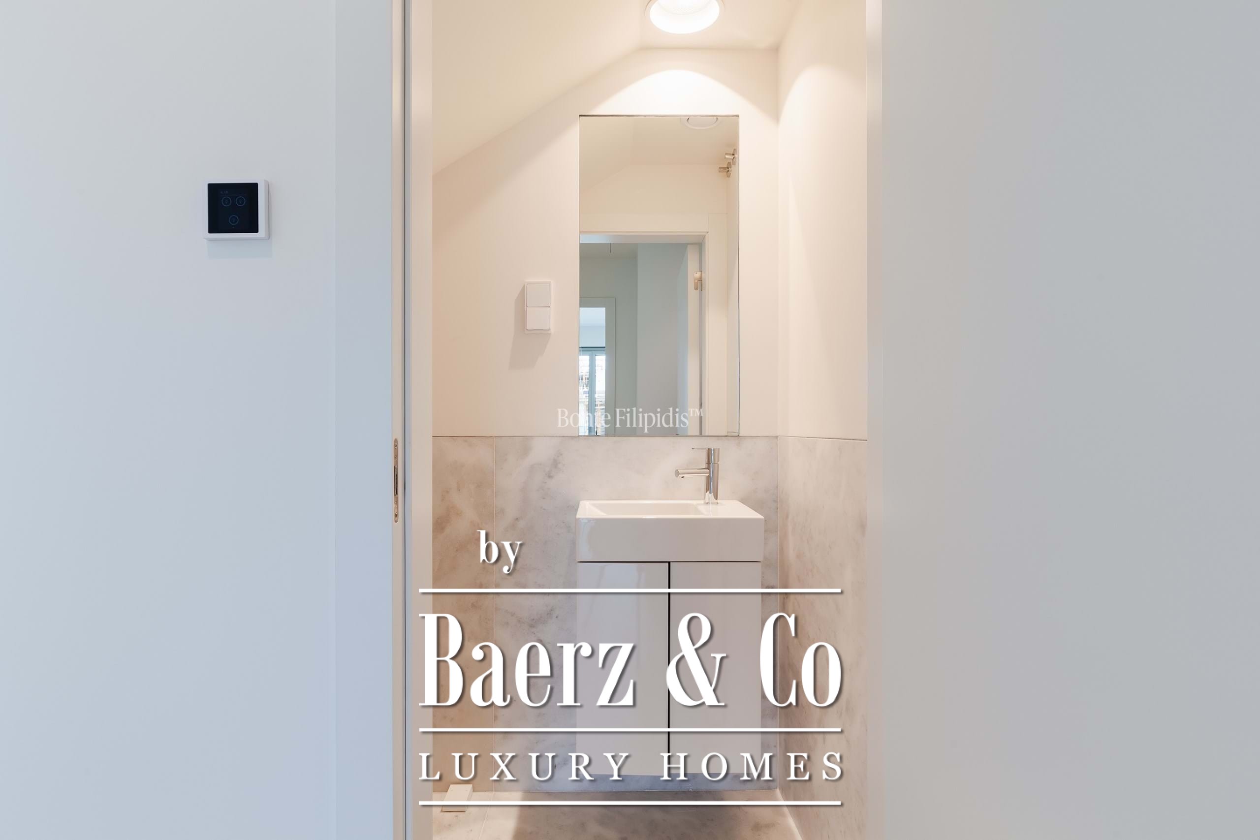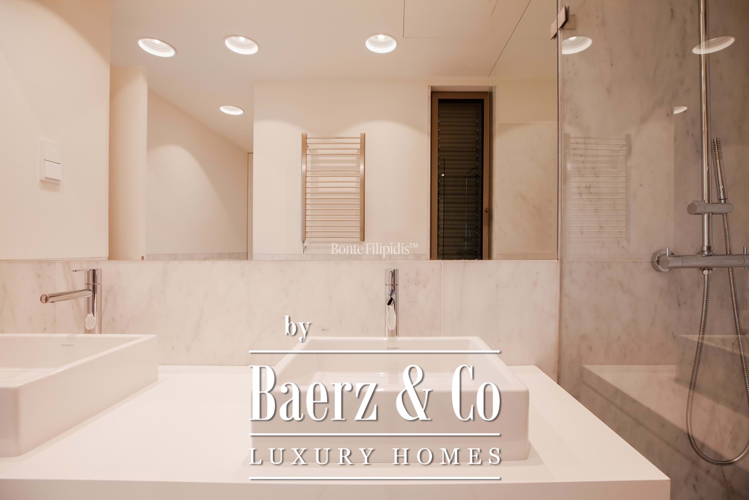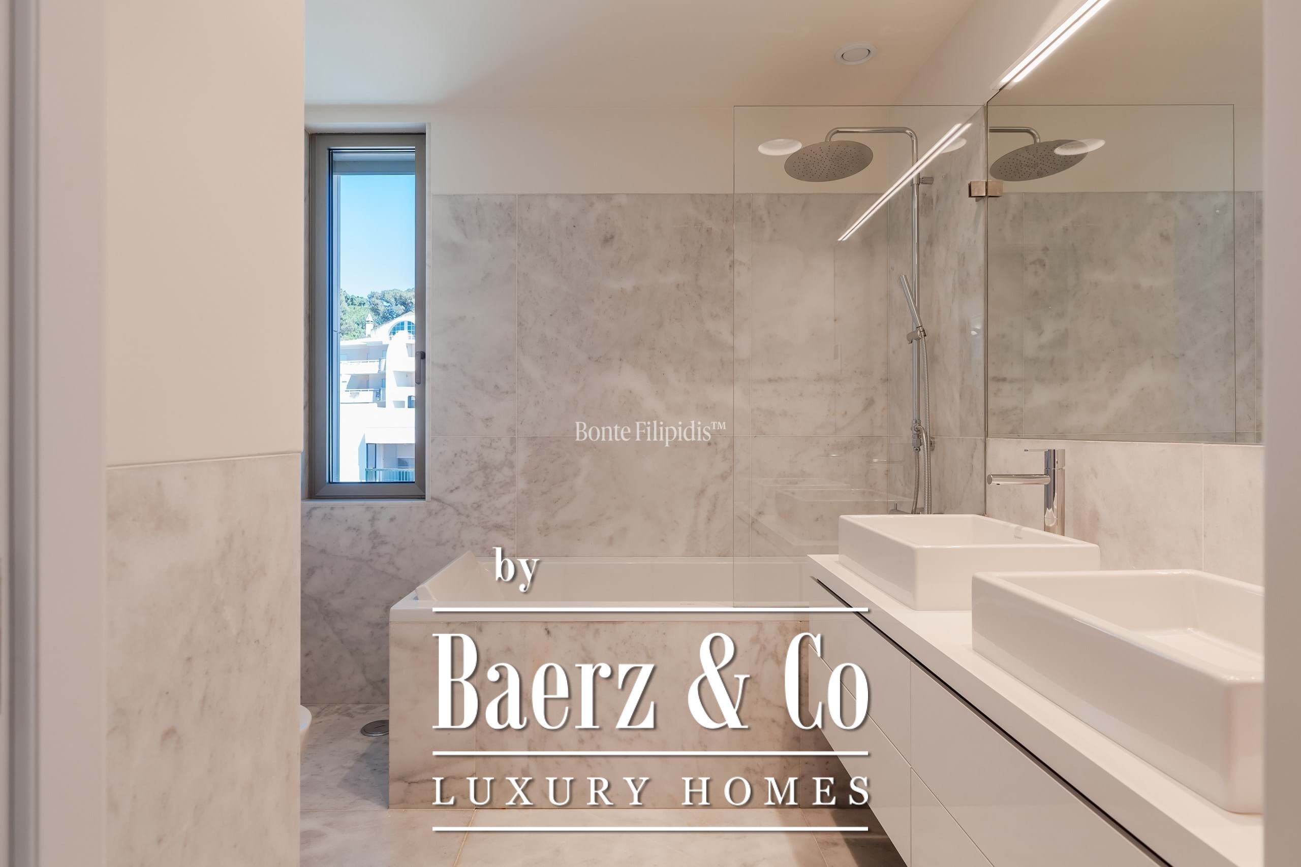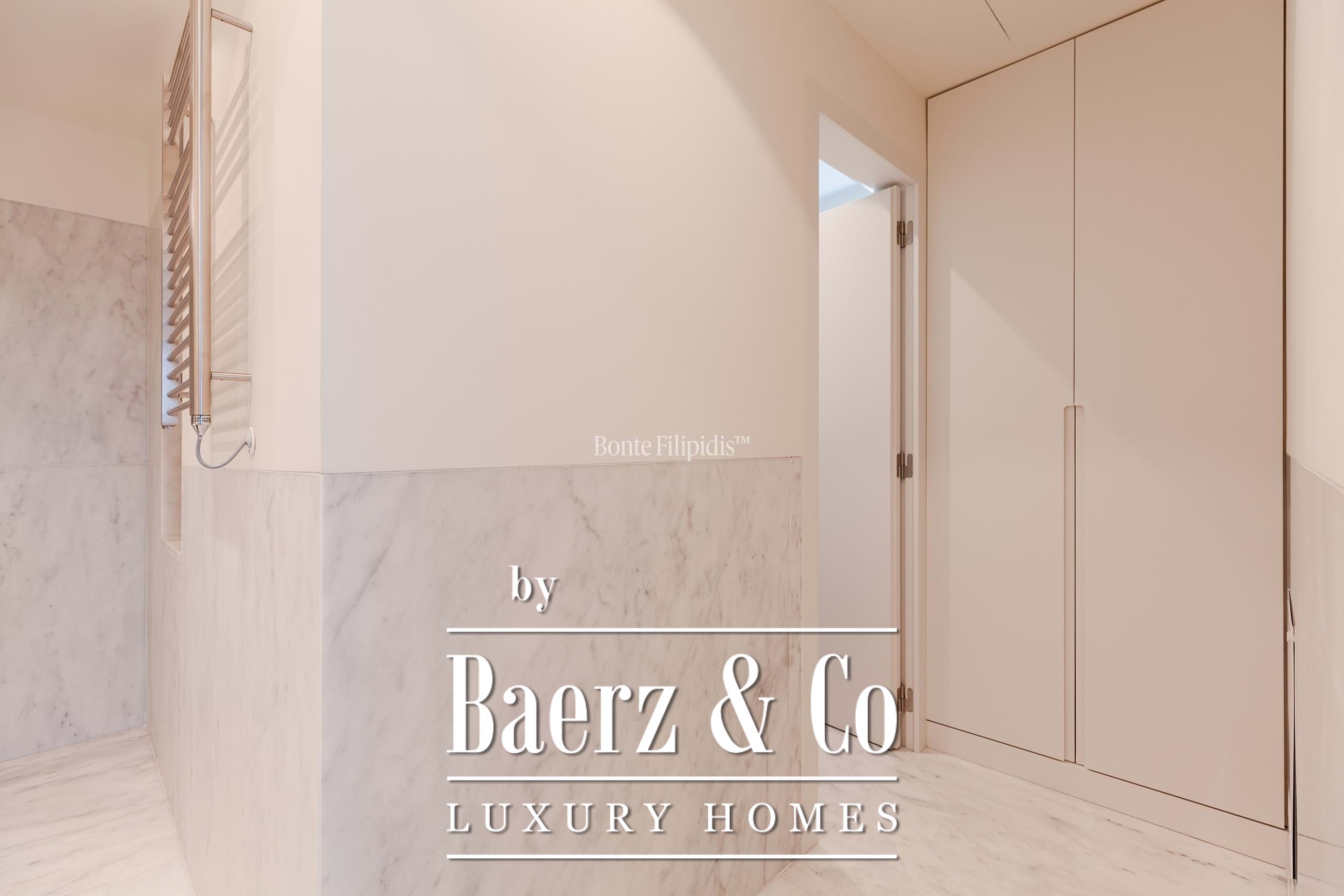 The upper level is devoted to the primary suite, featuring a walk-in closet and exclusive access to a terrace with commanding sea views. Meticulous attention to comfort is clear in the integration of air conditioning and underfloor heating throughout the home, setting a tranquil year-round tone.