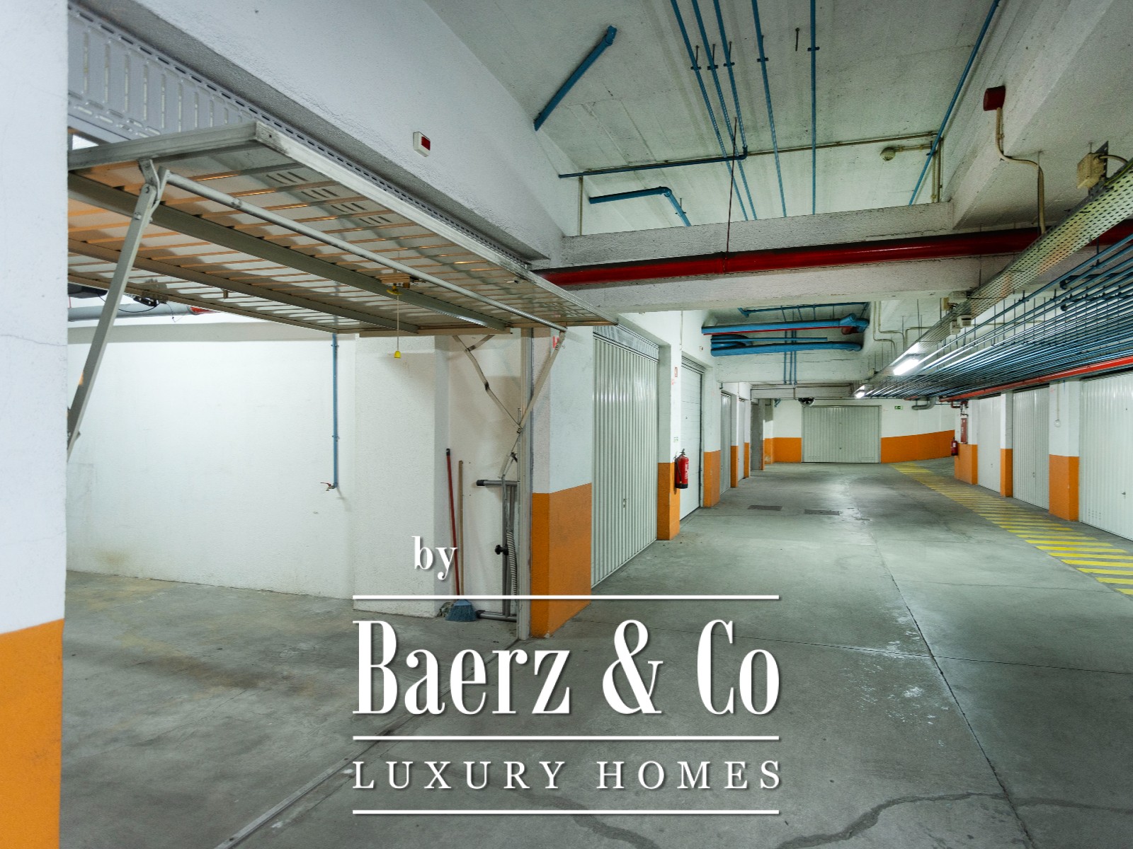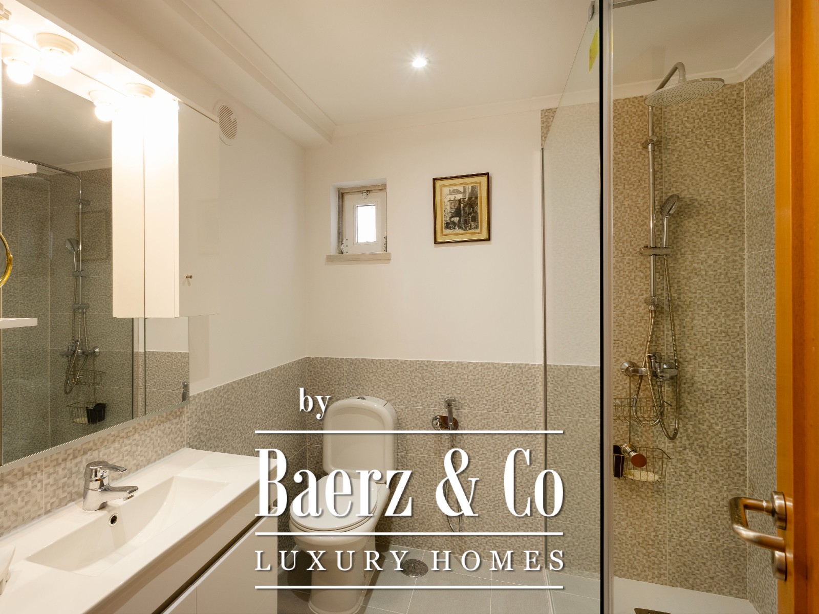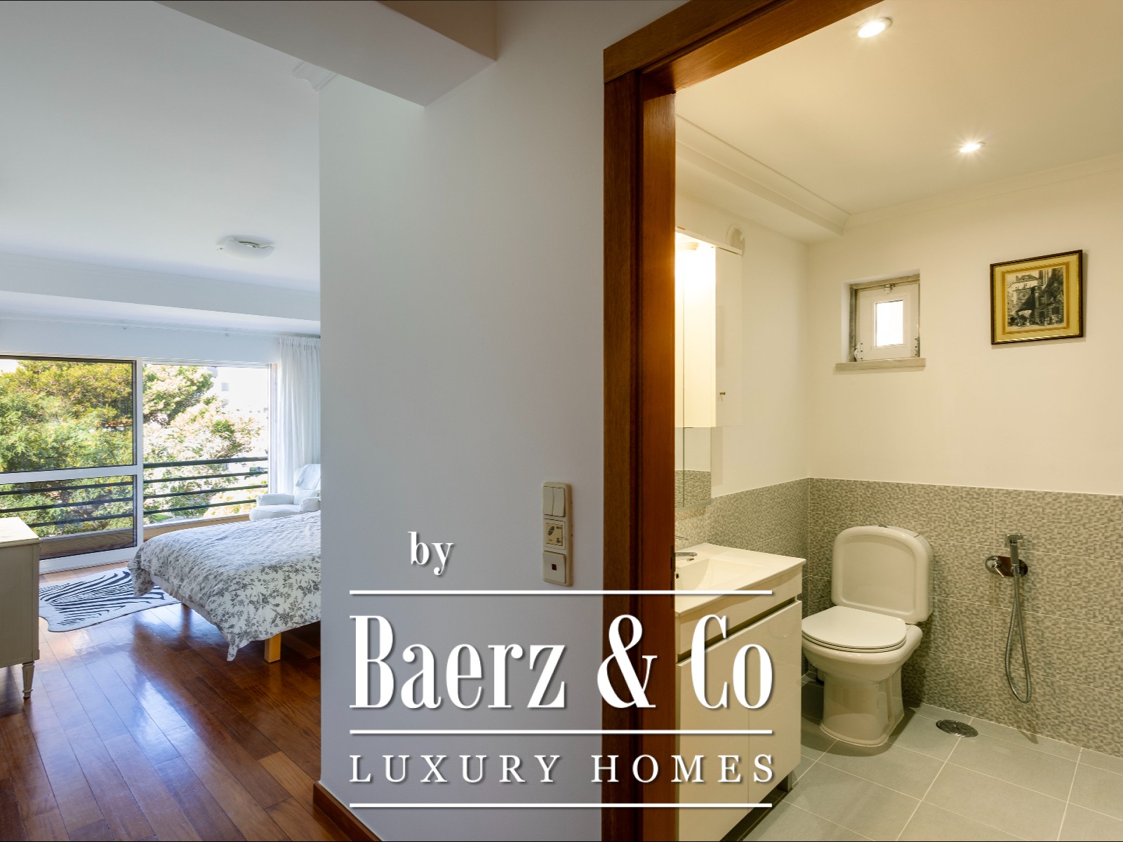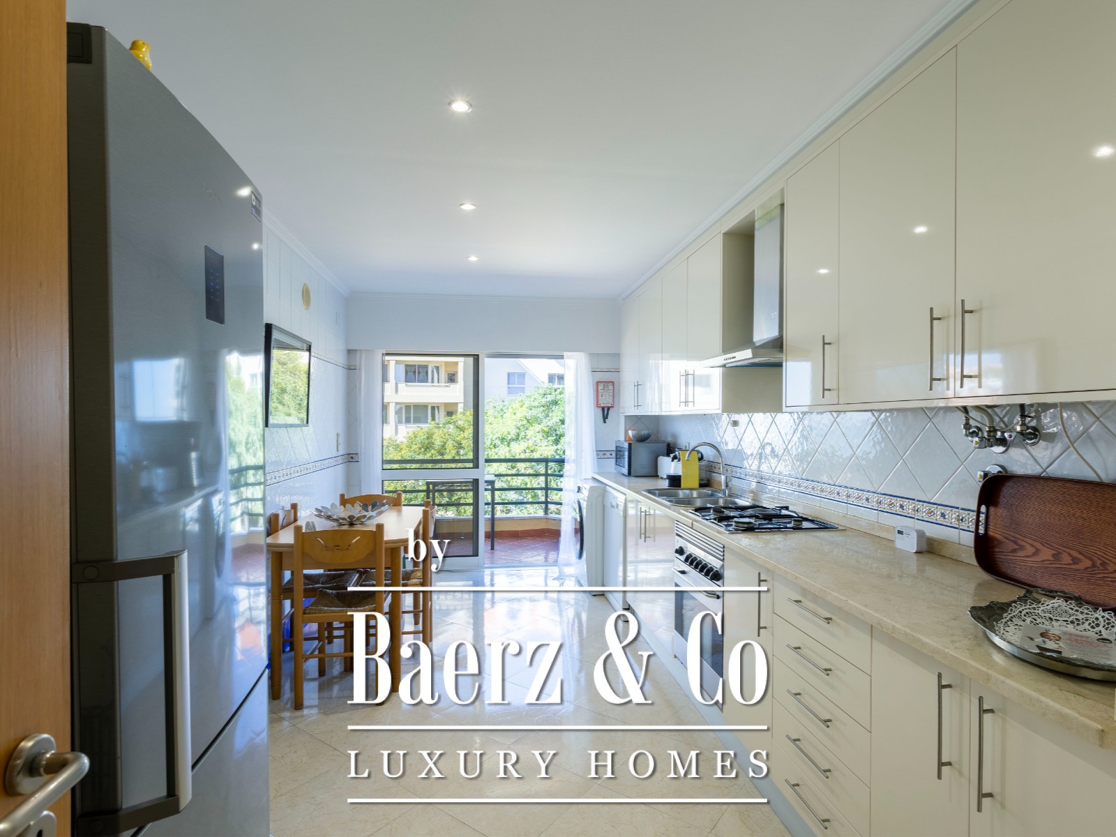 A modern, fully equipped kitchen extends onto a balcony. The home benefits from air conditioning, double glazing, and electric shutters, and is offered fully furnished and equipped. Amenities include a private pool, mature garden, outdoor parking, 24-hour security, lift, garage, and a dedicated storage room. The location brings immediate access to Casa da Guia, Cascais Marina, key cycle routes, and renowned schools such as Salesianos do Estoril and Saint Julian's.