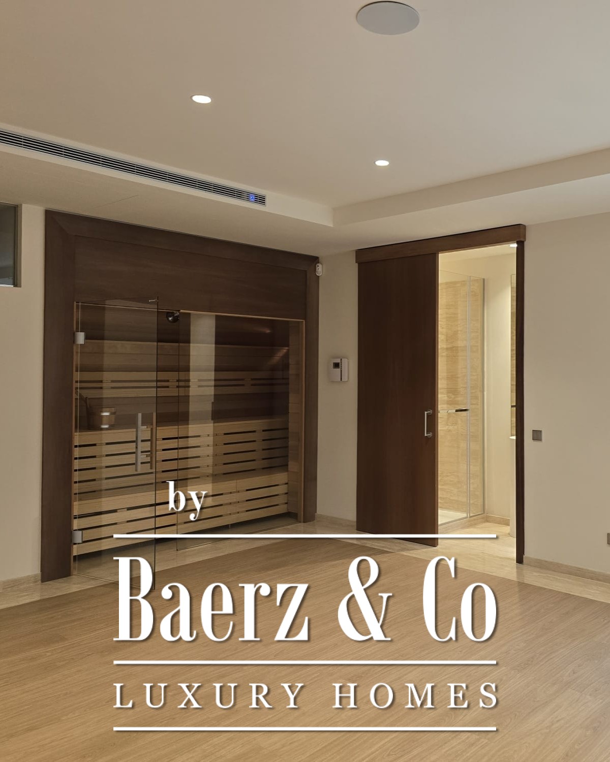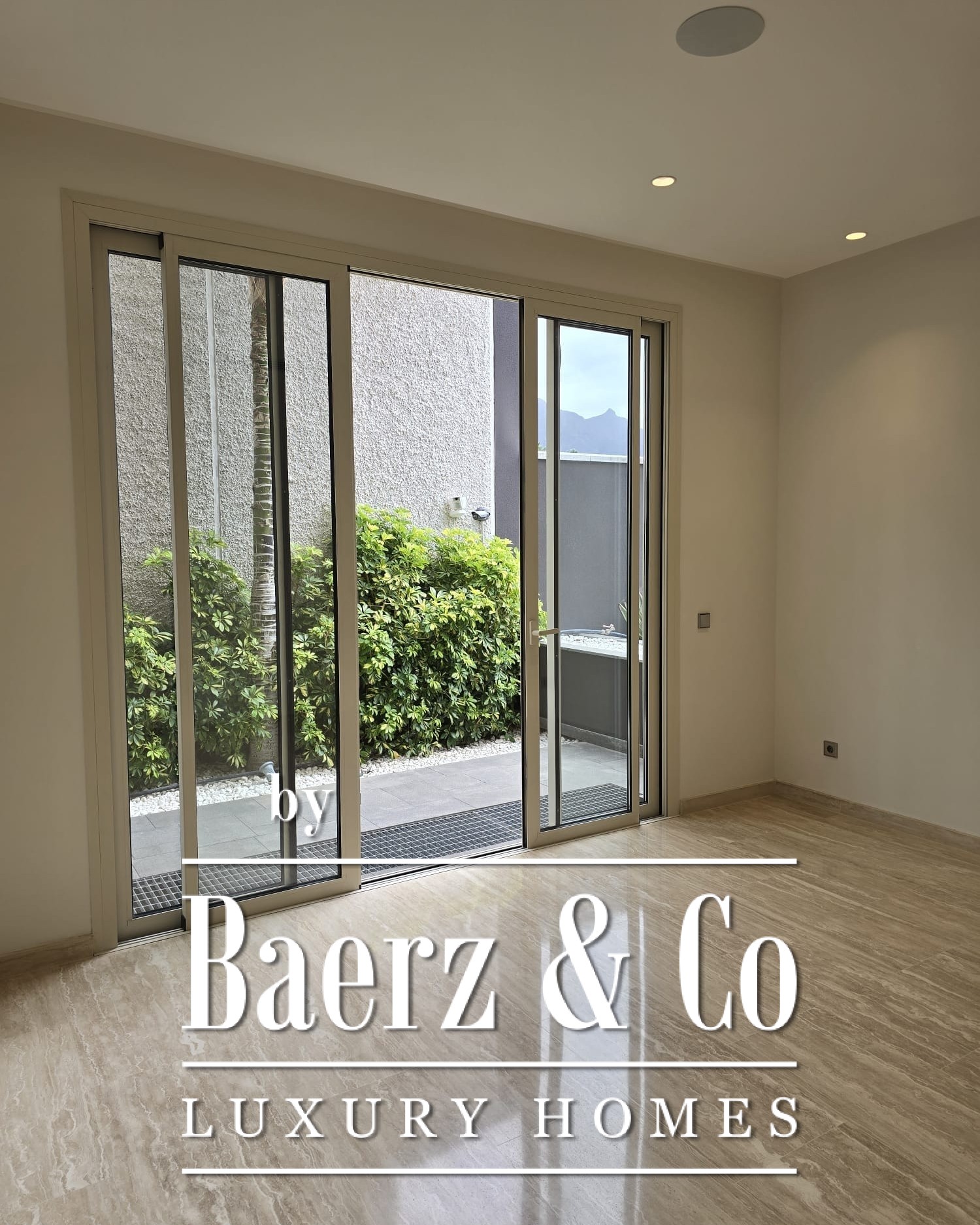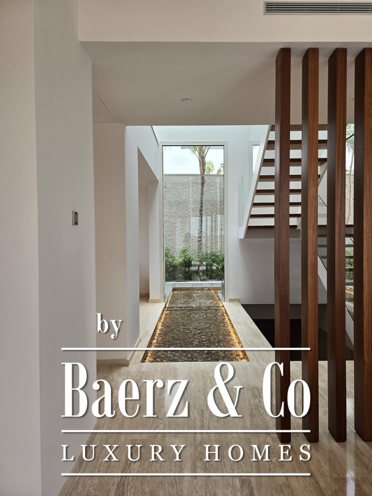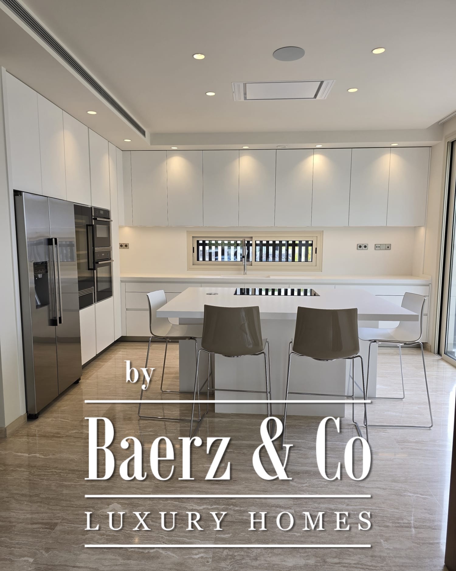 At the heart of the villa is a striking double-height atrium graced by a tranquil water feature and private lift, leading seamlessly into expansive, light-filled living and dining spaces. Floor-to-ceiling glass doors open onto sun-soaked terraces, manicured gardens, and an inviting private swimming pool. The refined kitchen stands out with minimalist cabinetry, a central island, and direct terrace access, creating a cohesive connection to the outdoors.