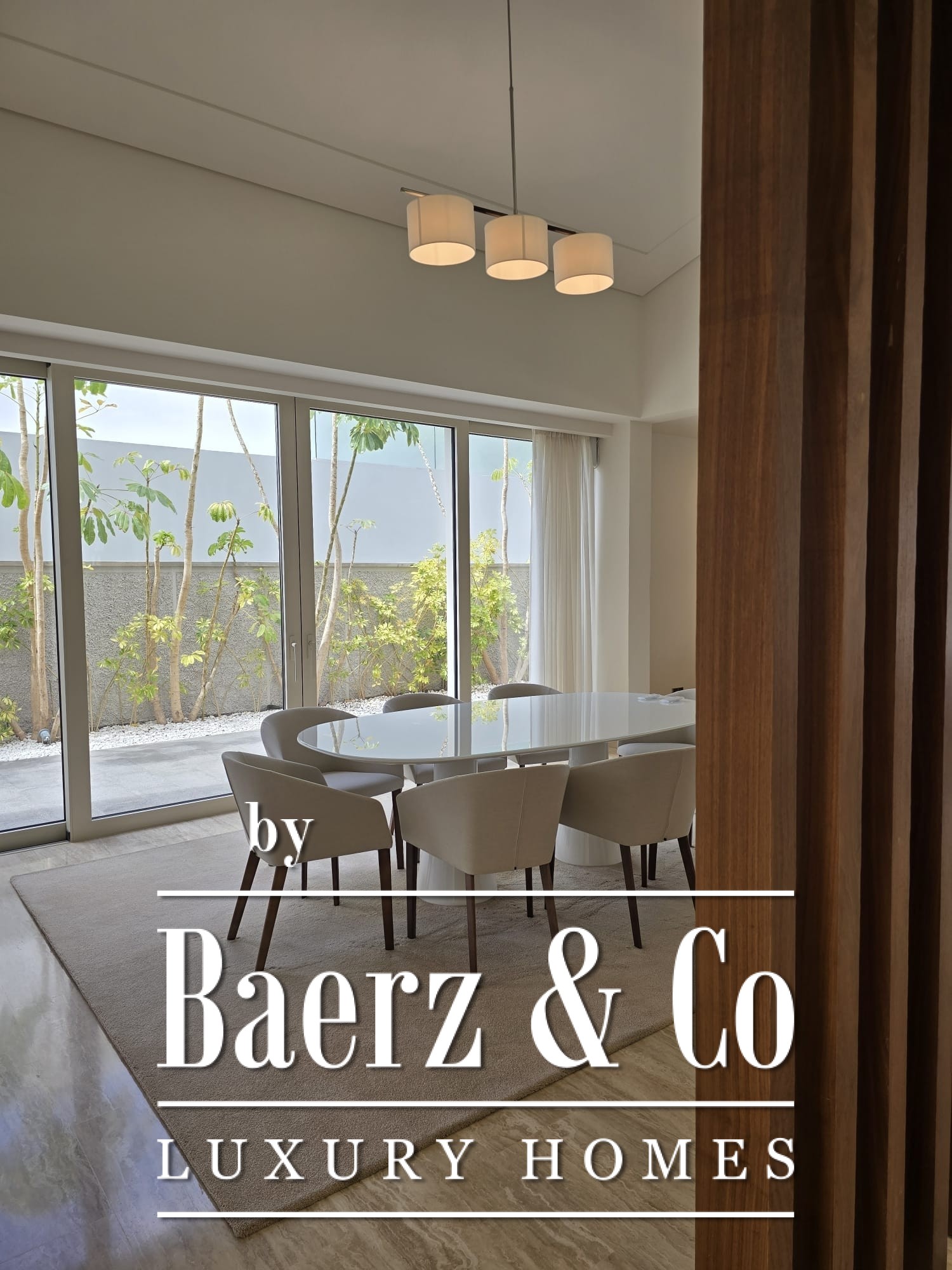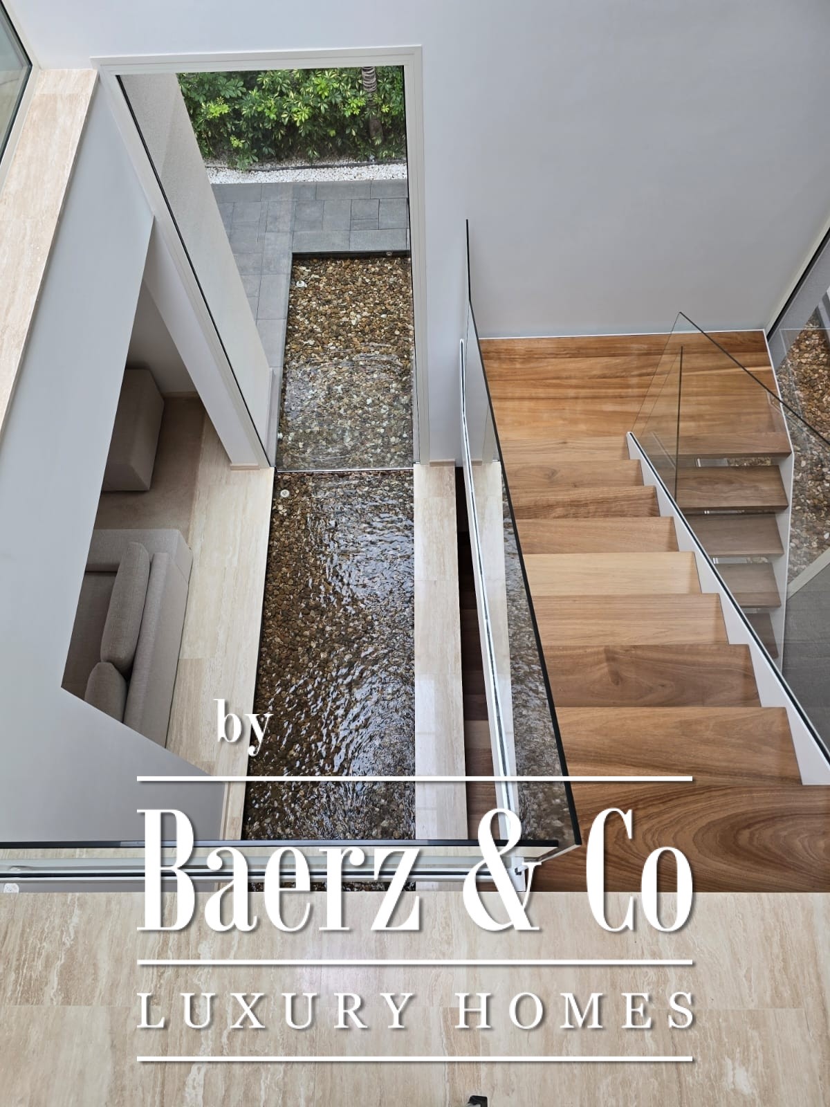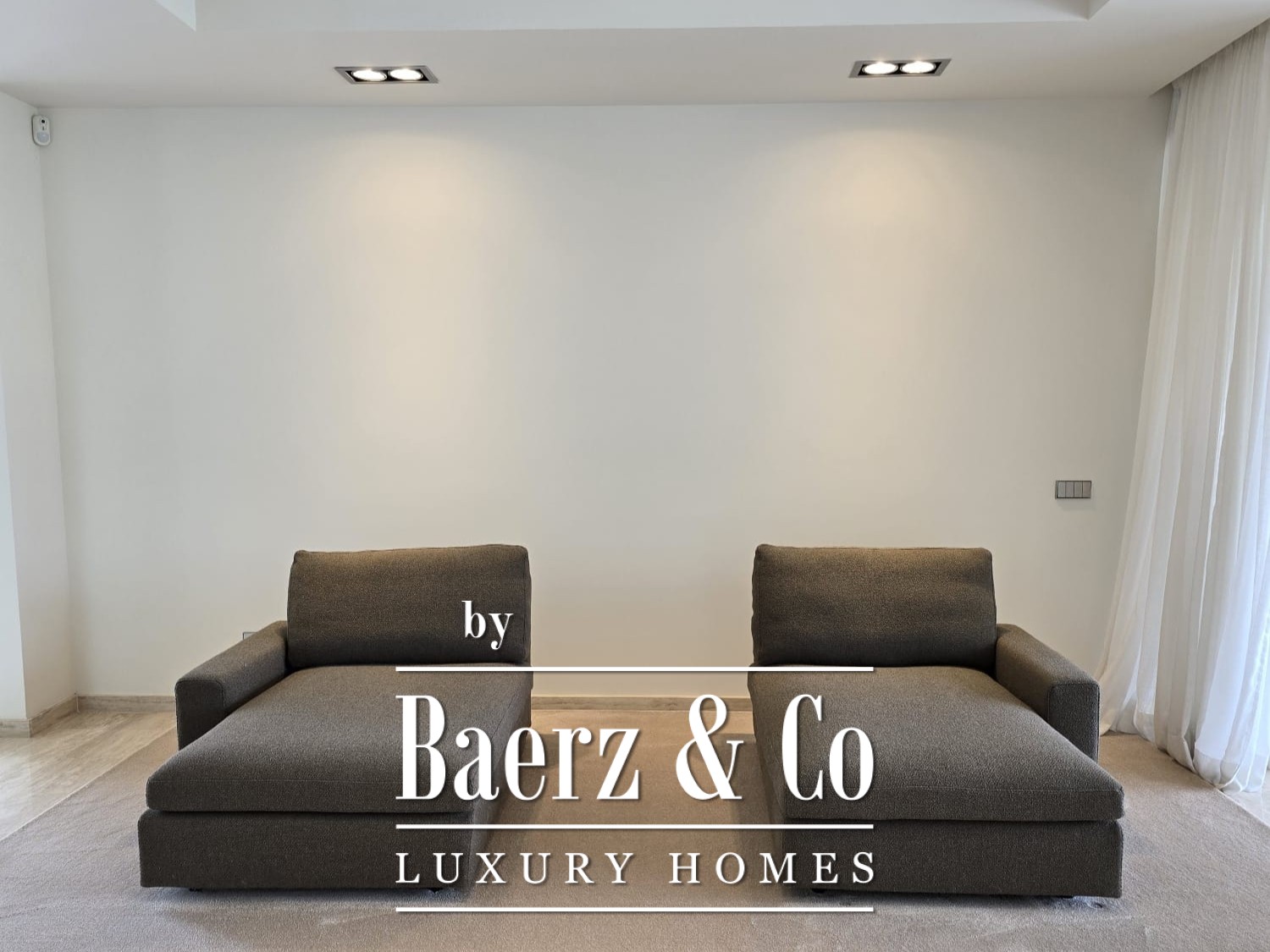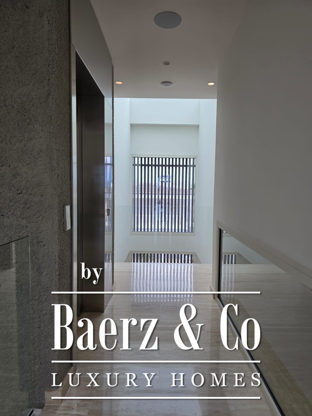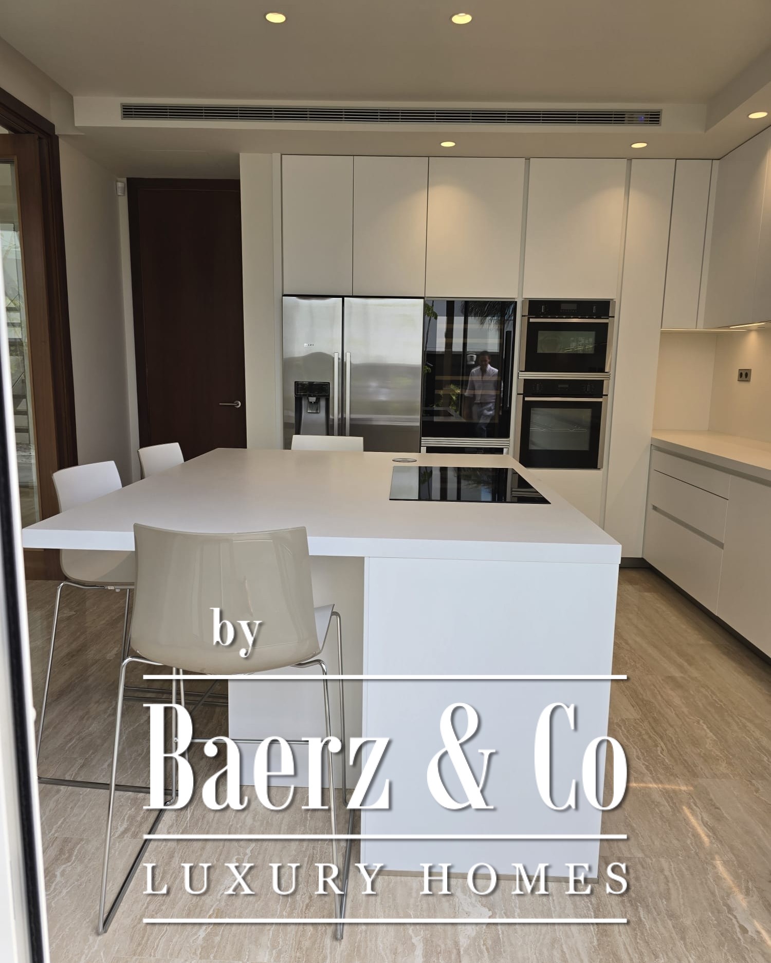 At the heart of the villa is a striking double-height atrium graced by a tranquil water feature and private lift, leading seamlessly into expansive, light-filled living and dining spaces. Floor-to-ceiling glass doors open onto sun-soaked terraces, manicured gardens, and an inviting private swimming pool. The refined kitchen stands out with minimalist cabinetry, a central island, and direct terrace access, creating a cohesive connection to the outdoors.
