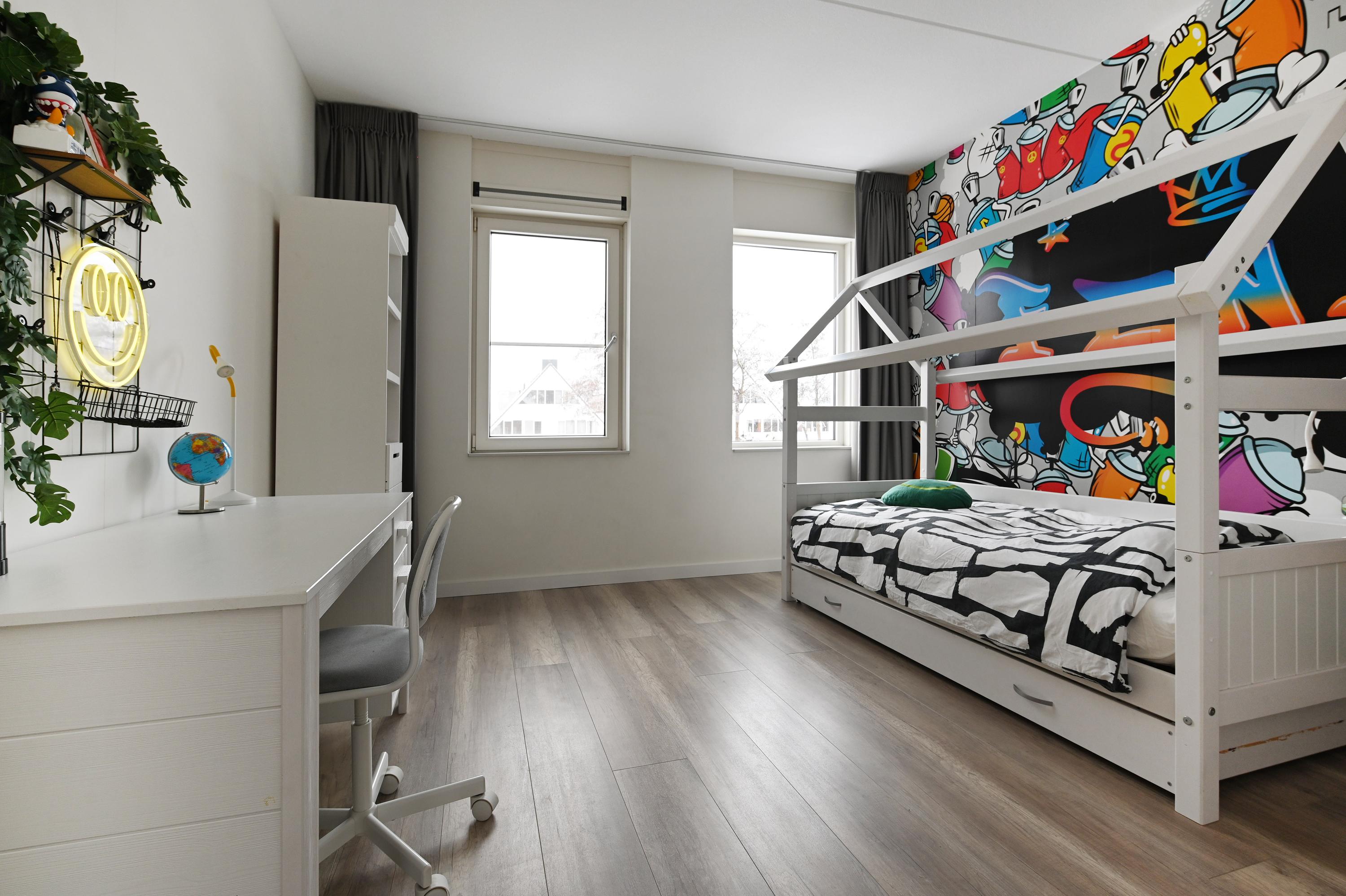 Overloop, twee slaapkamers, waarvan de slaapkamer aan de voorzijde is voorzien van een wastafel en tevens een semi-open ruimte heeft die in gebruik is als praktische berging. Hier bevindt zich tevens de aansluiting voor de wasmachine en de droger. De slaapkamer aan de achterzijde is eveneens heel ruim en deze heeft een extra dakvenster.
