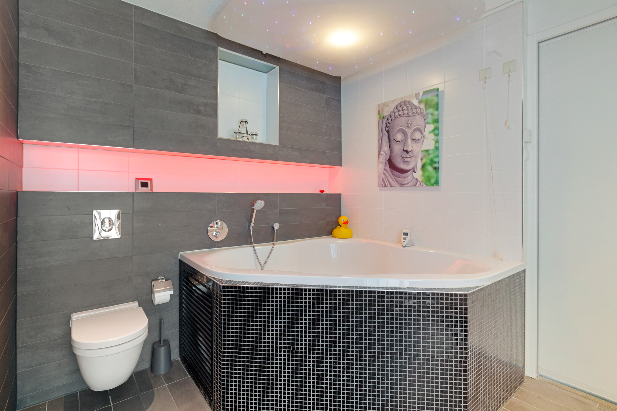 Entrance to the apartment. Spacious hallway providing access to various rooms. Exceptionally large living room with a cozy seating area and a large fireplace/stove. The bright dining area immediately stands out due to the unique ceiling height of no less than 5.50 meters, thanks to the mezzanine! During construction, this height was deliberately created to allow for the installation of a striking chandelier. The dining area provides access to a lovely sunroom on the terrace and to the open kitchen. The kitchen is modern, offers ample cupboard space, and is equipped with luxurious built-in appliances, including a fridge, freezer, microwave, oven, induction cooktop, extractor hood, dishwasher, and Quooker. The master bedroom is located on the northeast side of the apartment and is beautifully furnished with ample built-in wardrobes. From this bedroom, you can access a luxurious and spacious bathroom equipped with a walk-in shower, (whirlpool) bath with star ceiling, sauna, toilet, and a vanity unit – a wonderful space to fully unwind.