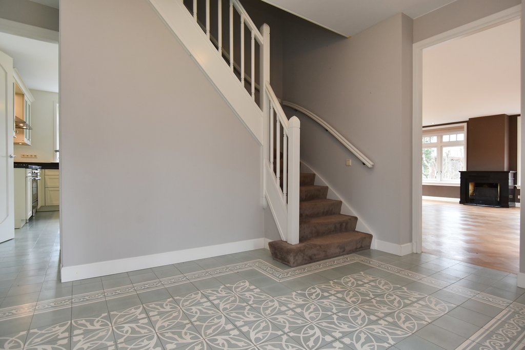 Entrance with wardrobe and meter cupboard. Spacious hallway with access to the study (3.80 x 3.40 m). Guest toilet. Living room with elegant herringbone parquet flooring and fireplace. Multiple French doors provide access to the surrounding garden. Large open-plan Siematic kitchen (4.18 x 5.30 m) equipped with an American-style fridge/freezer, 6-burner gas hob with oven, extractor hood, dishwasher, and a separate combi microwave/oven. Utility room with washing machine and dryer connections. Sunny, generous terrace (6.05 x 6.22 m).