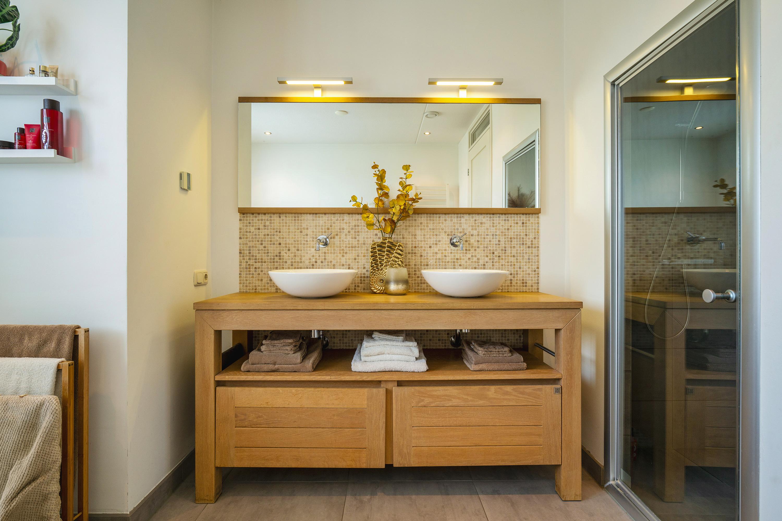 Landing with access to 2 bedrooms, one of which is a very spacious (master) bedroom at the rear with French balconies and a view of the water. The bathroom is luxuriously finished and equipped with a freestanding bathtub, a spacious double shower with steam cabin function, and an oak vanity with double sinks. Opposite the bathroom is a spacious walk-in closet.