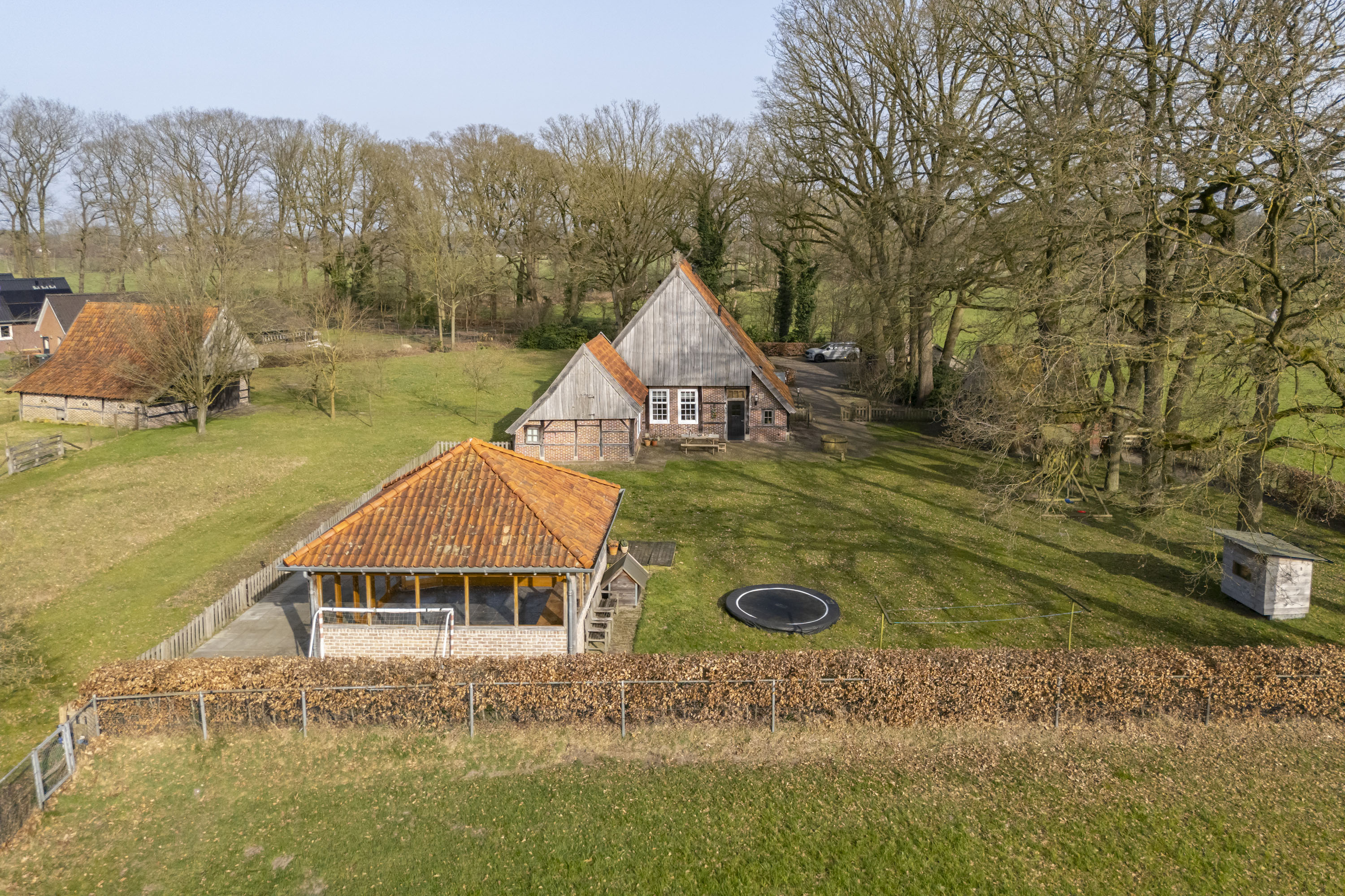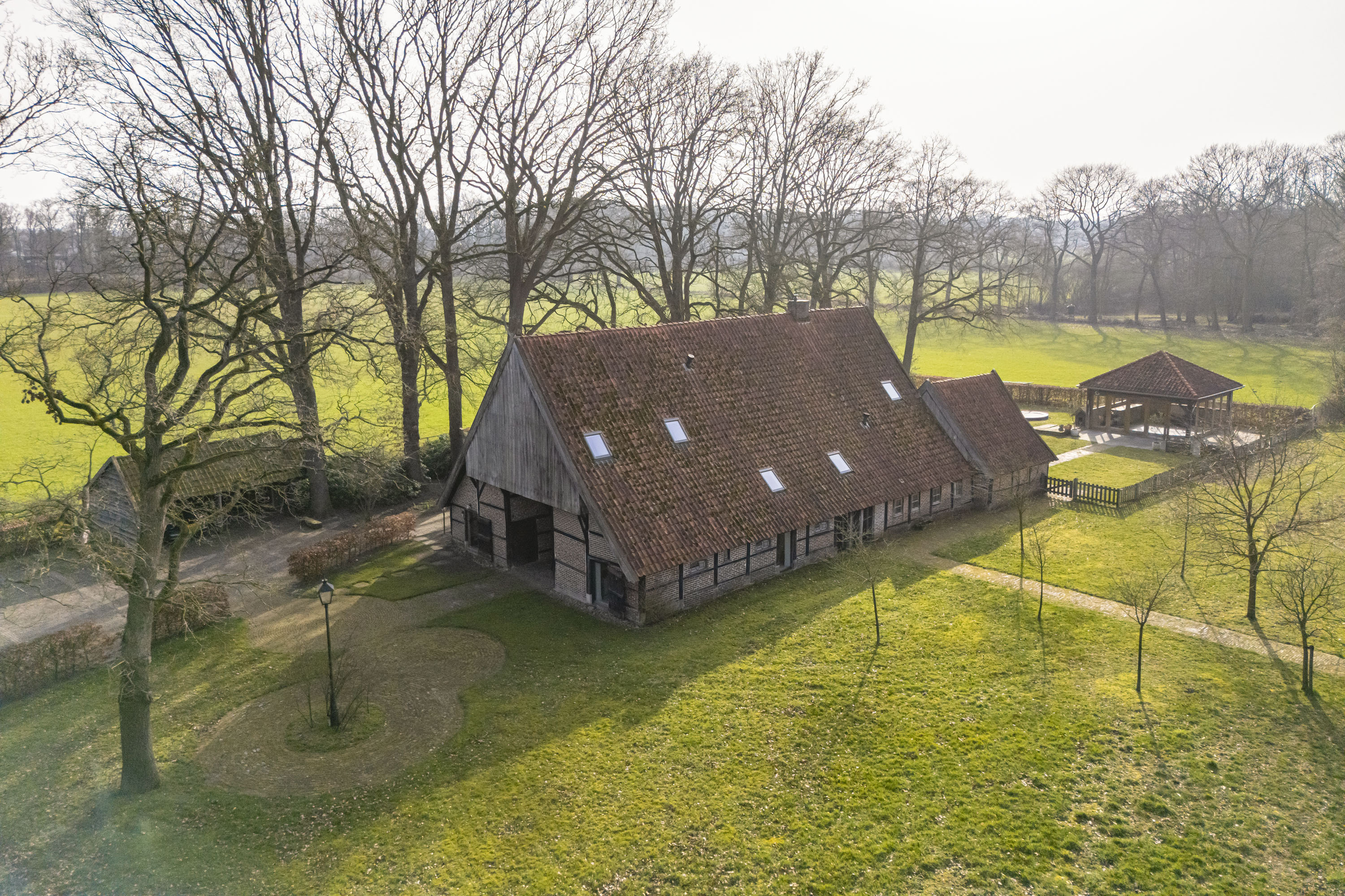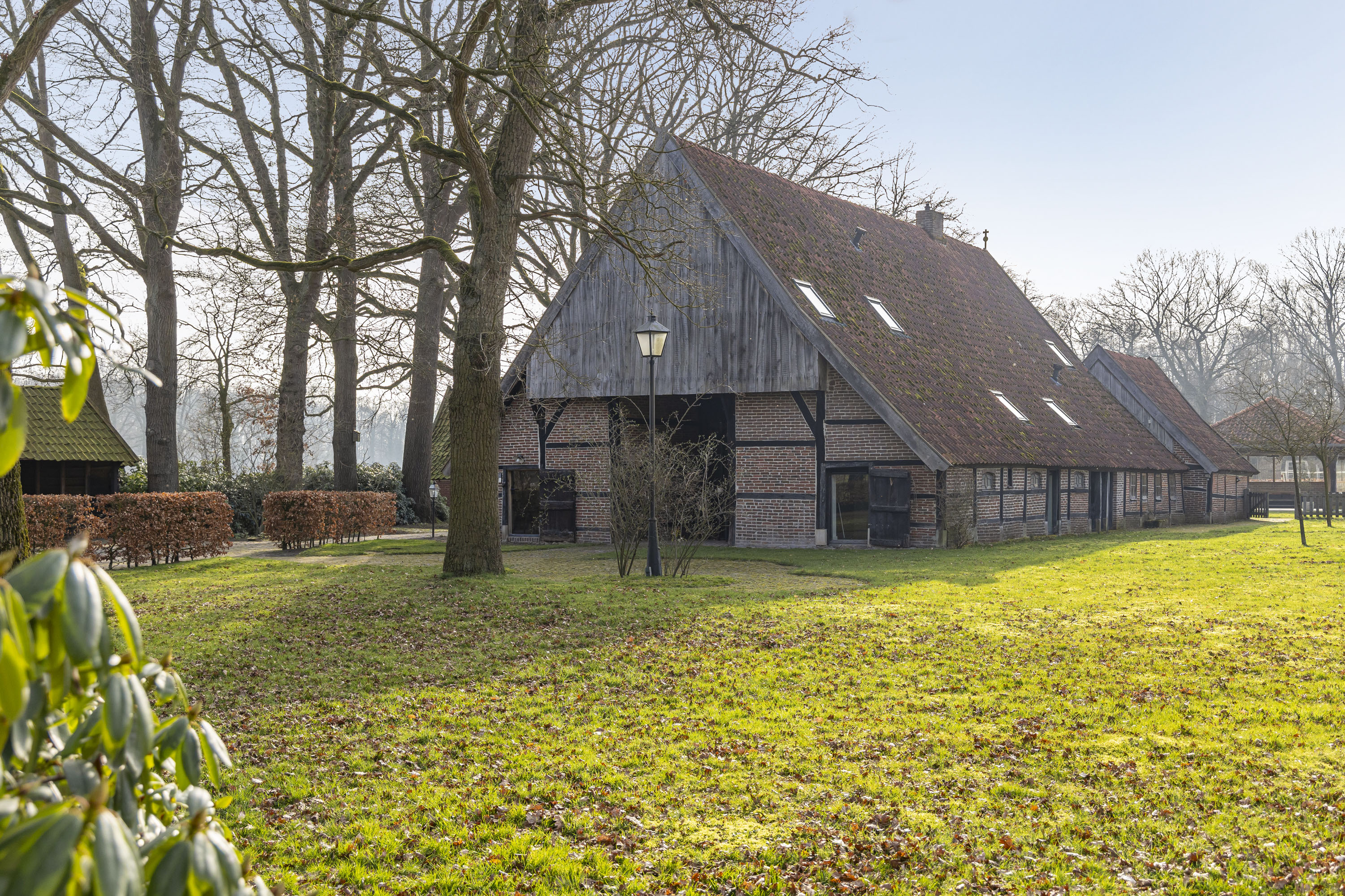 Rural living at its finest in the countryside of Denekamp. This characteristic, monumental and fully renovated farmhouse with several outbuildings is beautifully tucked away in the lush landscape of northeast Twente. The authentic appearance of the Saxon-style farmstead—with its robust half-timbered façades, refined window mullions, nostalgic outbuildings, majestic oak trees and driveways and terraces paved with traditional baked bricks—creates an exceptionally charming and rustic atmosphere.