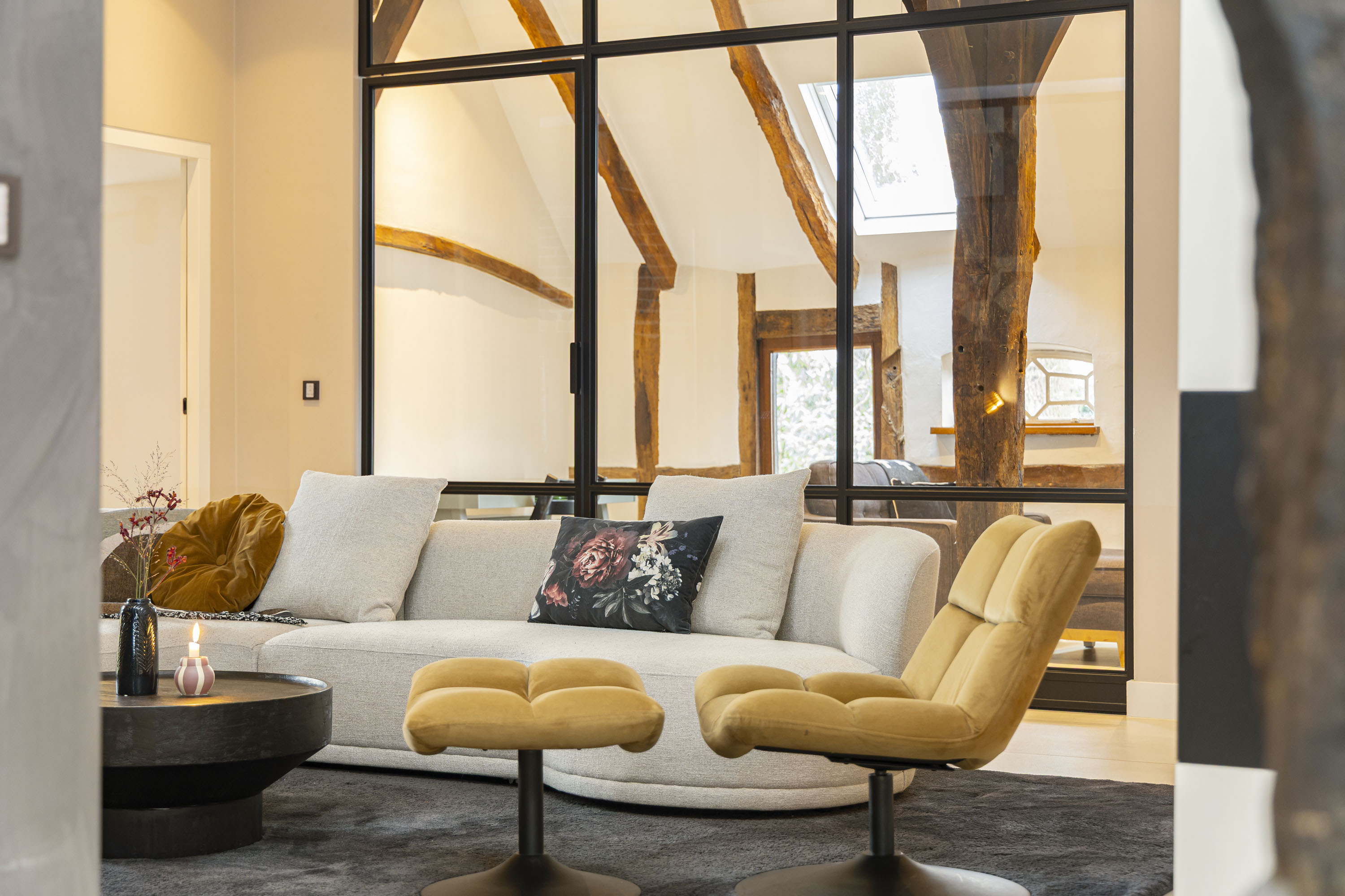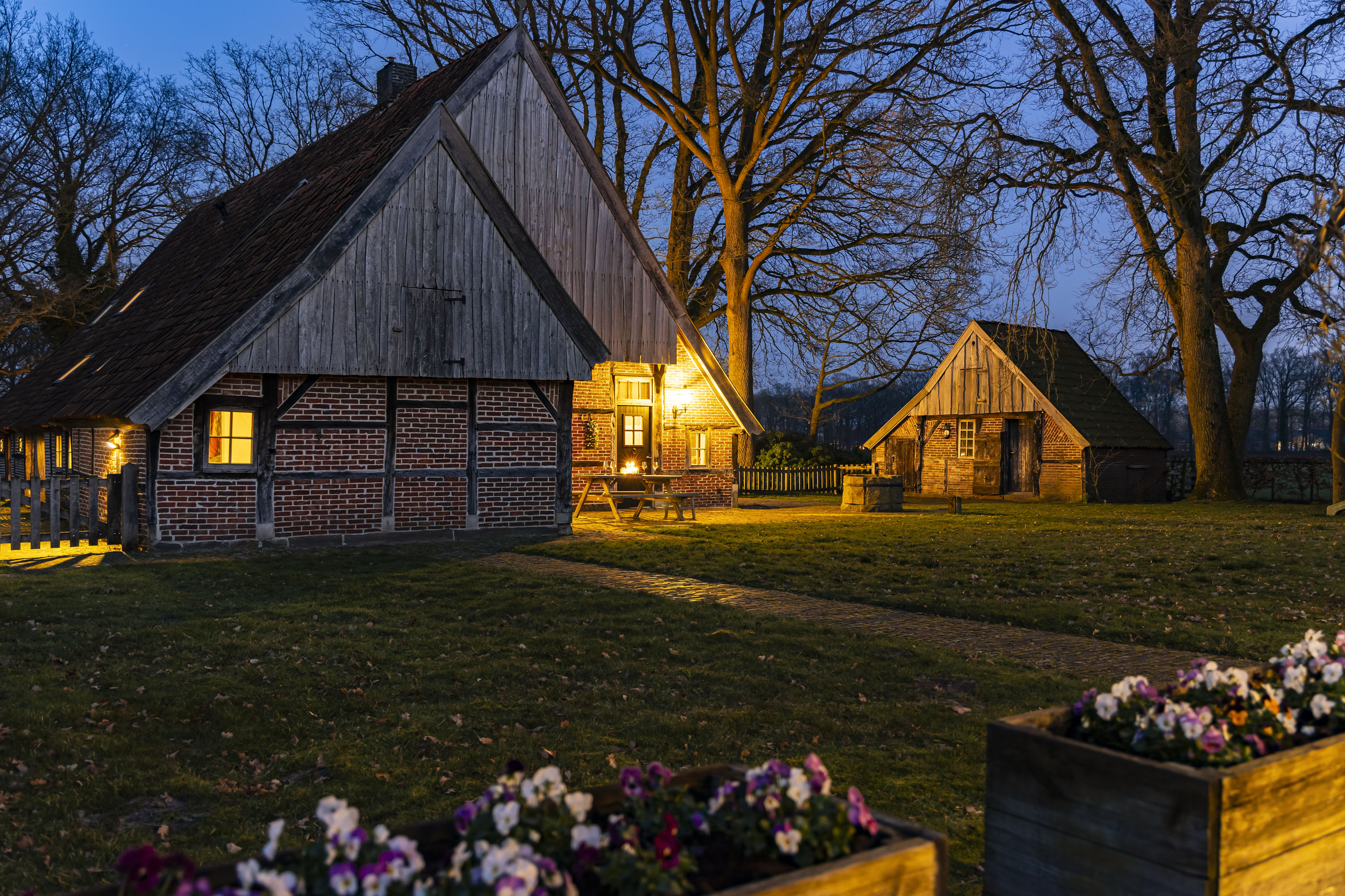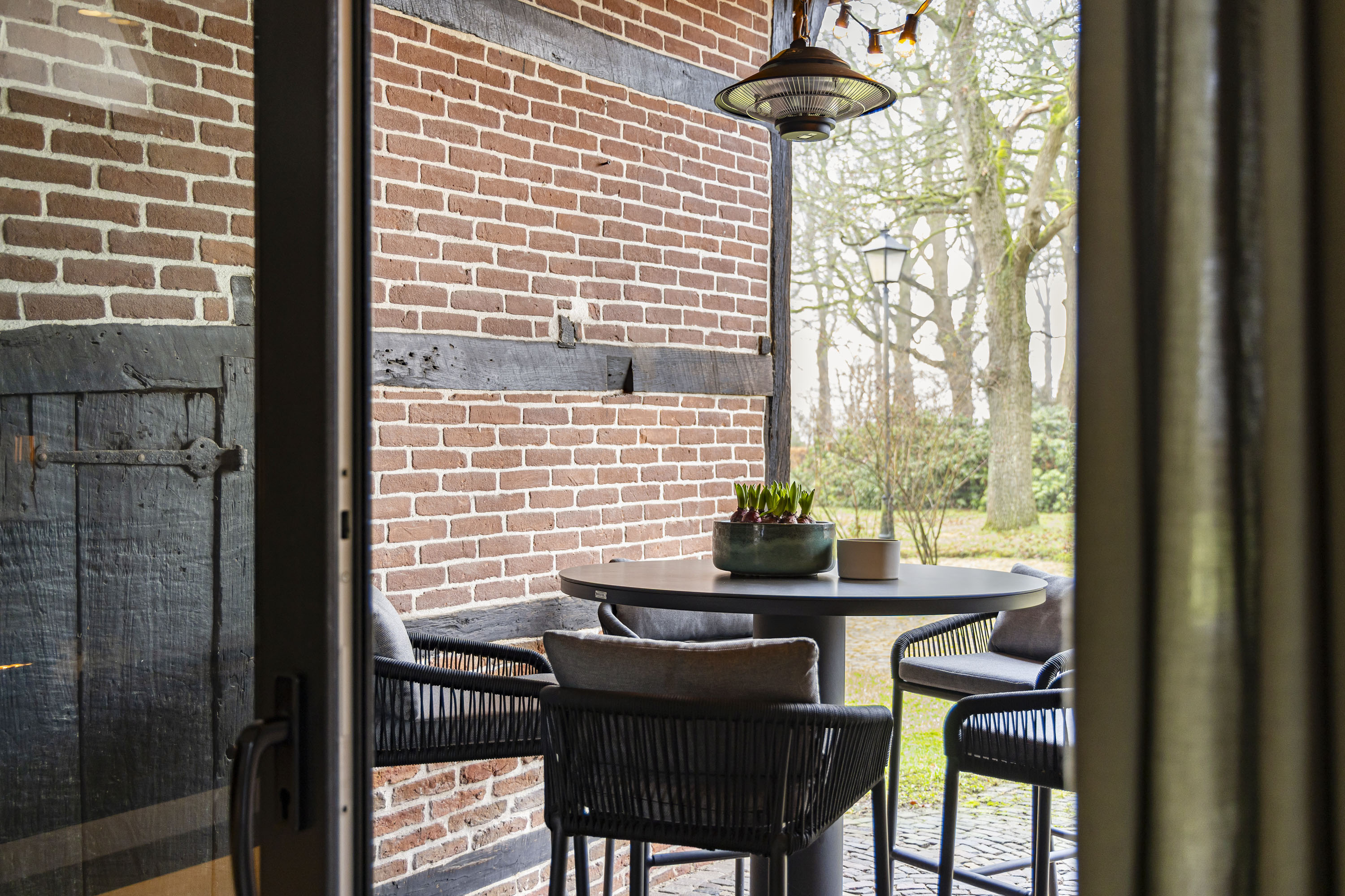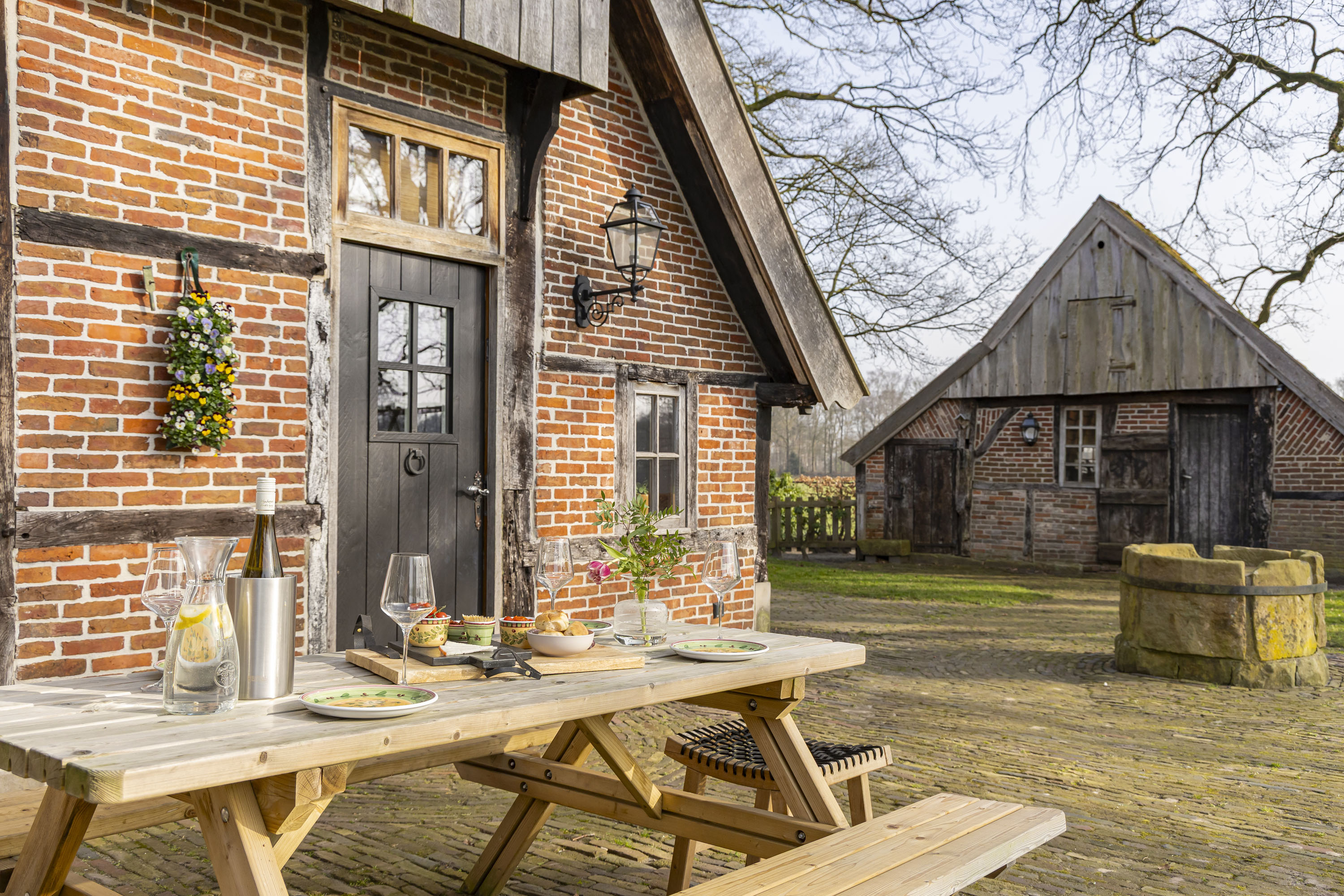 Rural living at its finest in the countryside of Denekamp. This characteristic, monumental and fully renovated farmhouse with several outbuildings is beautifully tucked away in the lush landscape of northeast Twente. The authentic appearance of the Saxon-style farmstead—with its robust half-timbered façades, refined window mullions, nostalgic outbuildings, majestic oak trees and driveways and terraces paved with traditional baked bricks—creates an exceptionally charming and rustic atmosphere.