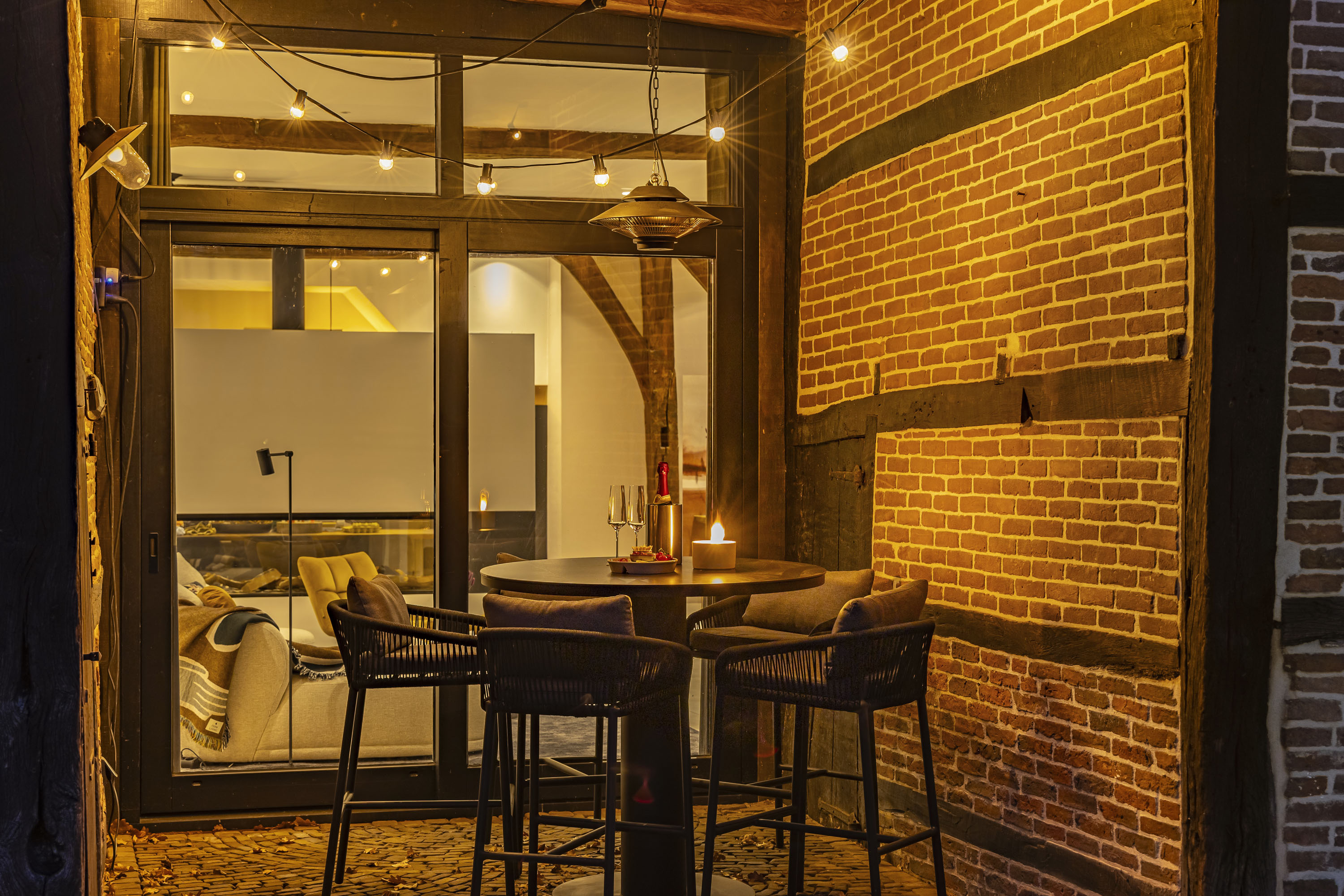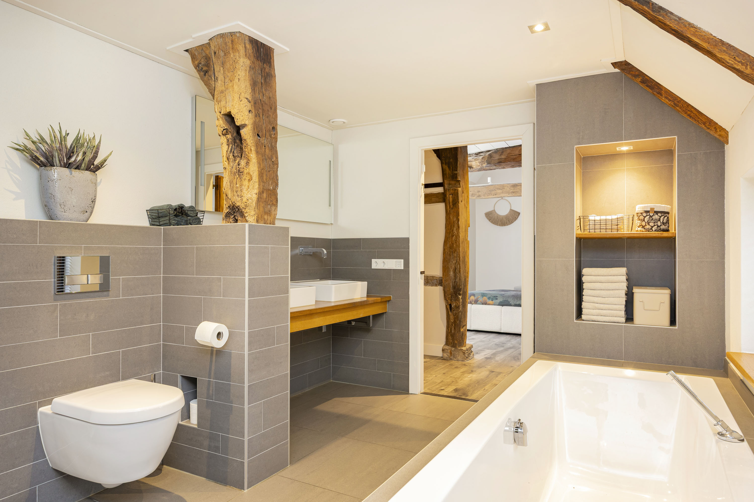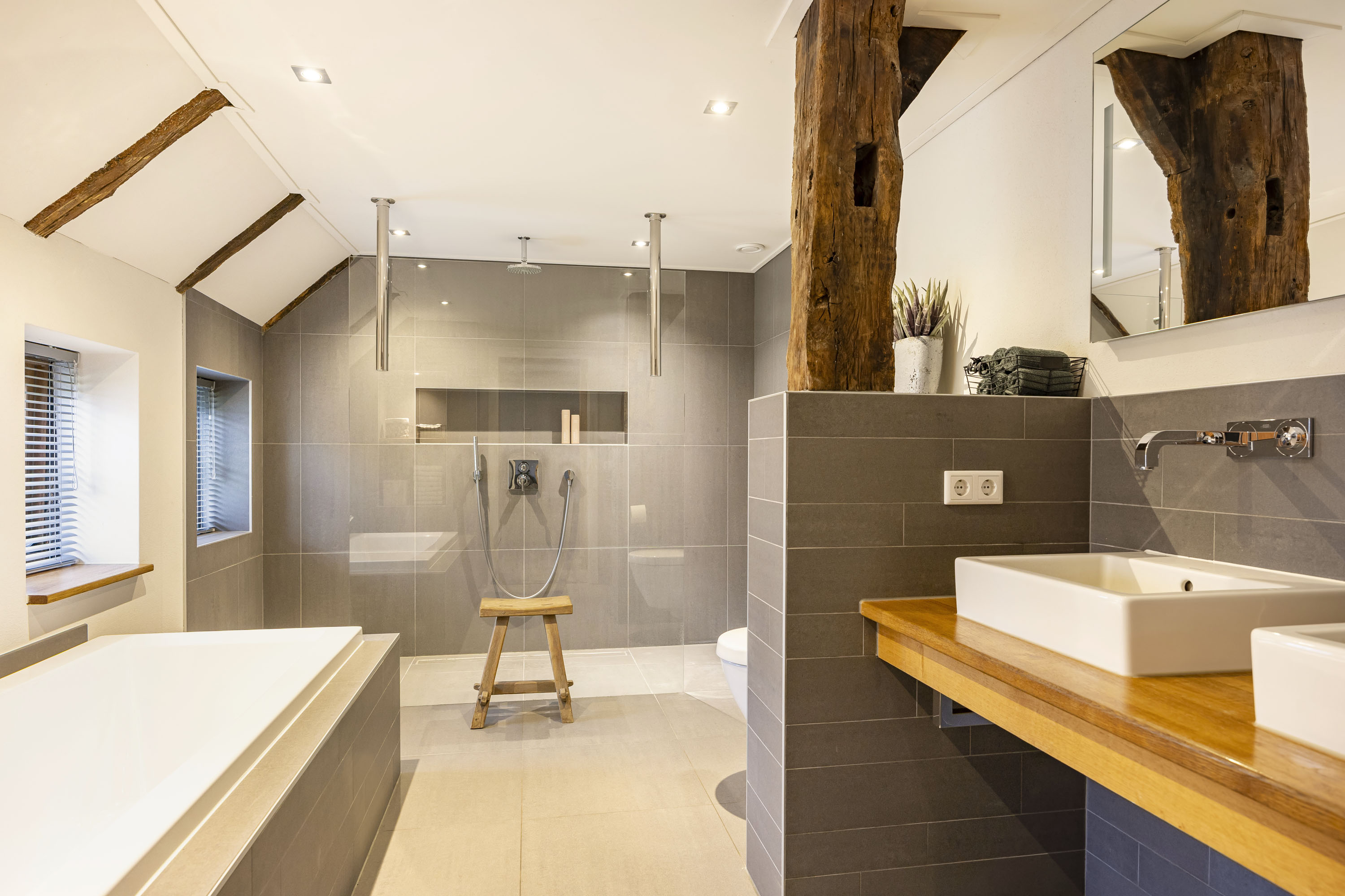 The ground floor includes a spacious modern kitchen, a living room divided into a dining and sitting area by a gas fireplace, a children’s play corner, a fitness room, a utility room, several storage rooms and—last but not least—a beautiful bedroom with a luxurious ensuite bathroom. At the front of the farmhouse, you will find the traditional “onderschoer”, a small covered and intimate terrace.