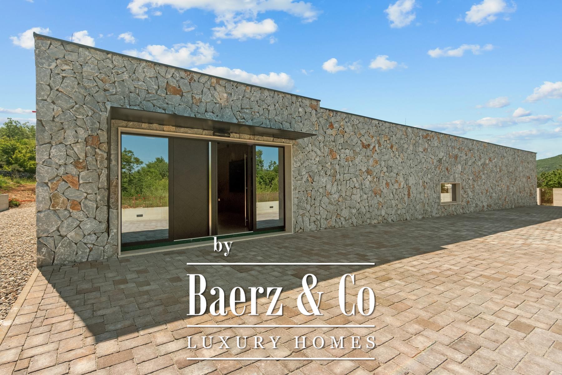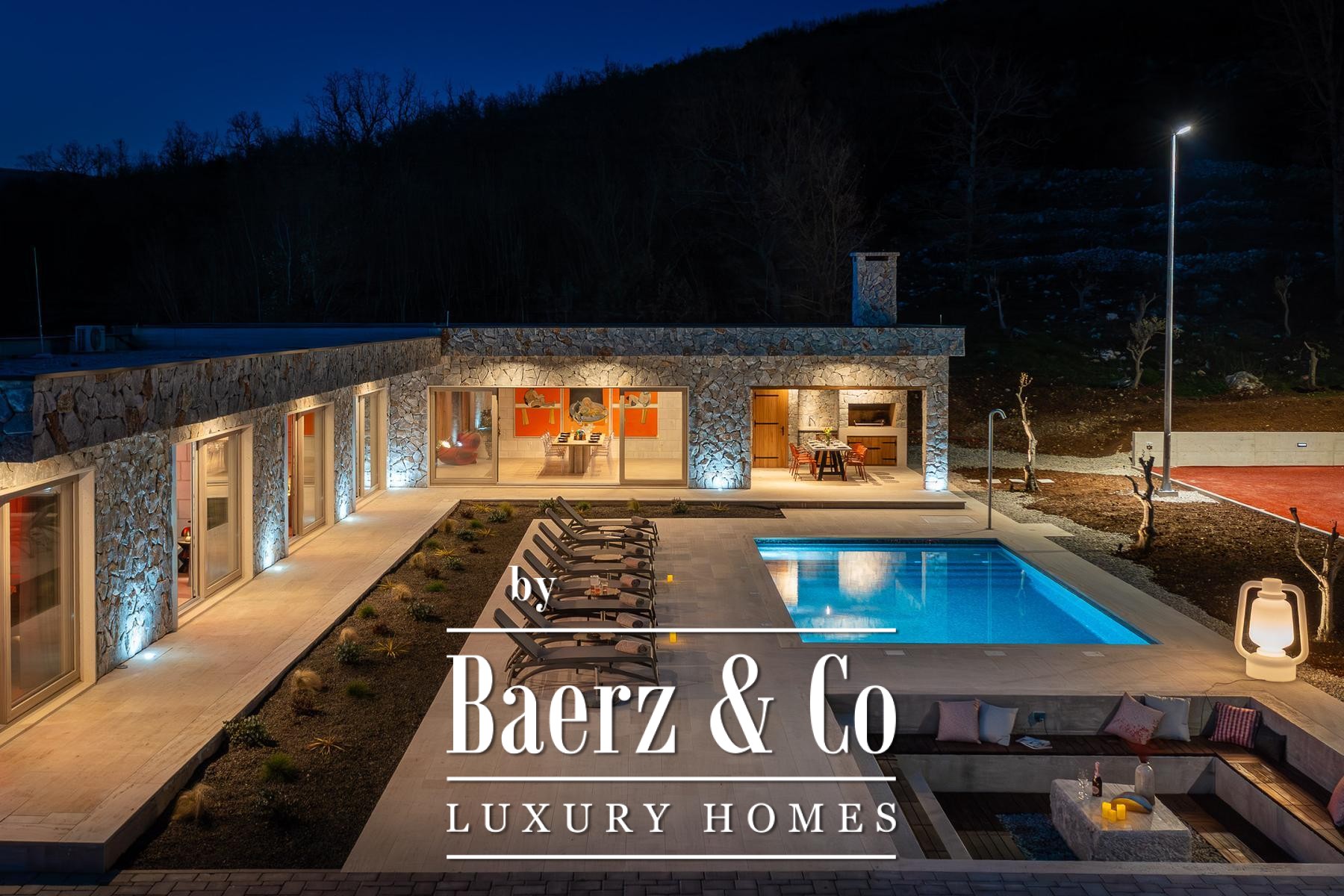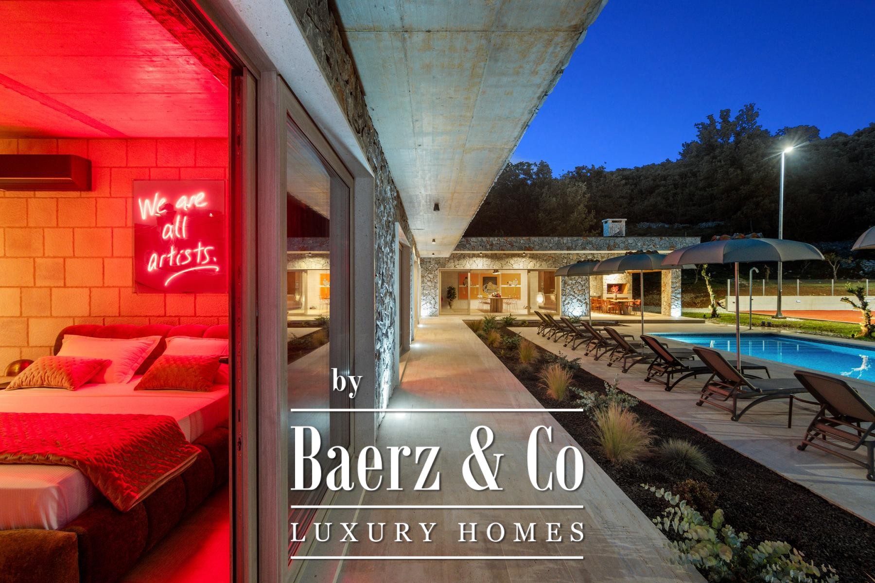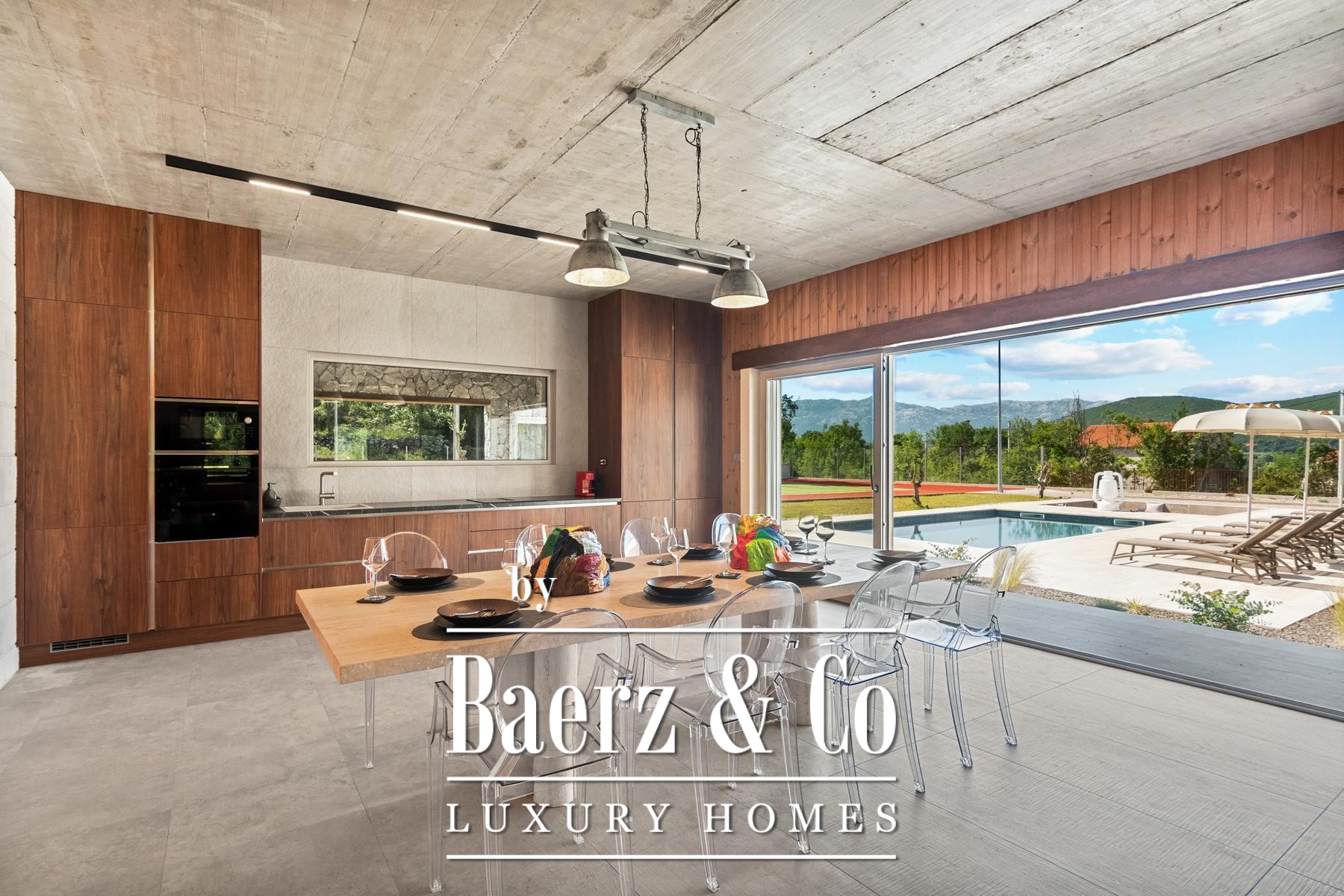 In the vicinity of Split, there is this completely different newly built villa with a swimming pool and tennis court. It is located on a plot of 2130 m2, on the very edge of the green zone, surrounded by peace and beautiful nature.It is a single-storey house with an excellently designed living space, which extends to 240 m2.The living area (living room, kitchen, dining room) of 70 m2 is maximally opened with excellent sliding walls (Gelan), and has a view of the summer kitchen, tennis court and swimming pool.The furniture throughout the building is custom-made with designer pieces (armchairs, paintings, ...).The walls are decorated with natural materials (stone, wooden panels), while the dining table is entirely