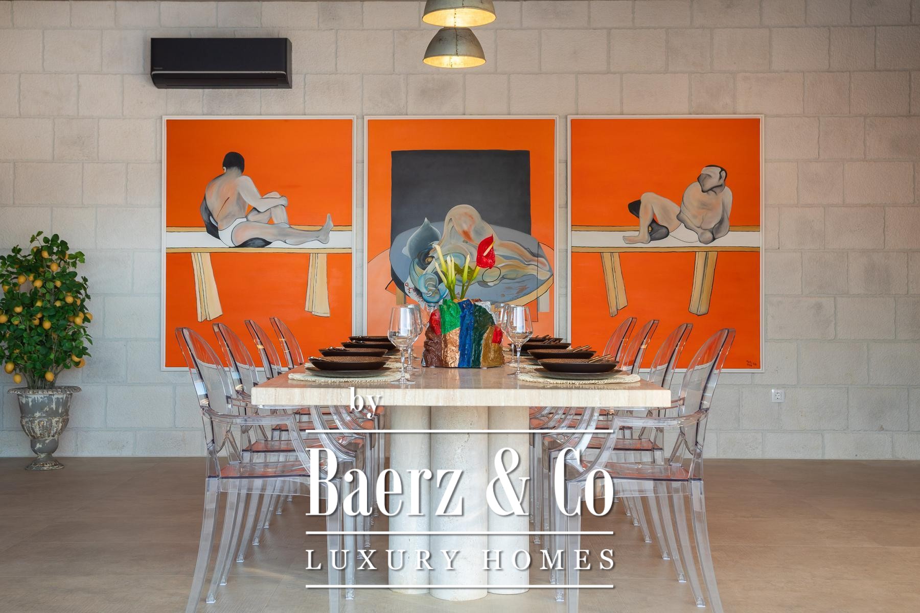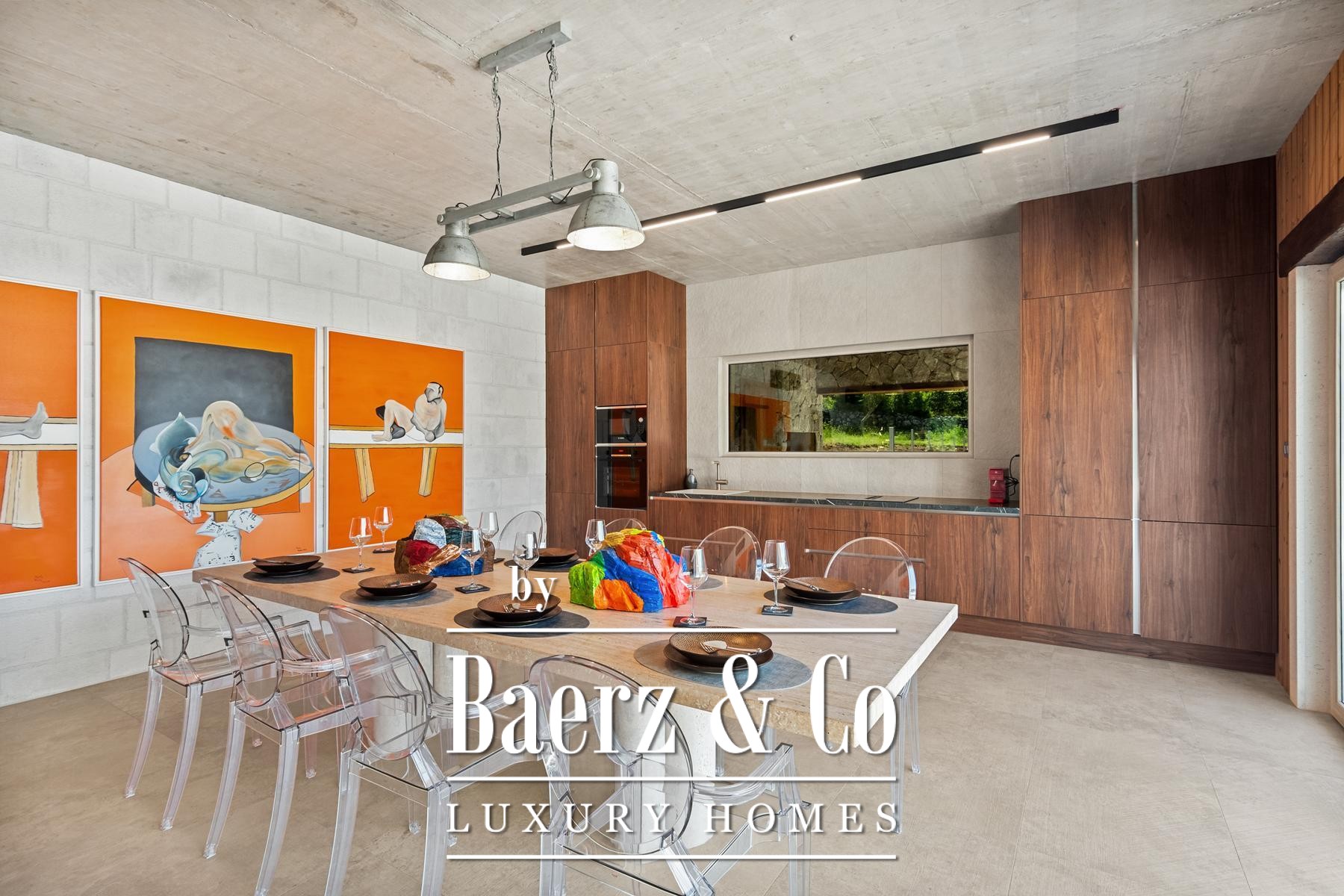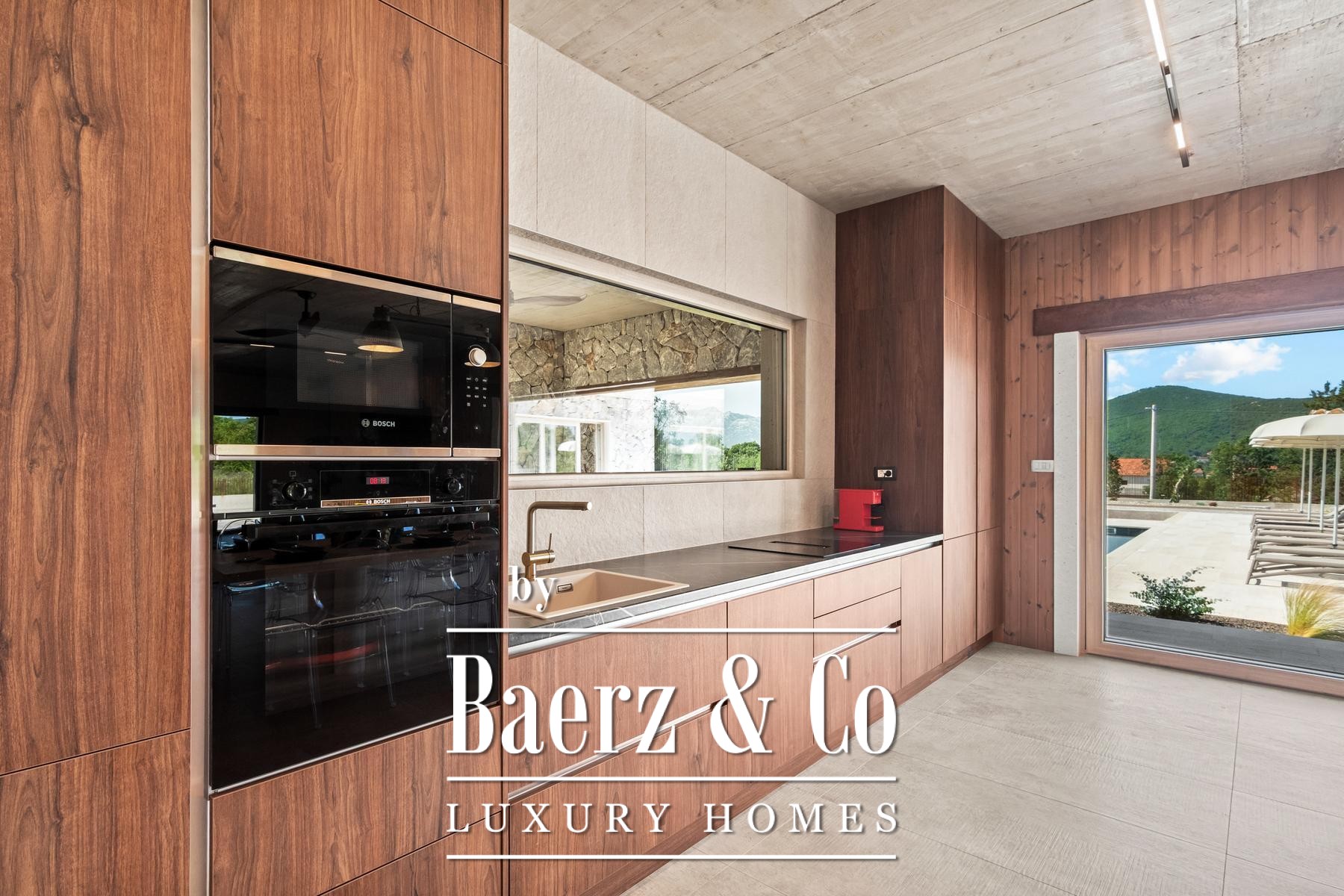 In the vicinity of Split, there is this completely different newly built villa with a swimming pool and tennis court. It is located on a plot of 2130 m2, on the very edge of the green zone, surrounded by peace and beautiful nature.It is a single-storey house with an excellently designed living space, which extends to 240 m2.The living area (living room, kitchen, dining room) of 70 m2 is maximally opened with excellent sliding walls (Gelan), and has a view of the summer kitchen, tennis court and swimming pool.The furniture throughout the building is custom-made with designer pieces (armchairs, paintings, ...).The walls are decorated with natural materials (stone, wooden panels), while the dining table is entirely