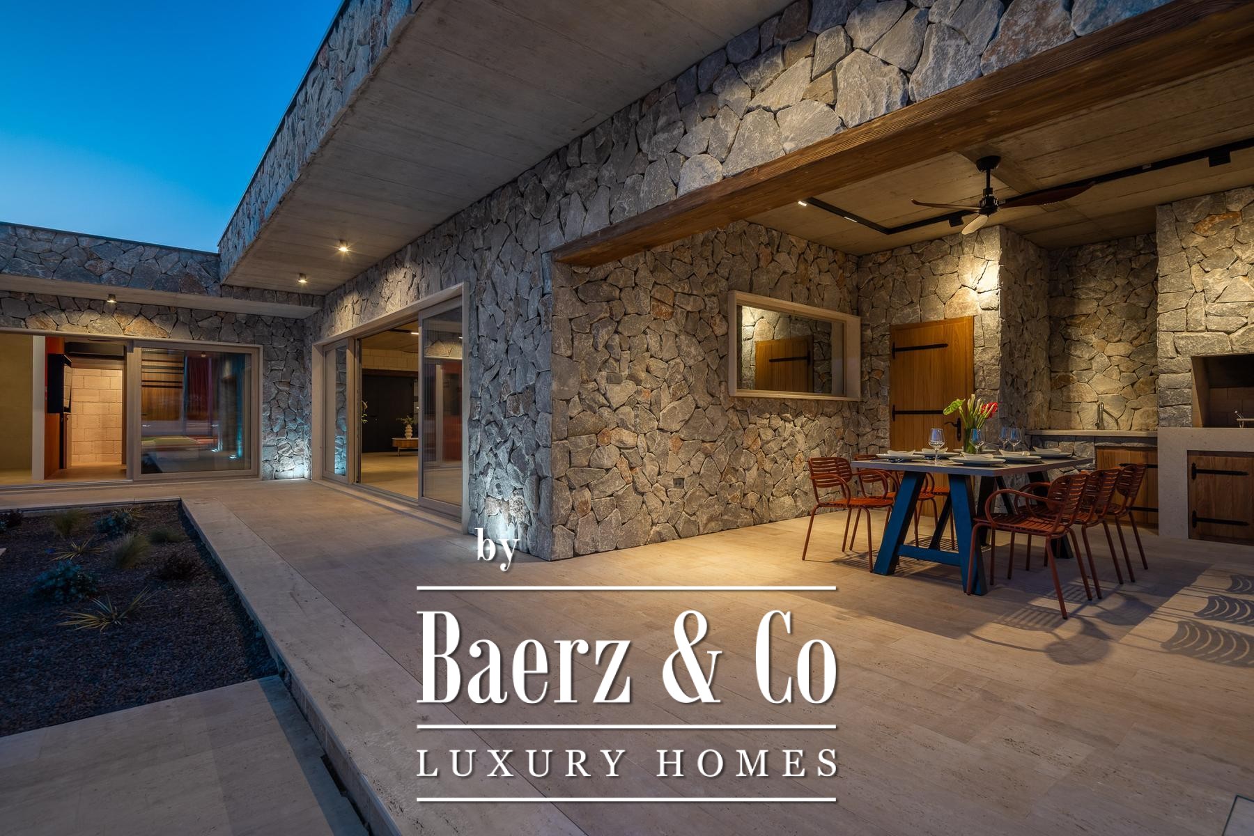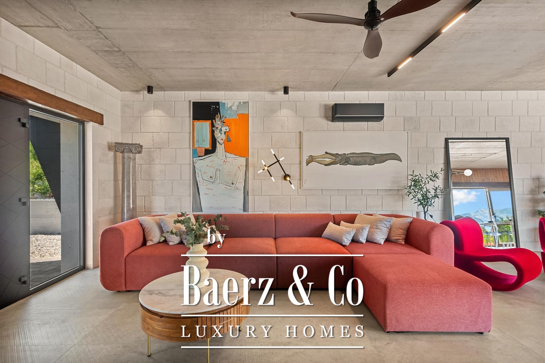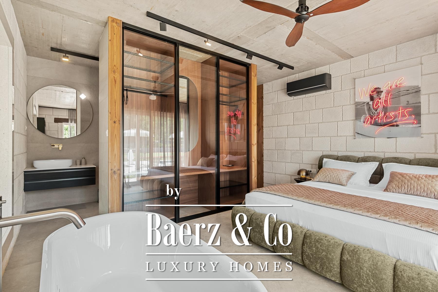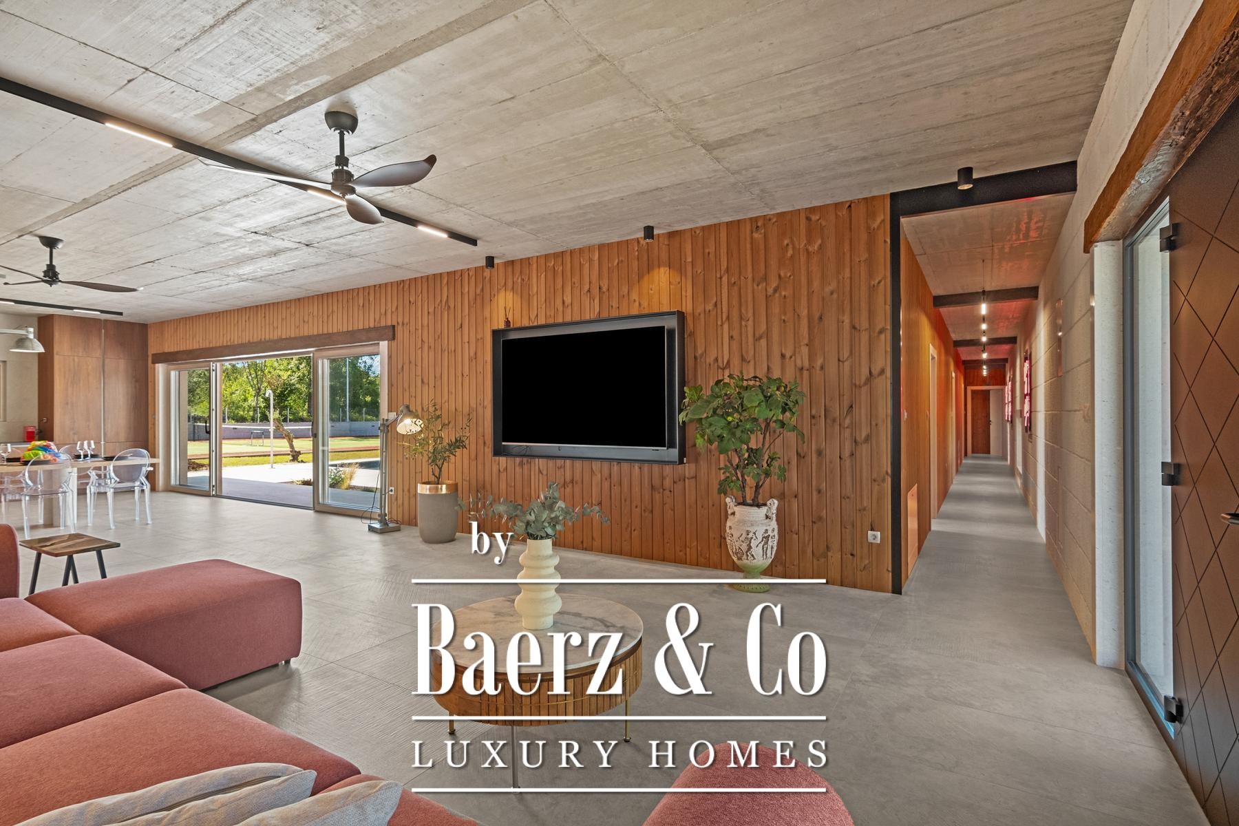 In the vicinity of Split, there is this completely different newly built villa with a swimming pool and tennis court. It is located on a plot of 2130 m2, on the very edge of the green zone, surrounded by peace and beautiful nature.It is a single-storey house with an excellently designed living space, which extends to 240 m2.The living area (living room, kitchen, dining room) of 70 m2 is maximally opened with excellent sliding walls (Gelan), and has a view of the summer kitchen, tennis court and swimming pool.The furniture throughout the building is custom-made with designer pieces (armchairs, paintings, ...).The walls are decorated with natural materials (stone, wooden panels), while the dining table is entirely