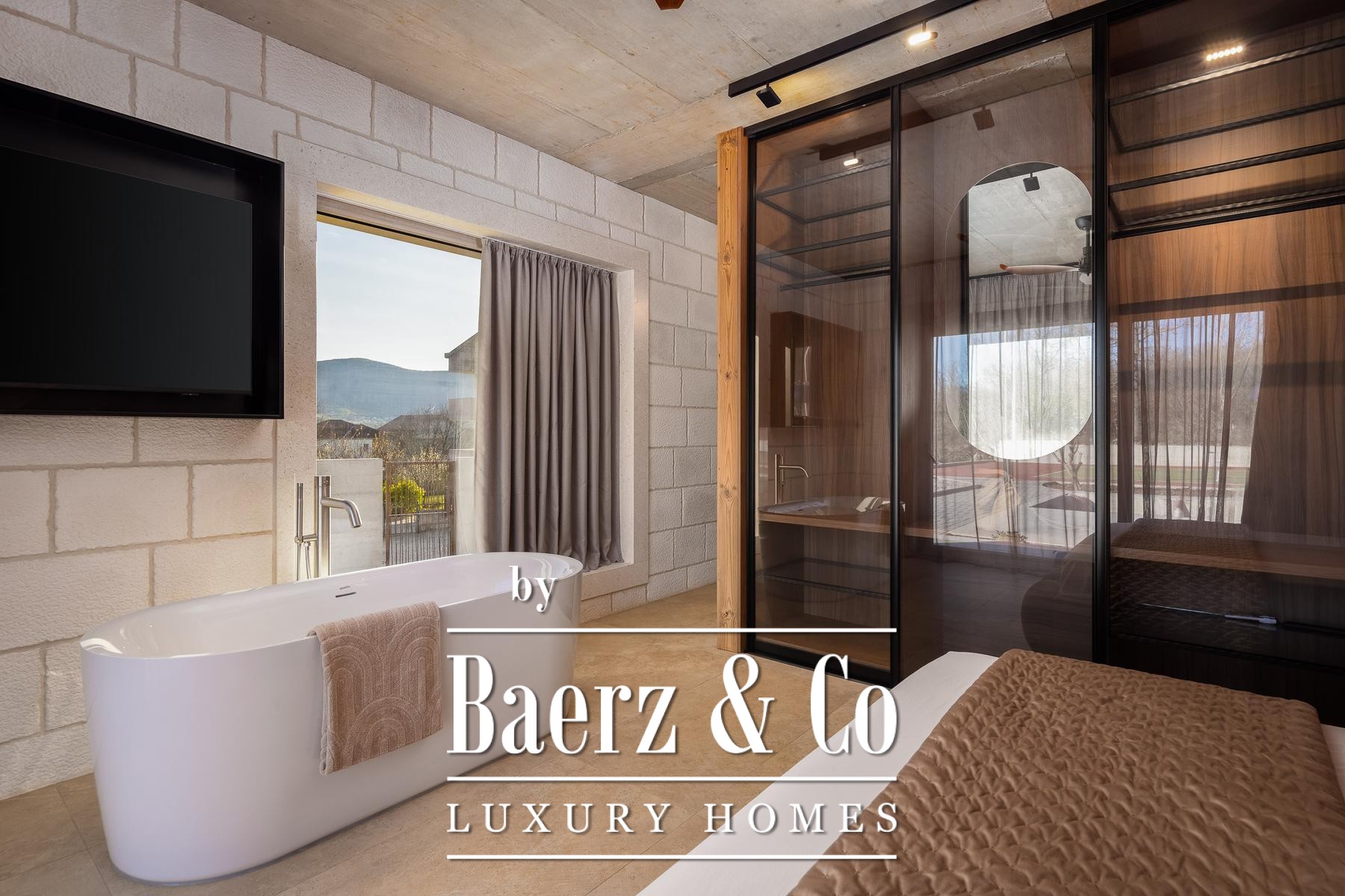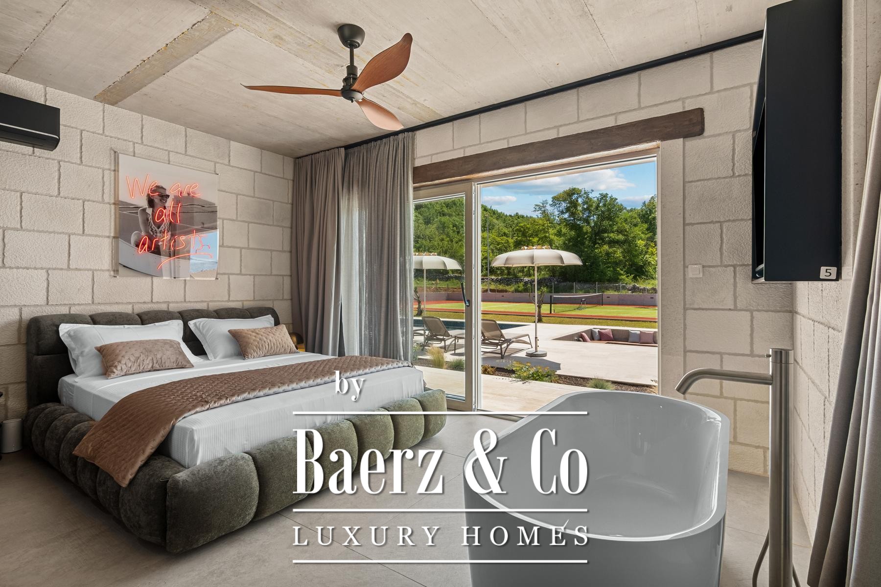 made of natural stone (travertine 300 x 120).The hallway leads us to four comfortable bedrooms with their own bathrooms.The garden is cultivated (20 old olive trees), and hides a summer kitchen with a fireplace, a stone-lined sundeck, a heated swimming pool (45 m2) and a tennis court (17 x 34).The owner paid great attention to the details during the decoration that ultimately make this property exceptional, so the entire property is covered in stone, 4 m high aluminum entrance doors, water-based underfloor heating throughout the building, each room has an air conditioning unit and fan, ambient lighting (100 LED lamps), special ceramics in the pool, etc.For any additional information, we are at your disposal.