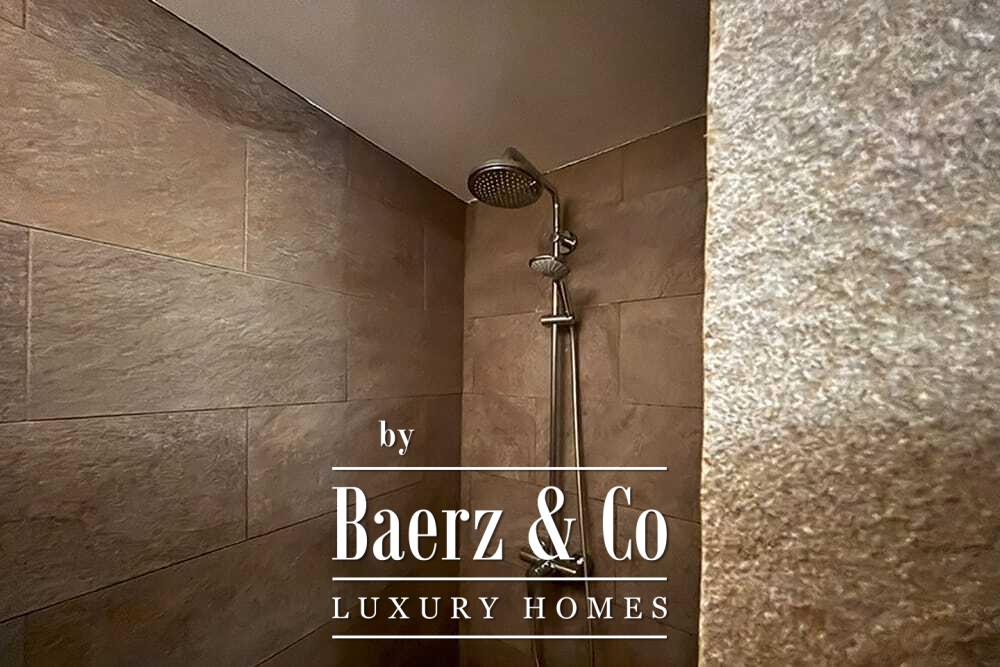 Within its two floors, the villa offers four bedrooms and four bathrooms. Three ground floor bedrooms, each with French doors, open to a lower terrace and mountain vistas. The master suite features a large bath, separate shower, twin marble basins, and designer fittings, defining a sense of sanctuary. The studio bedroom, with private entrance, enhances flexibility for guests or work. Upstairs, a beamed living room with fireplace adjoins a walnut and stainless steel kitchen equipped with premium Miele appliances. High glass doors lead to a lounge with a second fireplace and access to terraces finished with granite tables and Philippe Starck chairs.