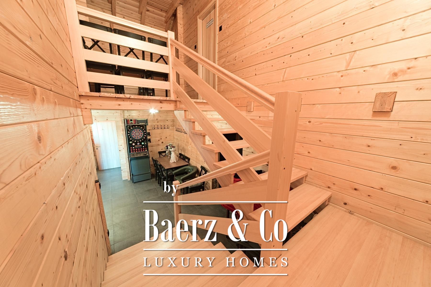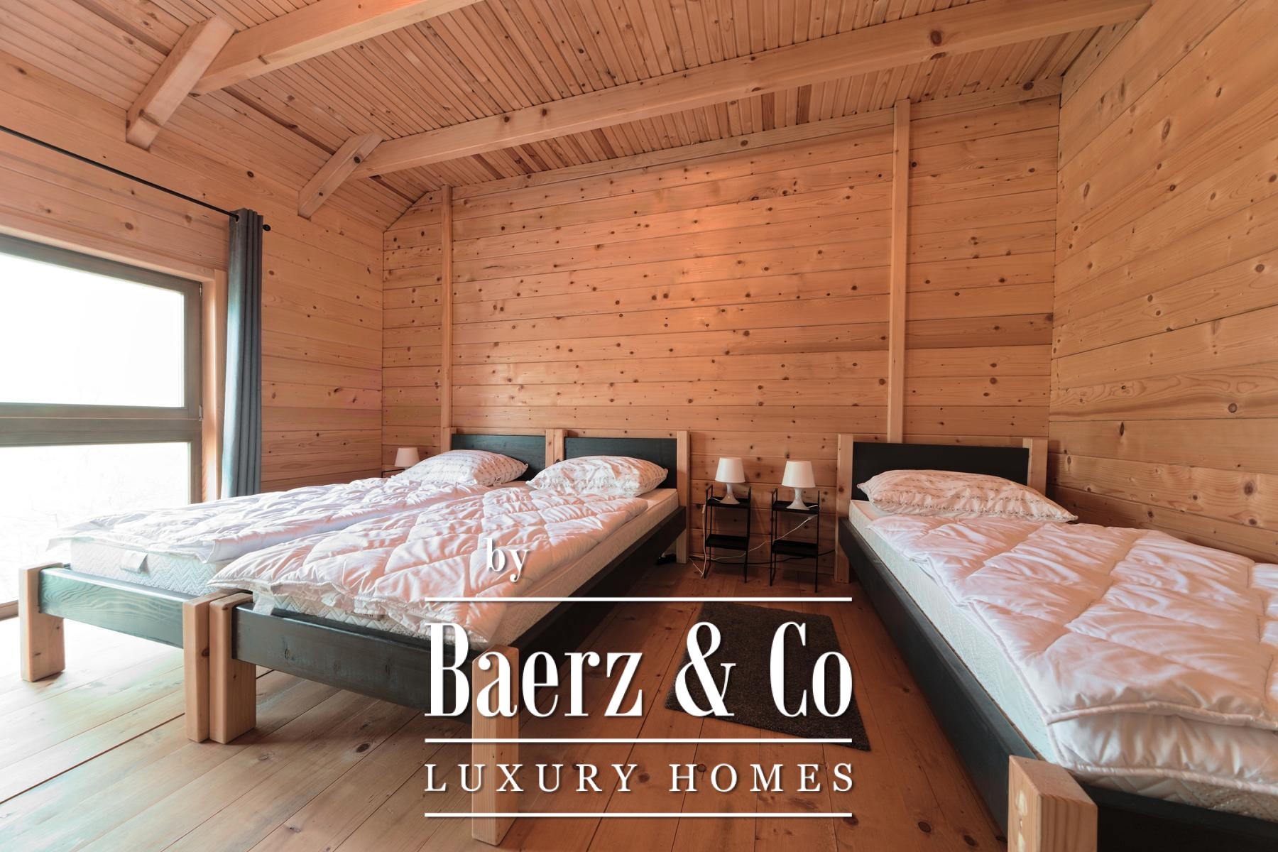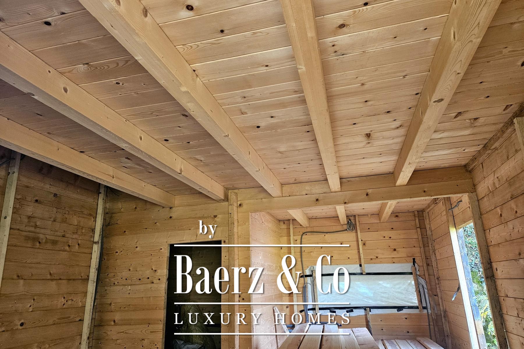 Adjacent to the main house, five newly completed wooden residences each offer 80 m² of living space. The layout includes a bright ground-floor living area and bathroom, while two bedrooms occupy the upper level. Private terraces at the back look onto the generous grounds, with heating designed for efficiency and autonomy.