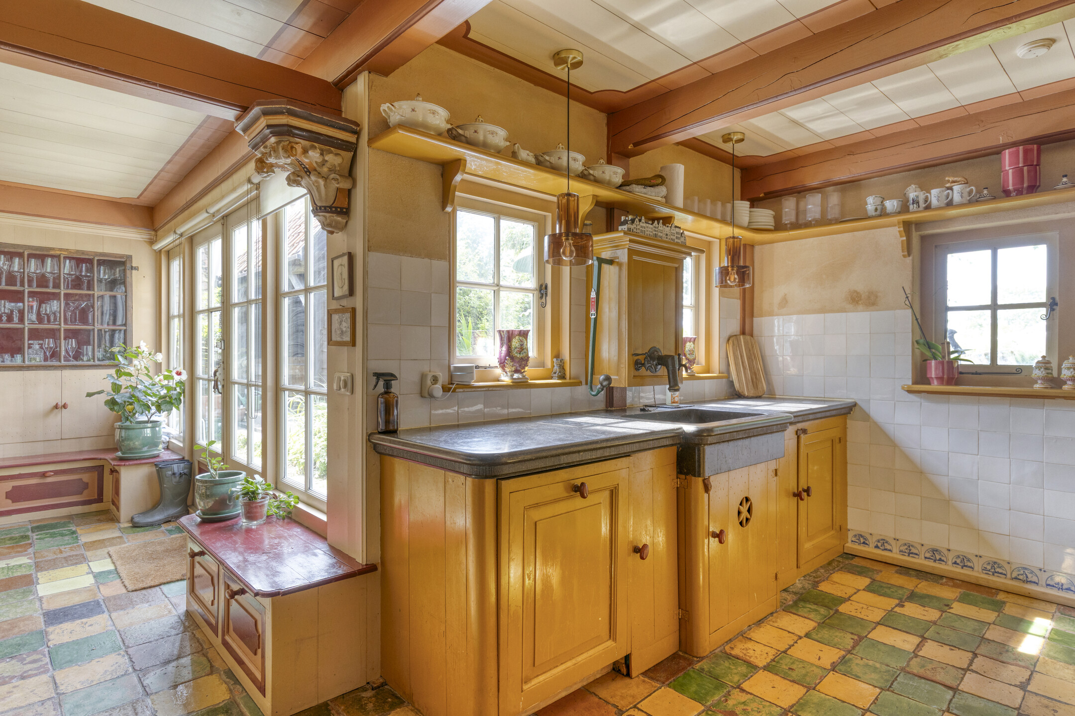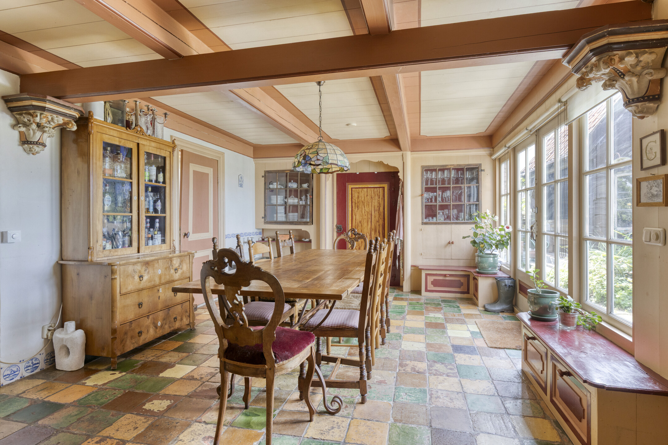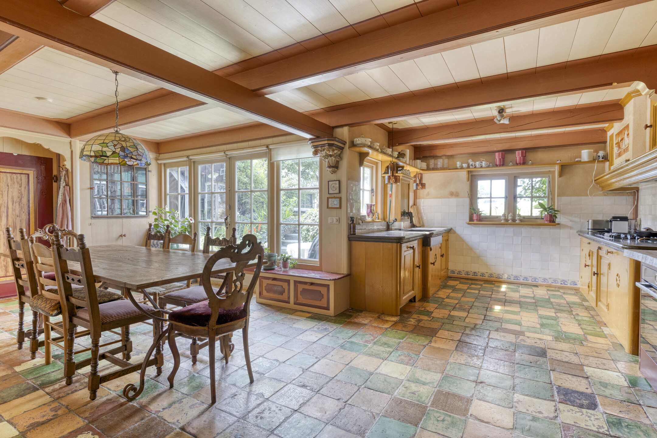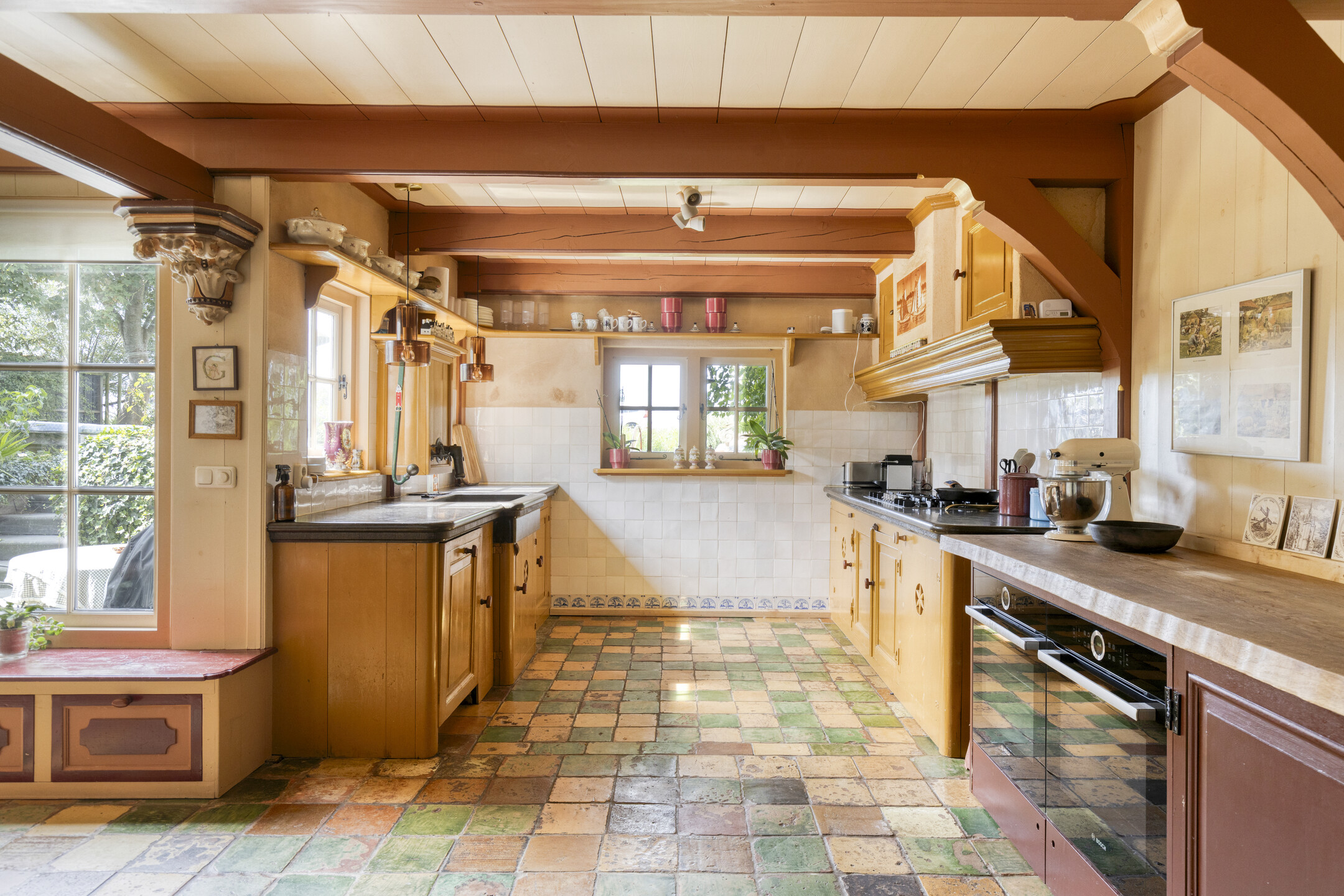 The entrance hall with guest toilet leads into the bright and spacious living room, where warmth and character are immediately apparent. Adjacent is the open-plan kitchen with underfloor heating and French doors to the garden. The kitchen is fully equipped with a 5-burner gas hob, extractor hood, dishwasher, multiple refrigerators and freezers, and a recently installed kitchen unit with two ovens – ideal for entertaining and long dinners.