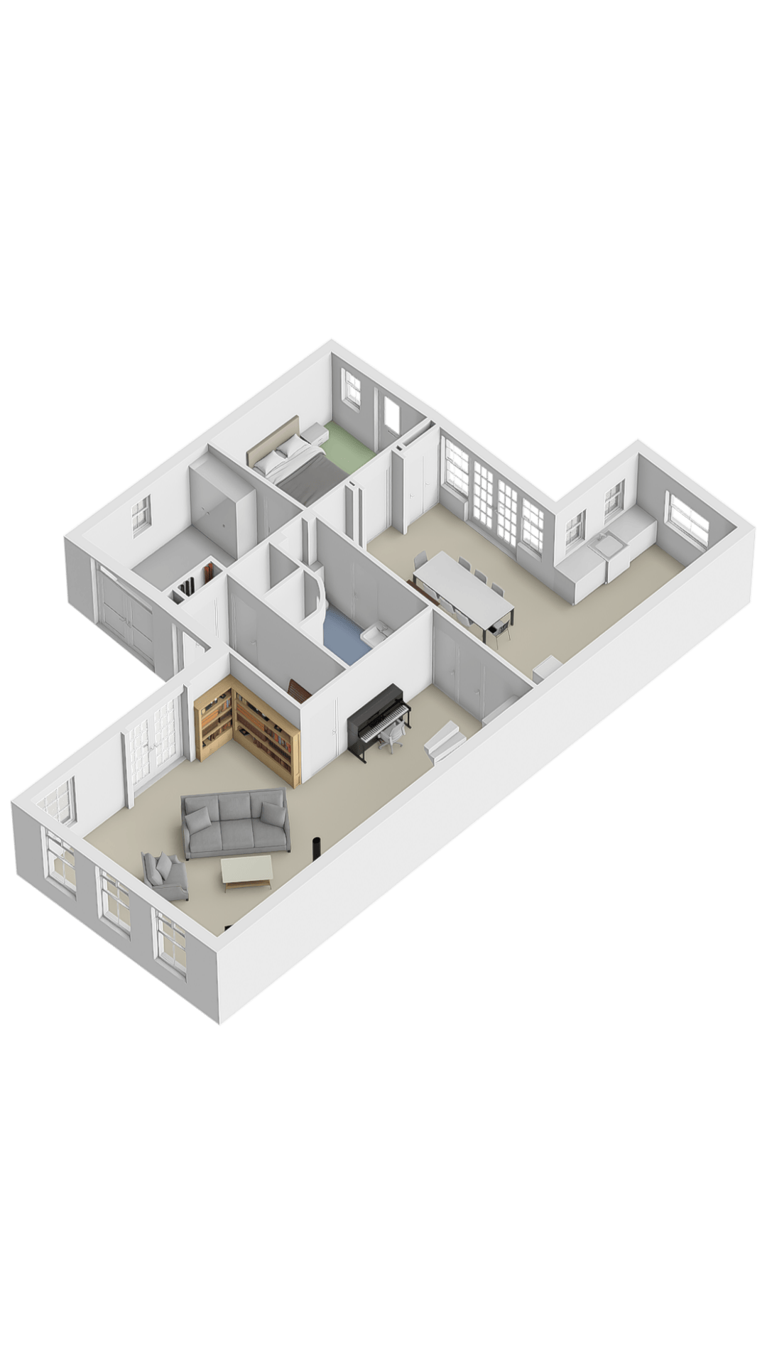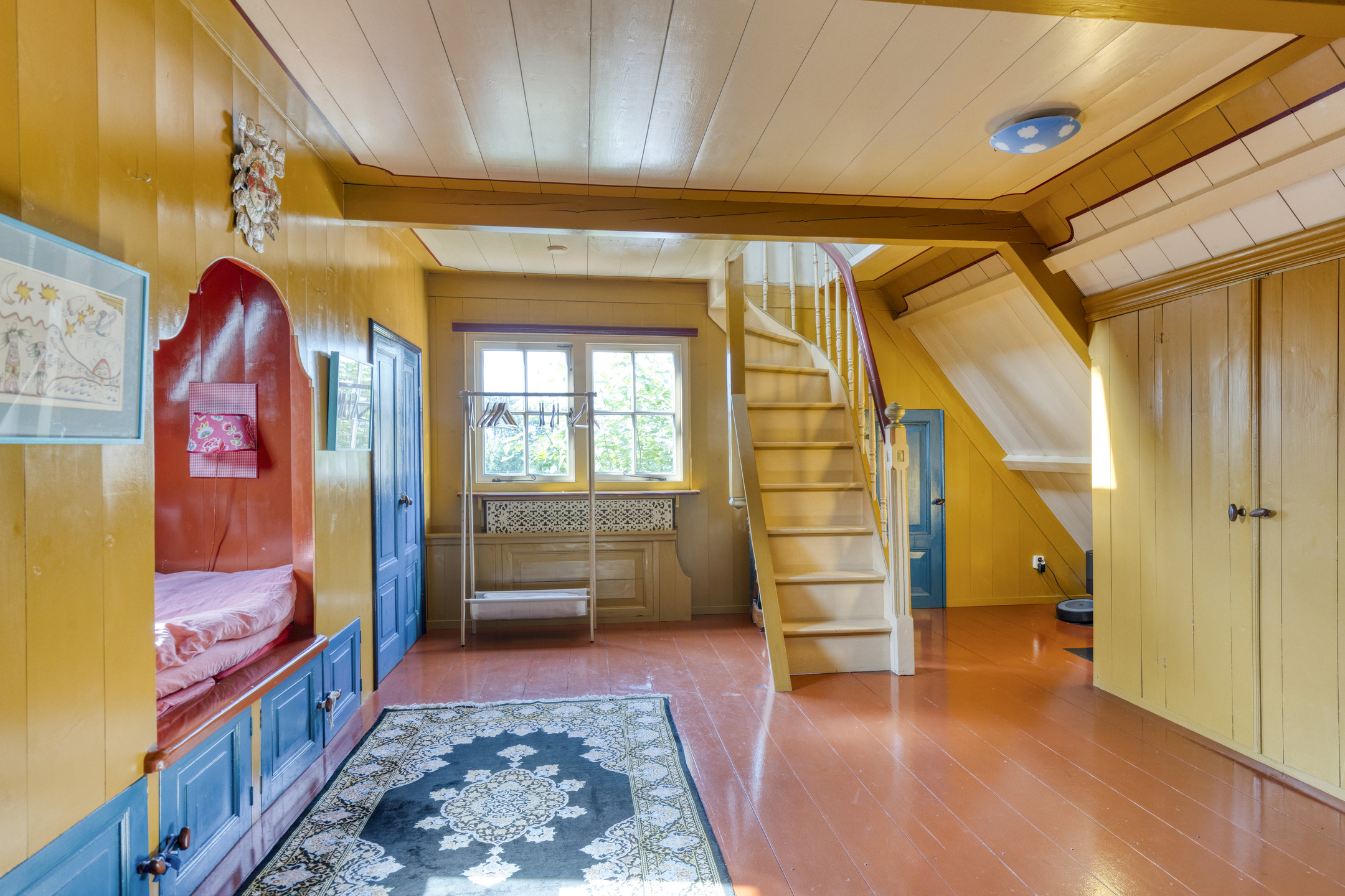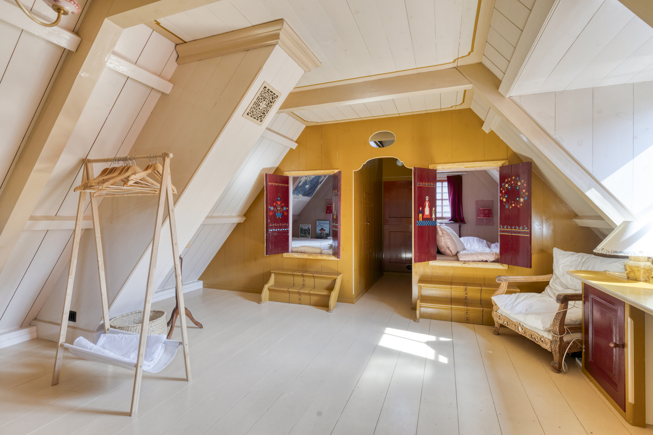 The staircase from the living room leads to a bright landing with skylights, currently used as a comfortable home office. From here, two spacious bedrooms are accessible. The front bedroom features built-in wardrobes, two traditional sleeping alcoves, a washbasin and access to a storage loft. The rear bedroom also has built-in wardrobes, a sleeping alcove, a washbasin and a third toilet. An additional adjoining room is ideal as a playroom or extra storage. A fixed staircase leads to the spacious attic, offering ample storage.