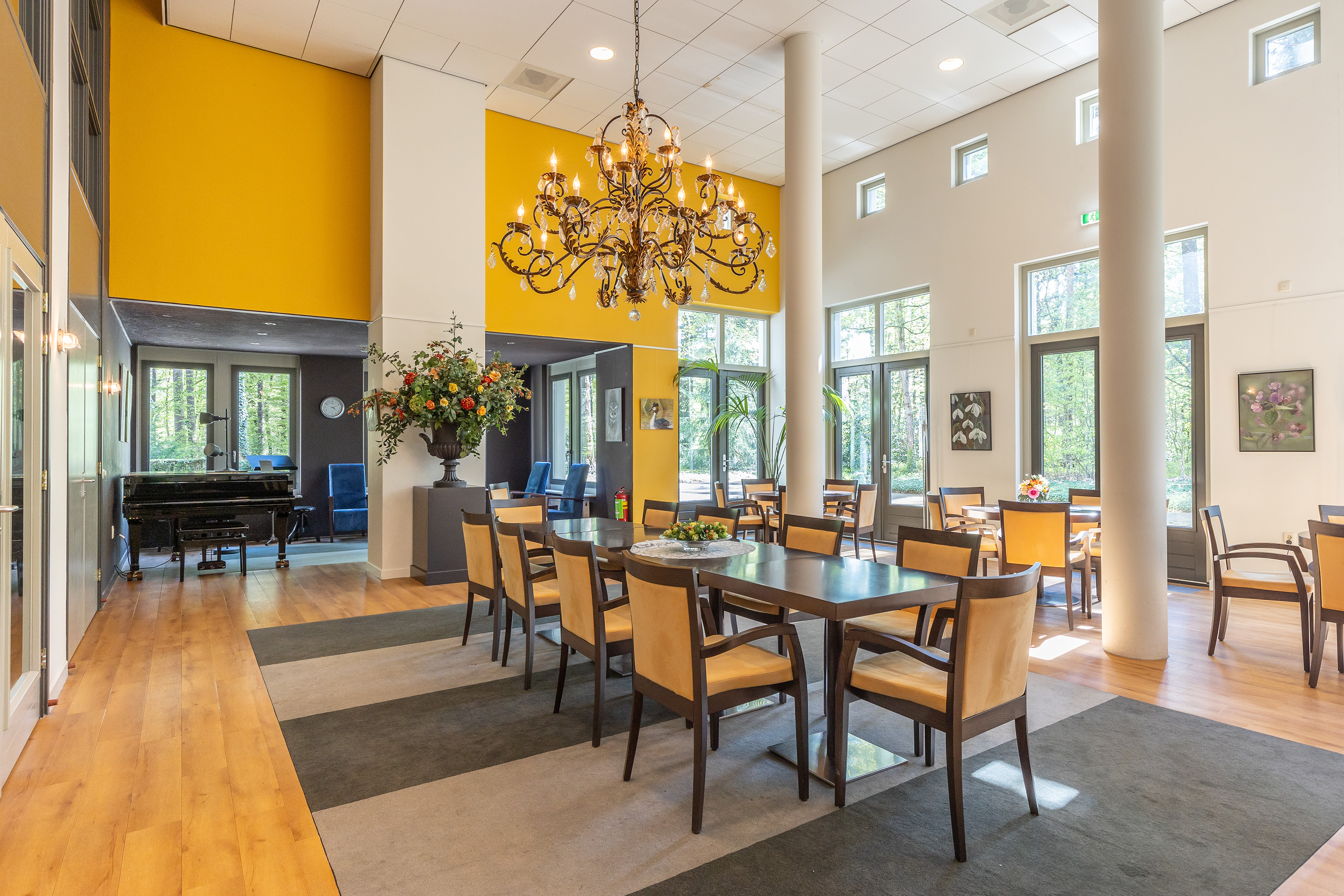 A caretaker is present on weekdays until 12 noon for maintenance work and minor services. The main building also features an inviting Grand Café with a terrace, ideal for dinners, receptions and various events. Cultural gatherings and concerts are regularly organised here. In addition, two guest rooms with private bathrooms are available for residents’ visitors.