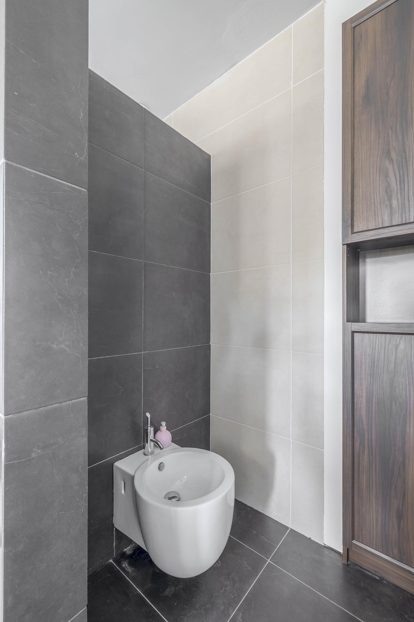 The partially tiled bathroom is equipped with a walk-in shower, wall closet and a washbasin shelf with basin.