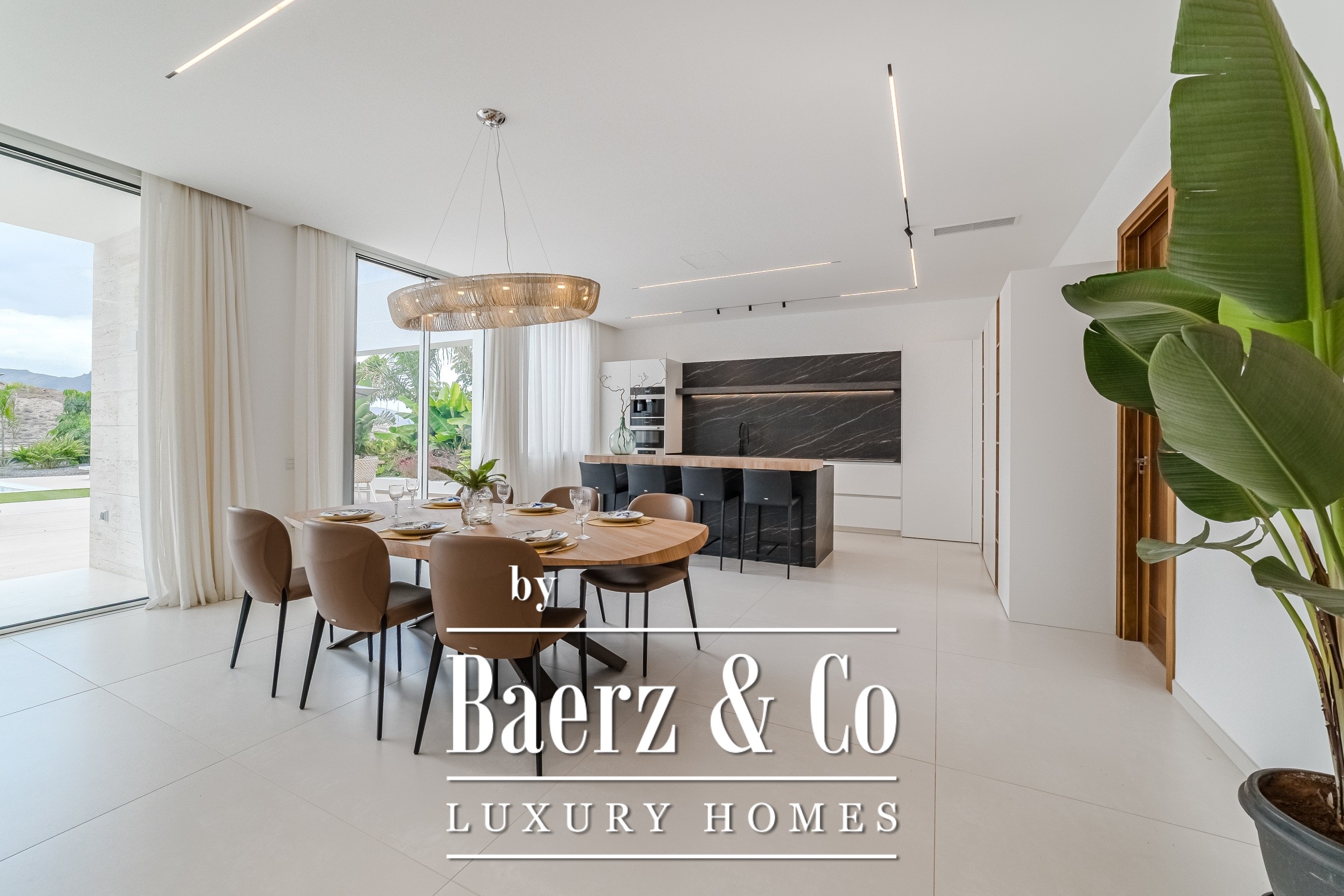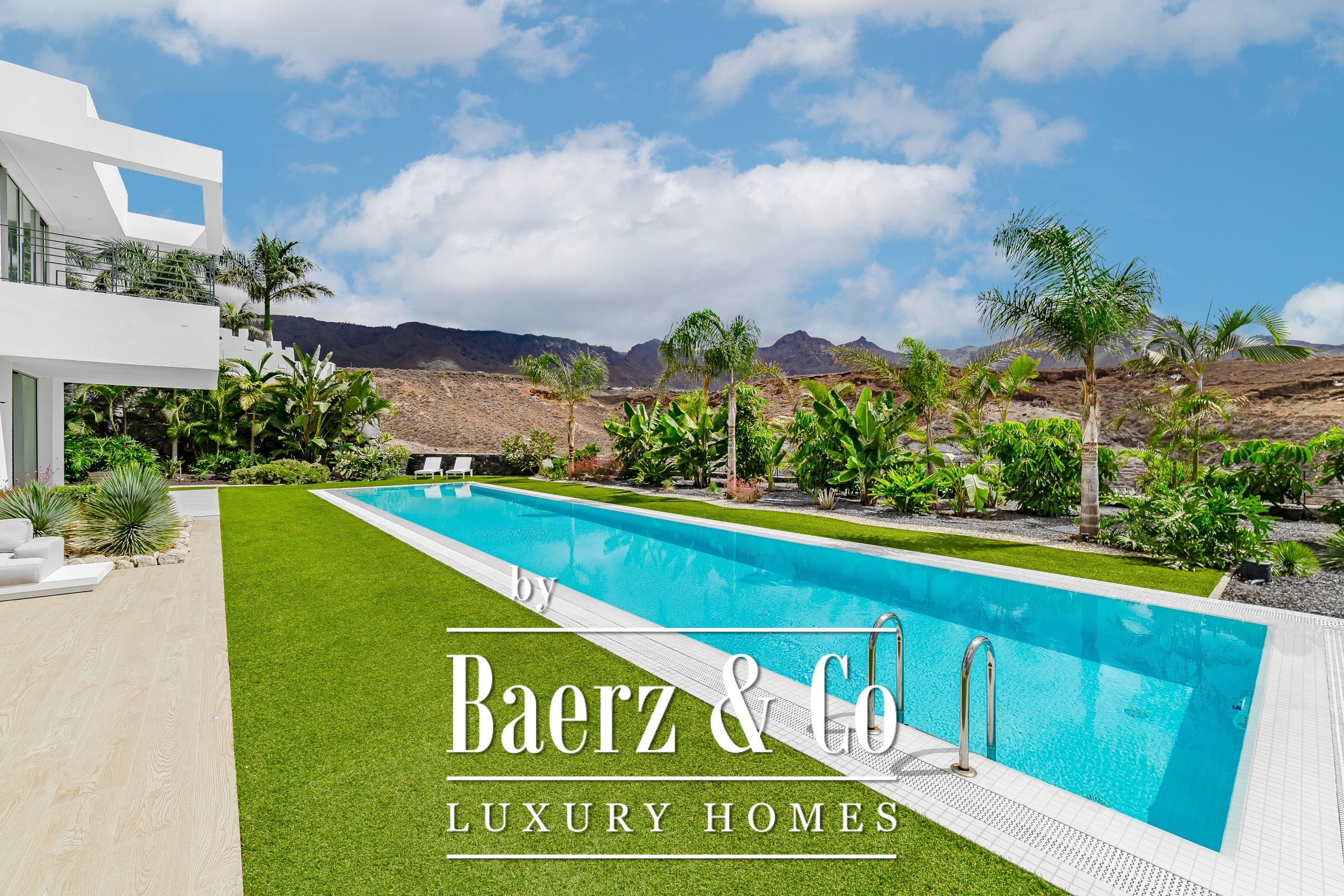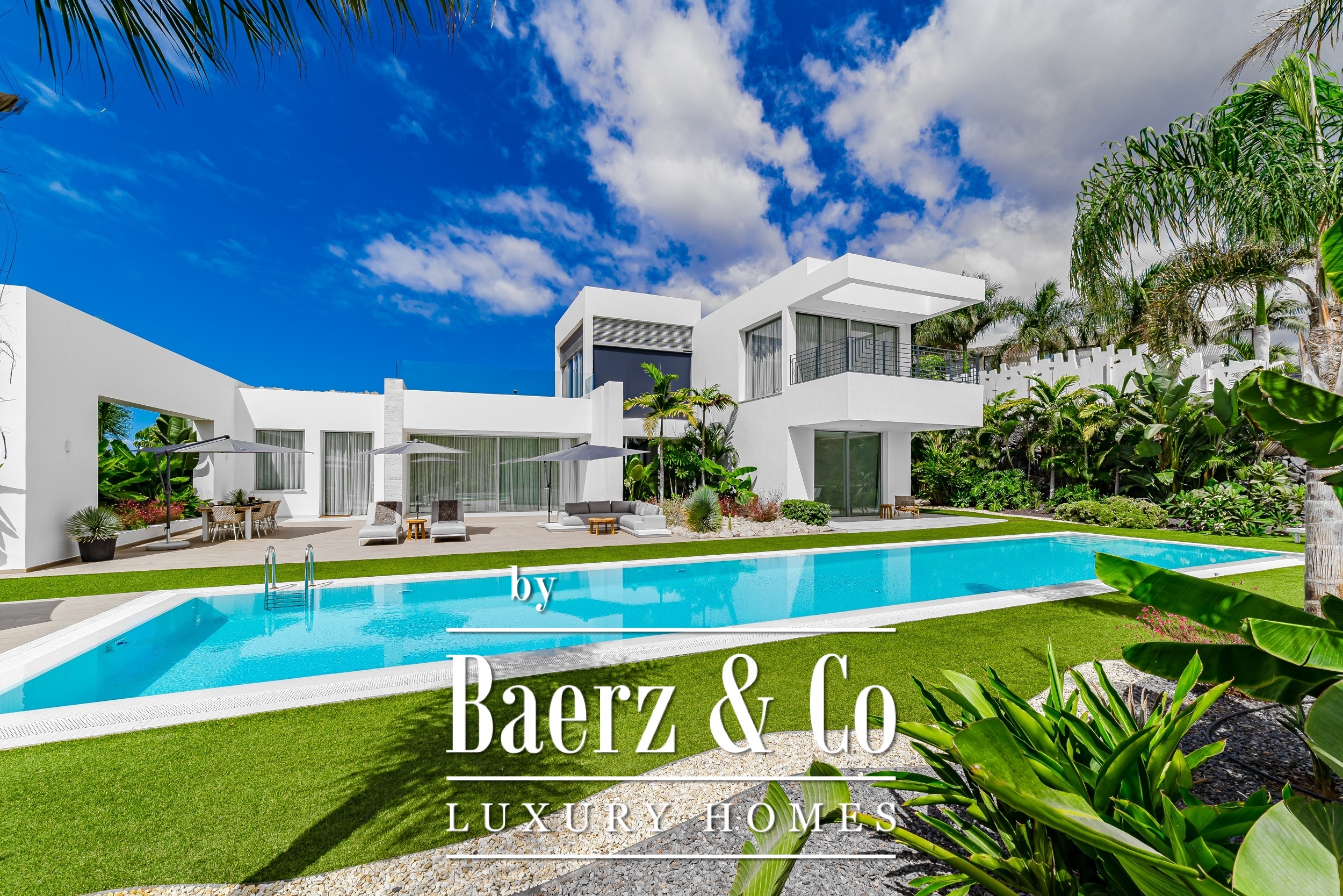 Luxury villa Golf Costa Adeje stands discreetly among the most prestigious addresses in southern Tenerife, where elevated design meets calm seclusion. Set within a 2,500 m² plot and embraced by a 1,500 m² tropical garden, this property reflects sophisticated island living. The villa encompasses approximately 350 m² of thoughtfully arranged spaces, complemented by a 200 m² basement that invites customization, whether for a private cinema, wellness studio, or gym.