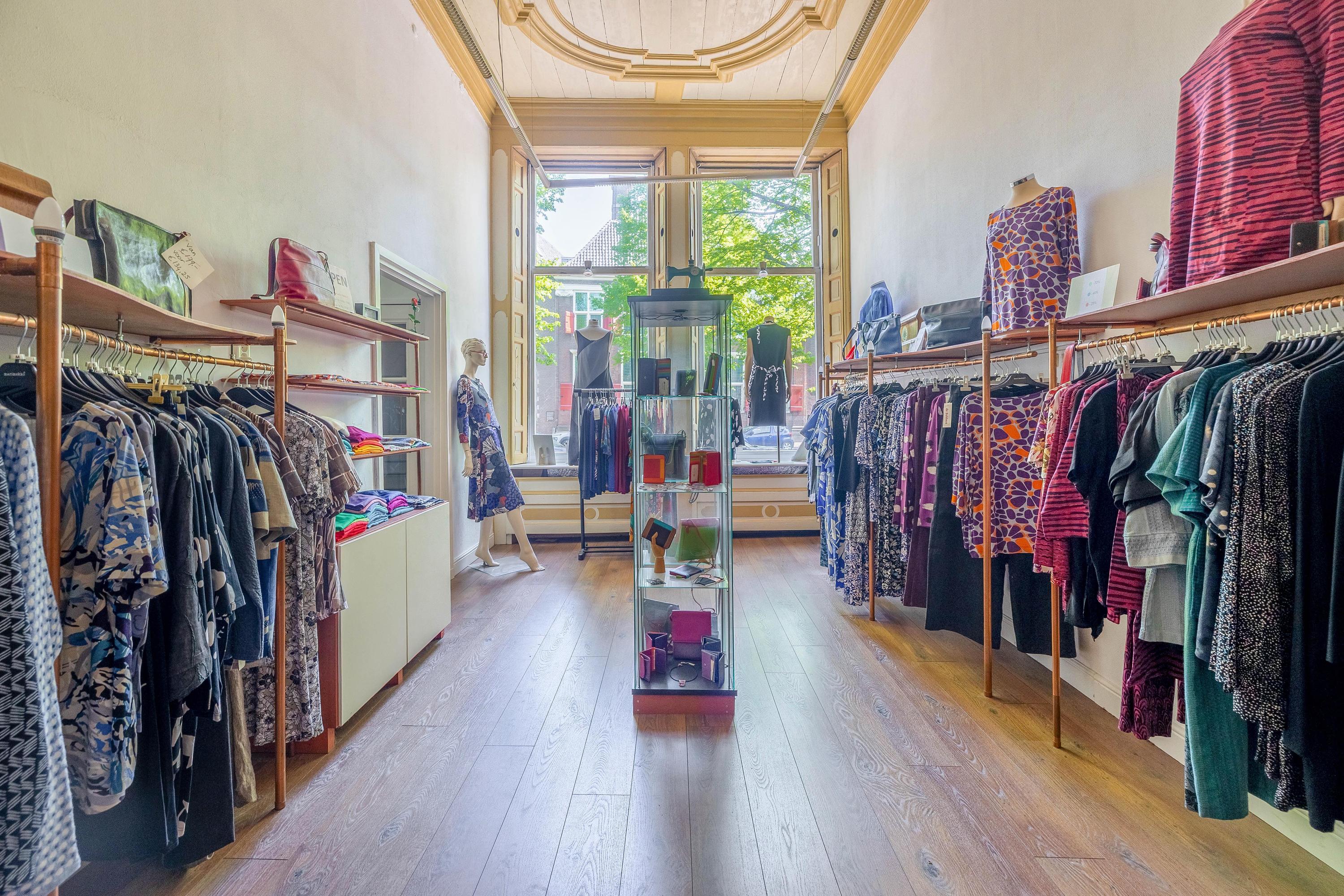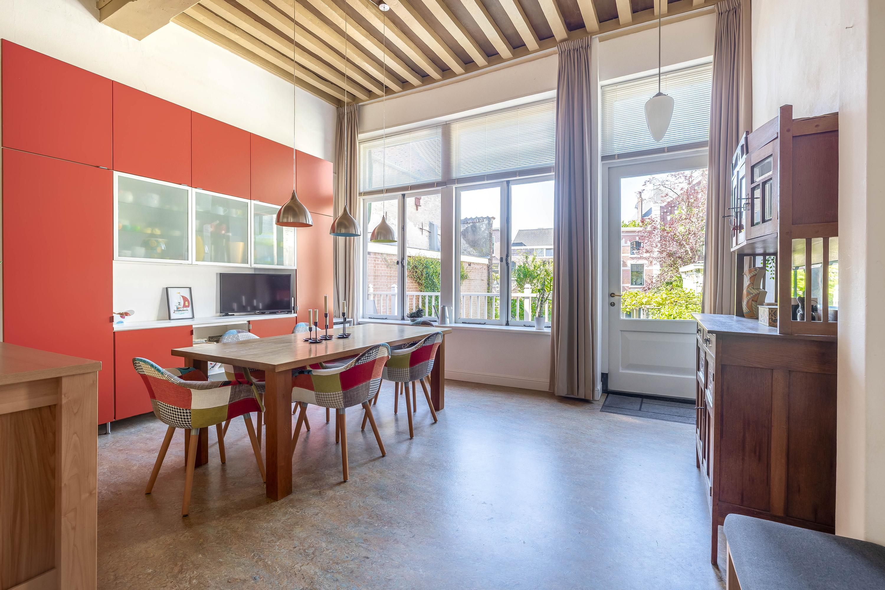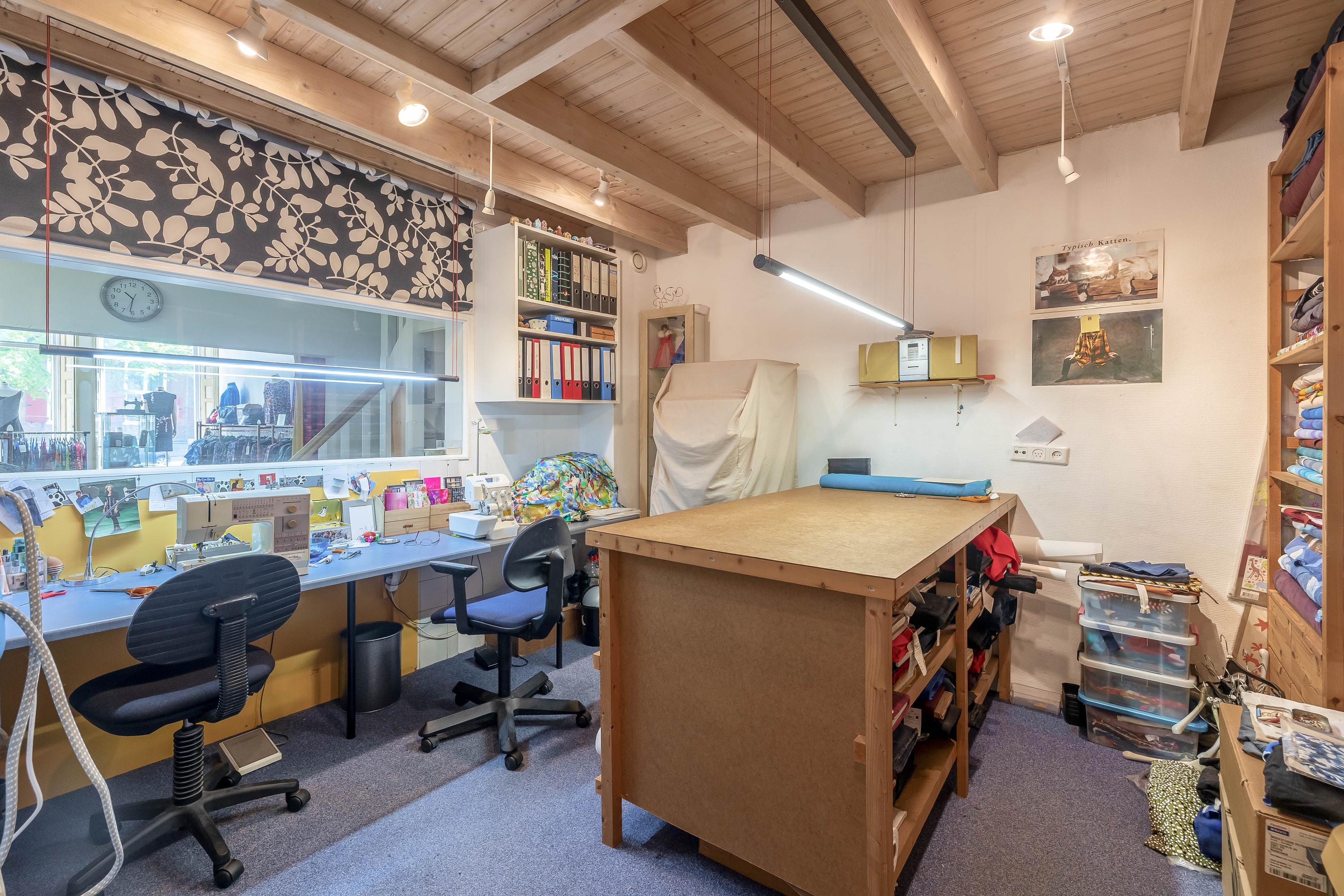 Shop space with beautiful wooden molded ceiling, staircase (fully renewed), studio with loft ladder to attic storage, toilet, second staircase (fully renewed), large kitchen-diner with stunning garden view, kitchen equipped with induction cooktop, extractor hood, combi oven, convection oven, dishwasher, kitchen boiler, marmoleum flooring with underfloor heating, and door to southwest-facing terrace.