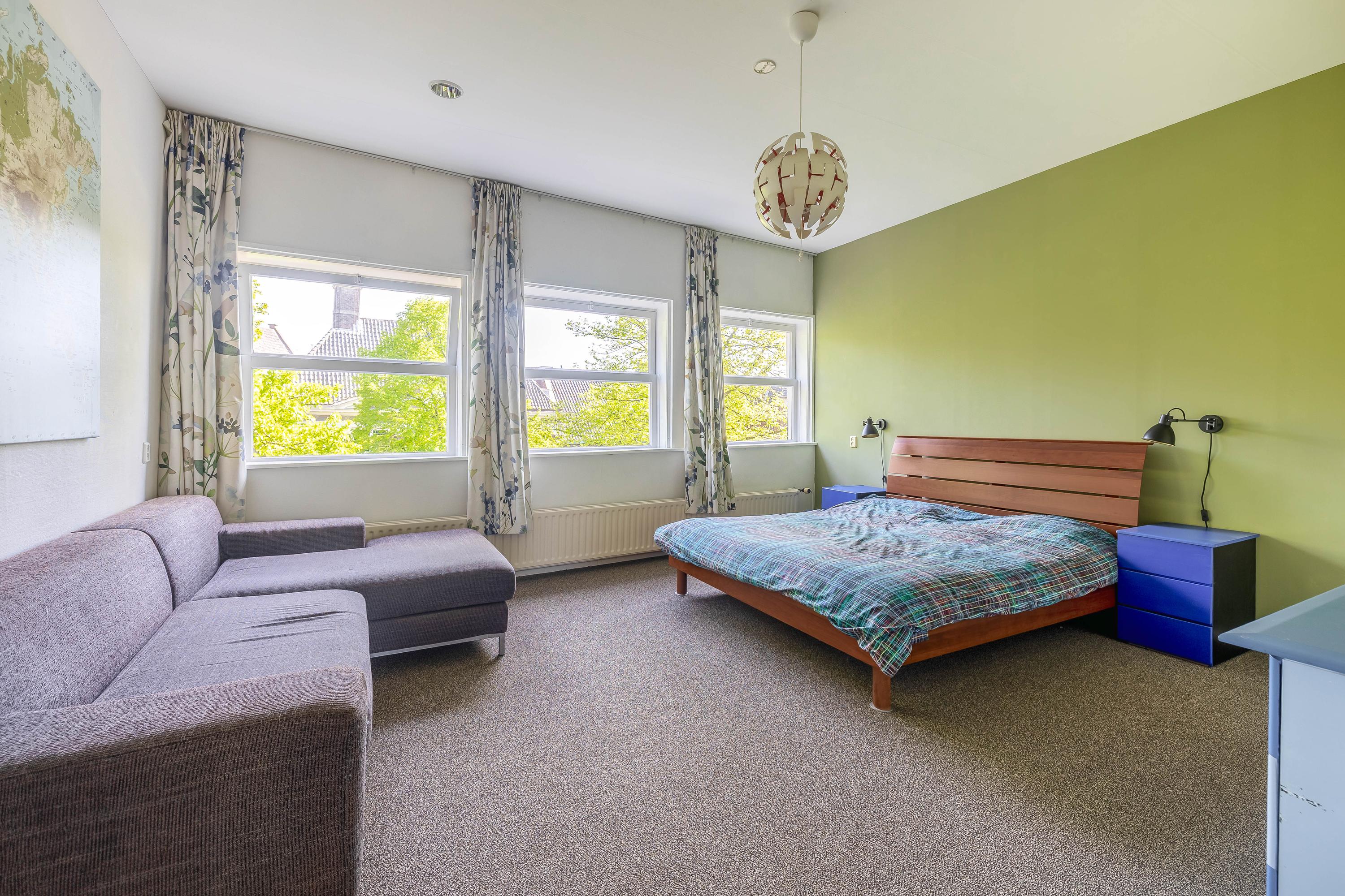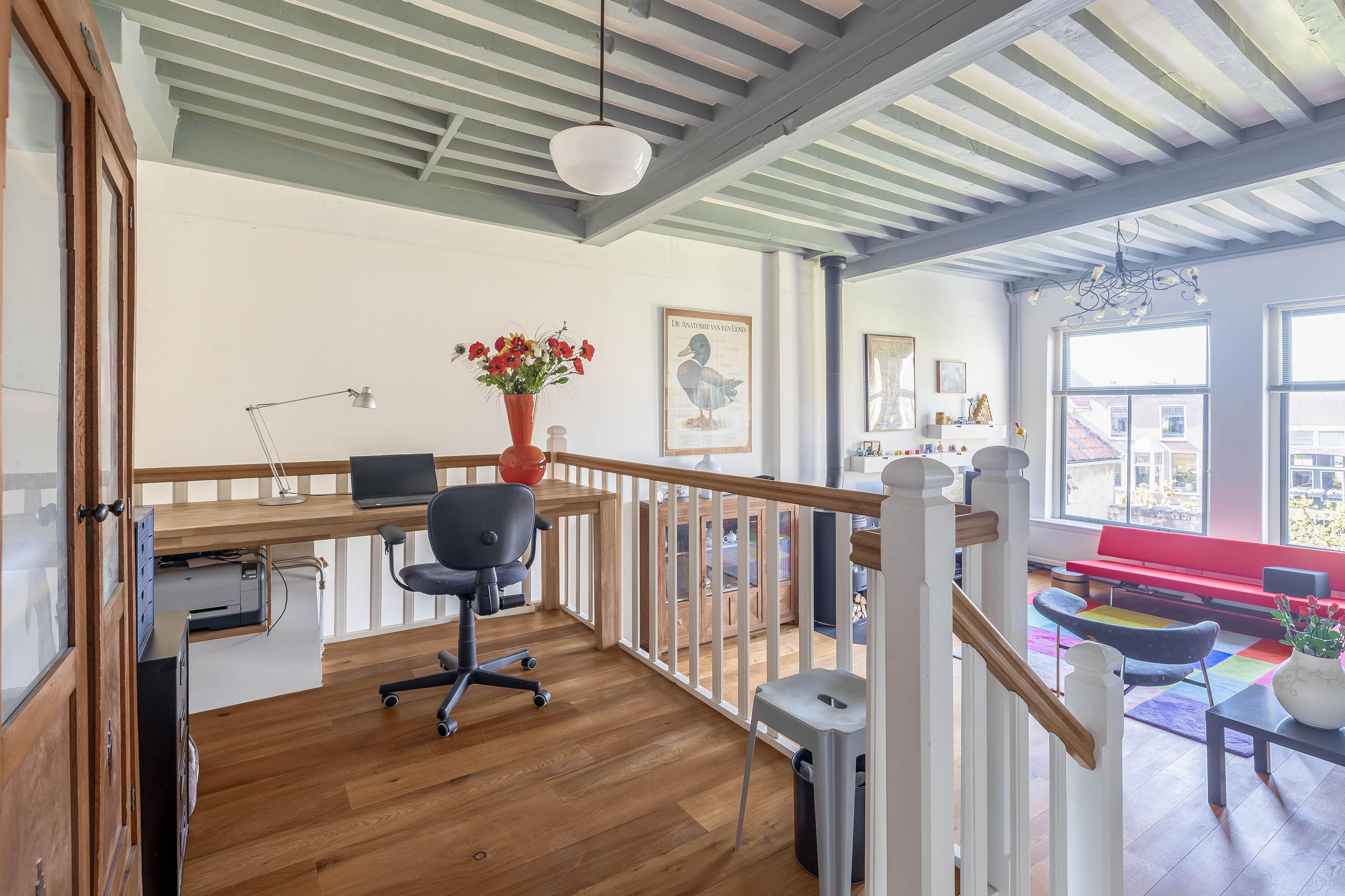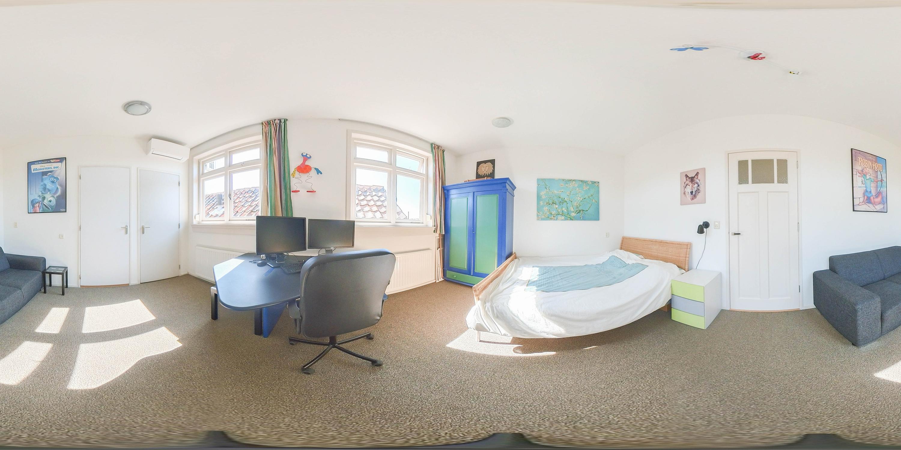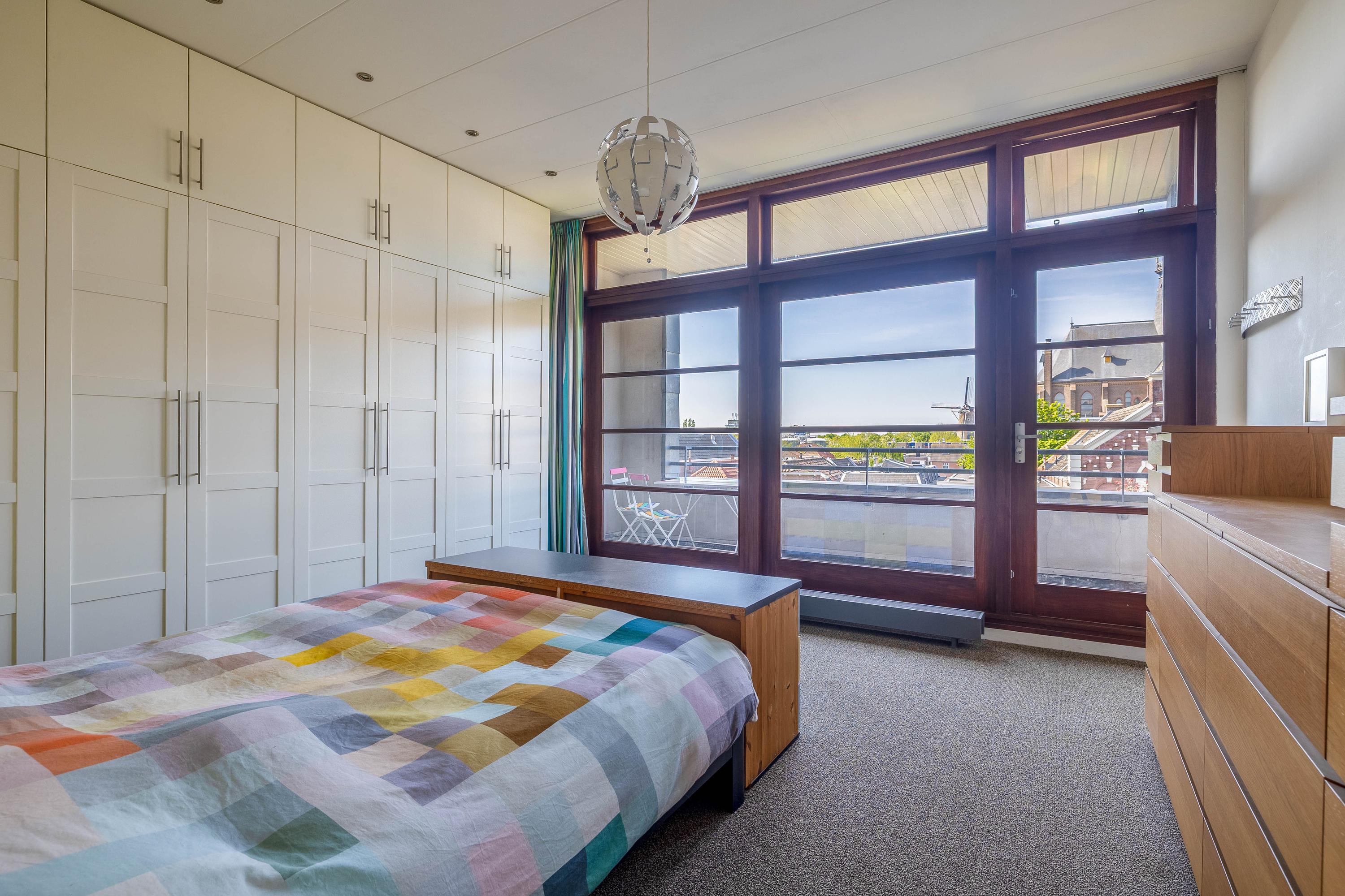 Rear bedroom with new rear façade and door to terrace with stunning view over the historic buildings of Gouda’s city center, bedroom with built-in wardrobe, air conditioning, boiler room, and front bedroom with view of the museum and St. John’s Church