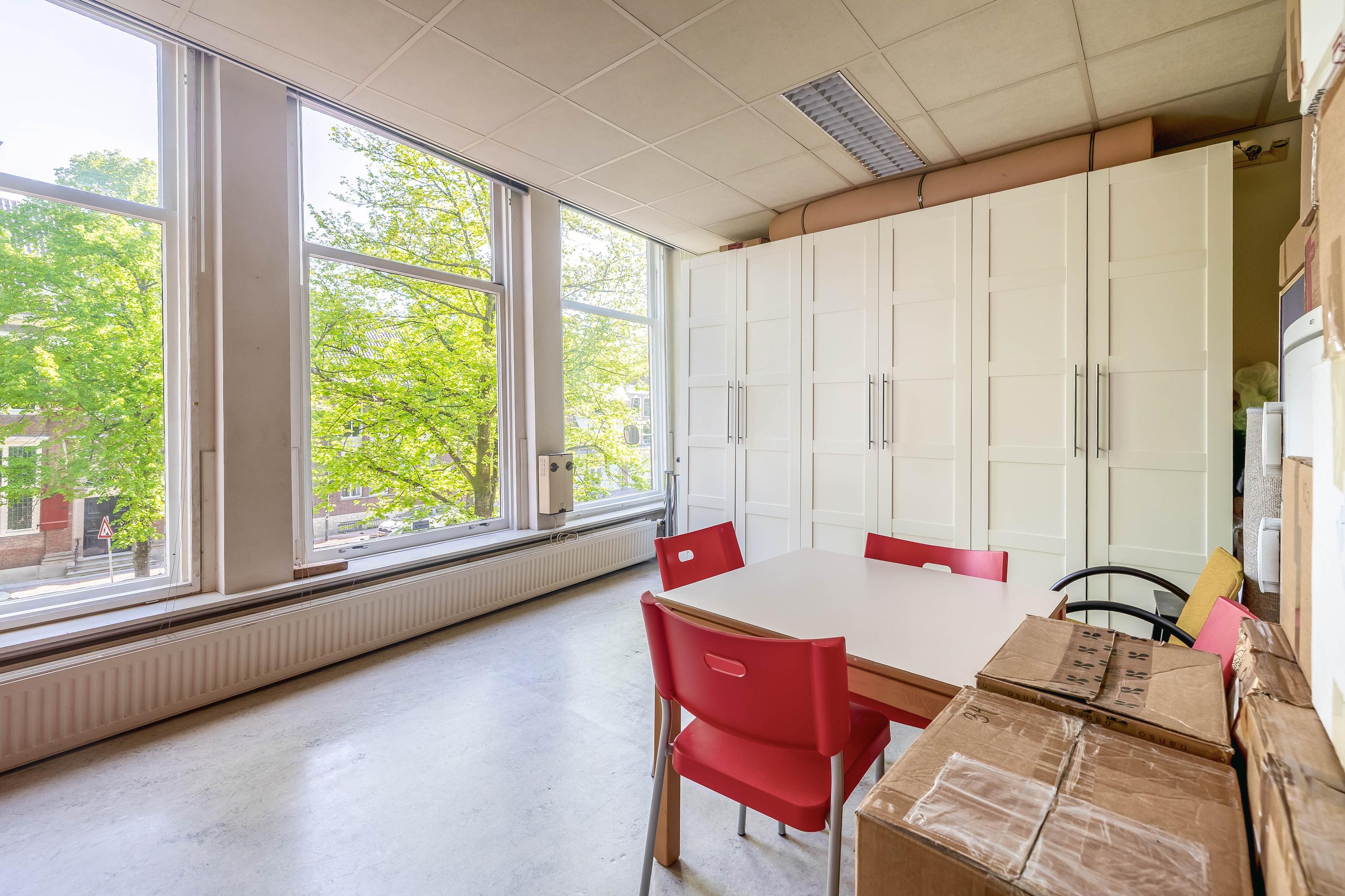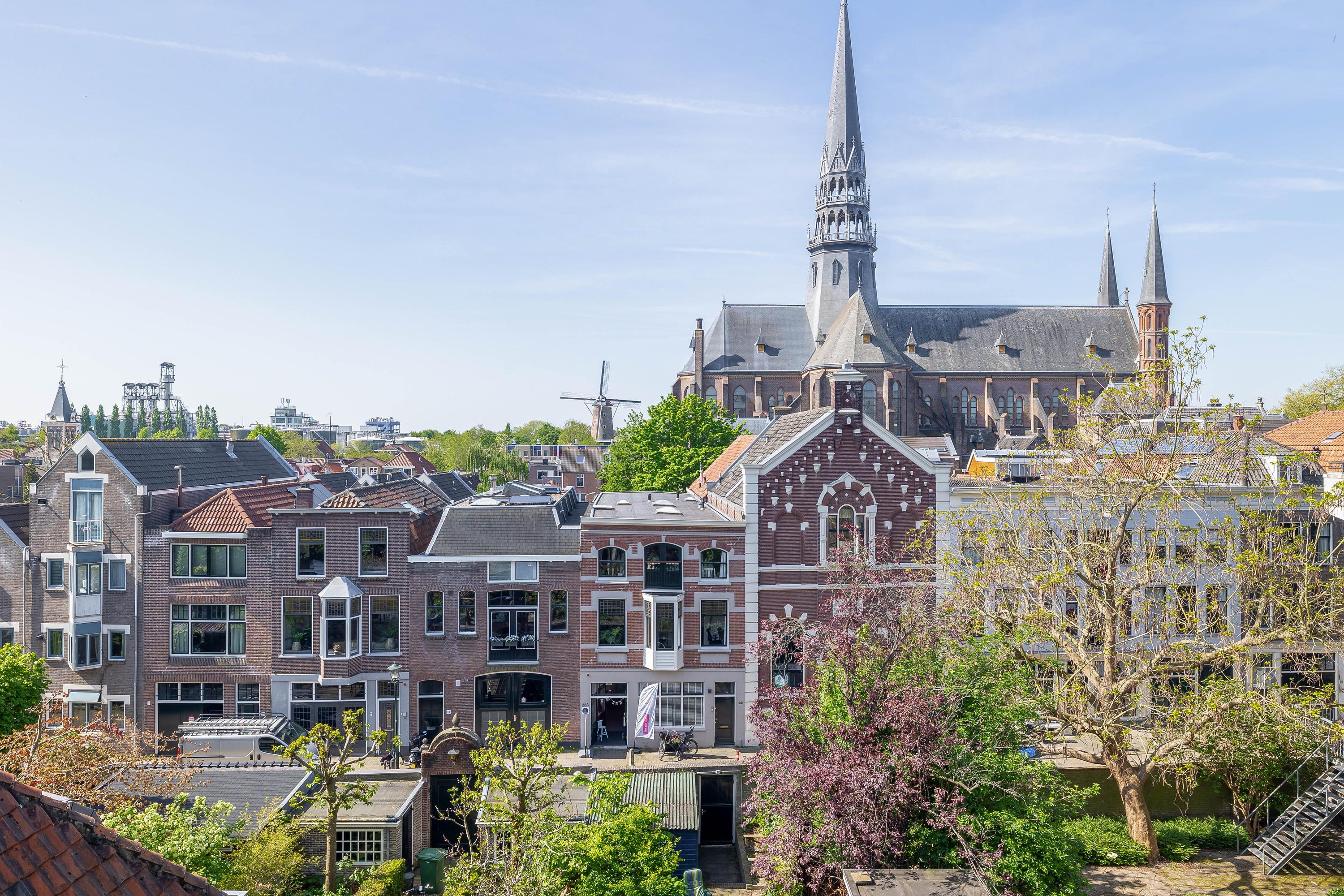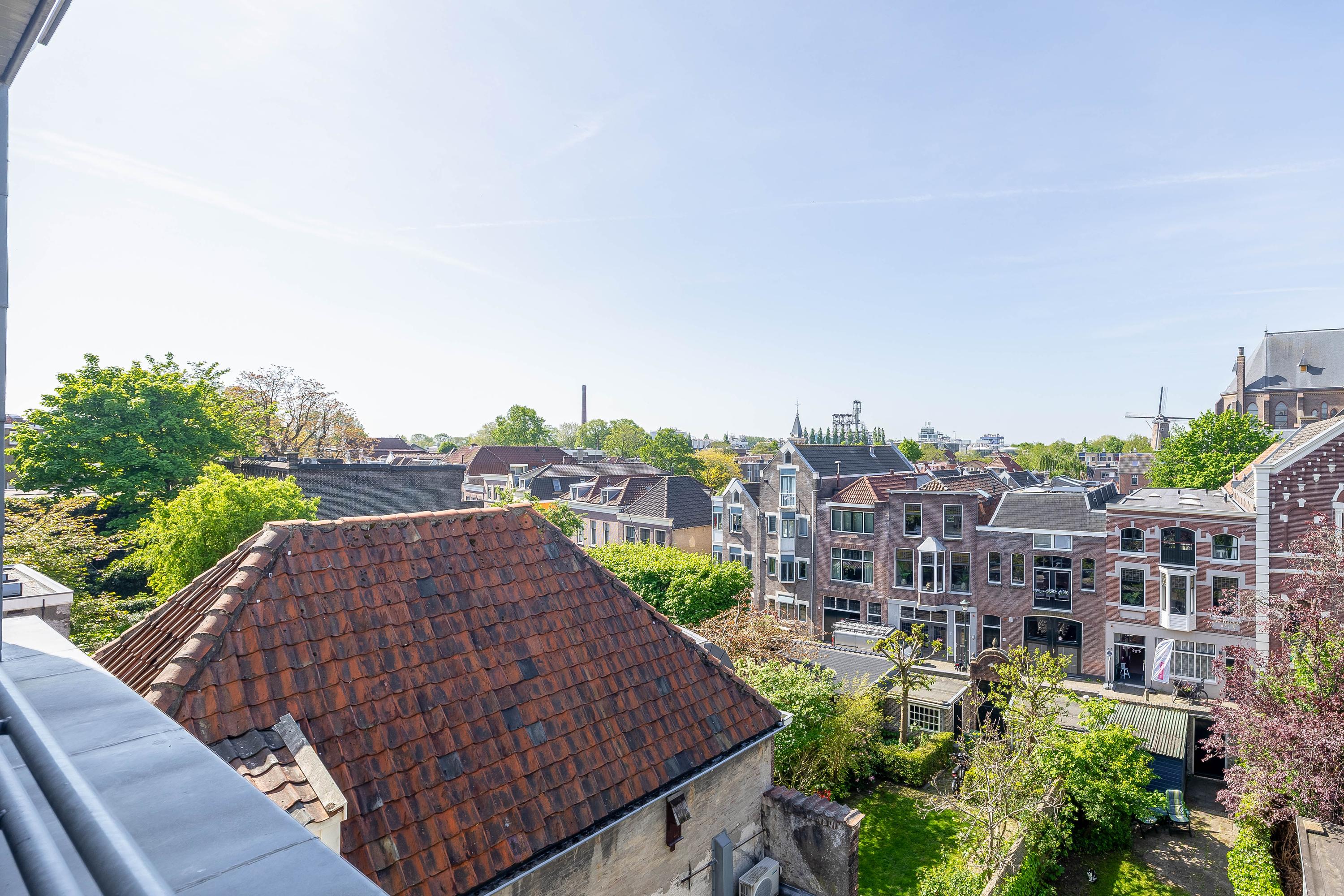 Rear bedroom with new rear façade and door to terrace with stunning view over the historic buildings of Gouda’s city center, bedroom with built-in wardrobe, air conditioning, boiler room, and front bedroom with view of the museum and St. John’s Church