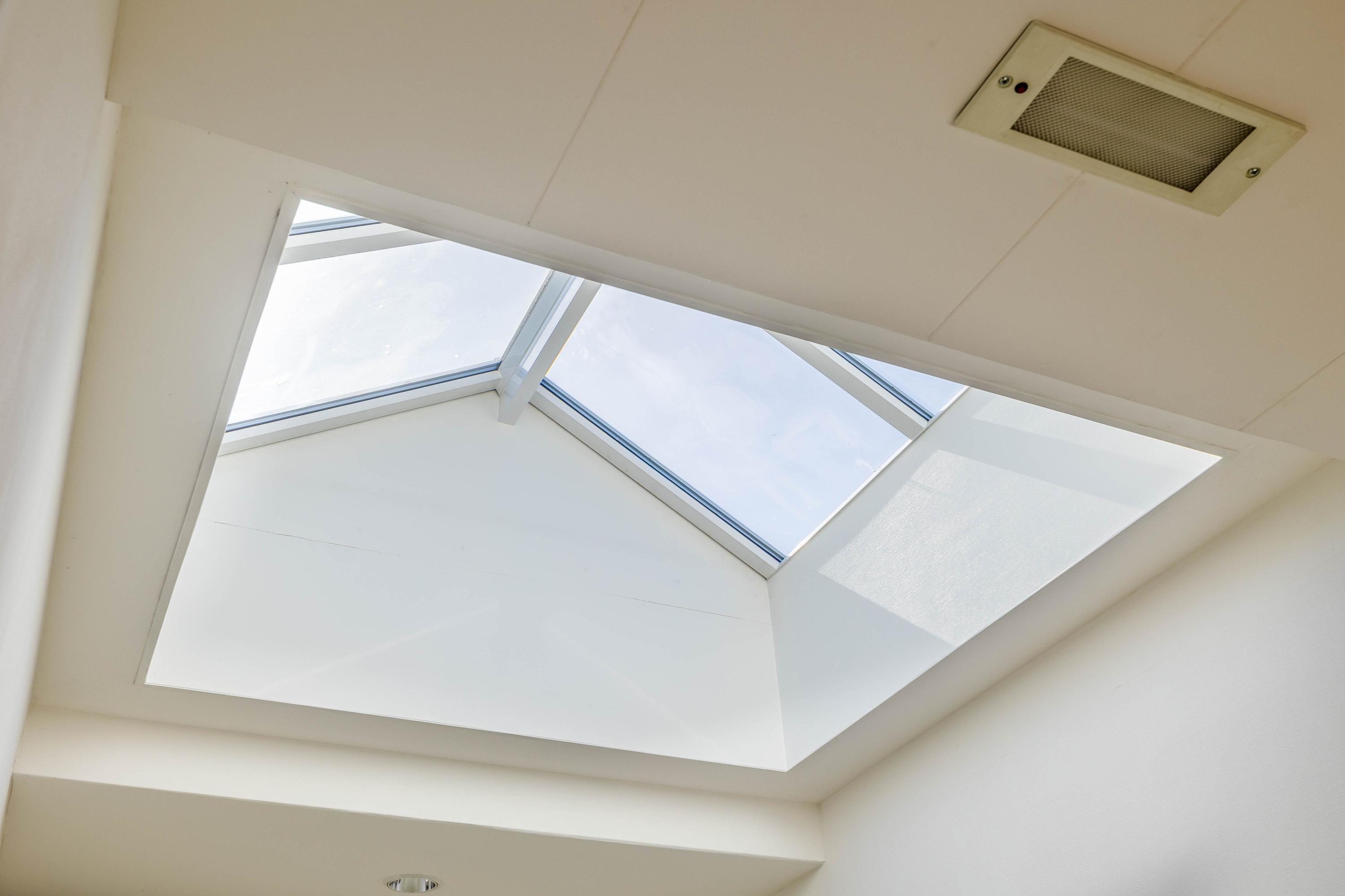 Spacious landing with roof light, laminate flooring, toilet (wall-mounted toilet and small sink), bright bathroom with walk-in shower, bathtub, sink, windows, fully tiled, and designer radiator
