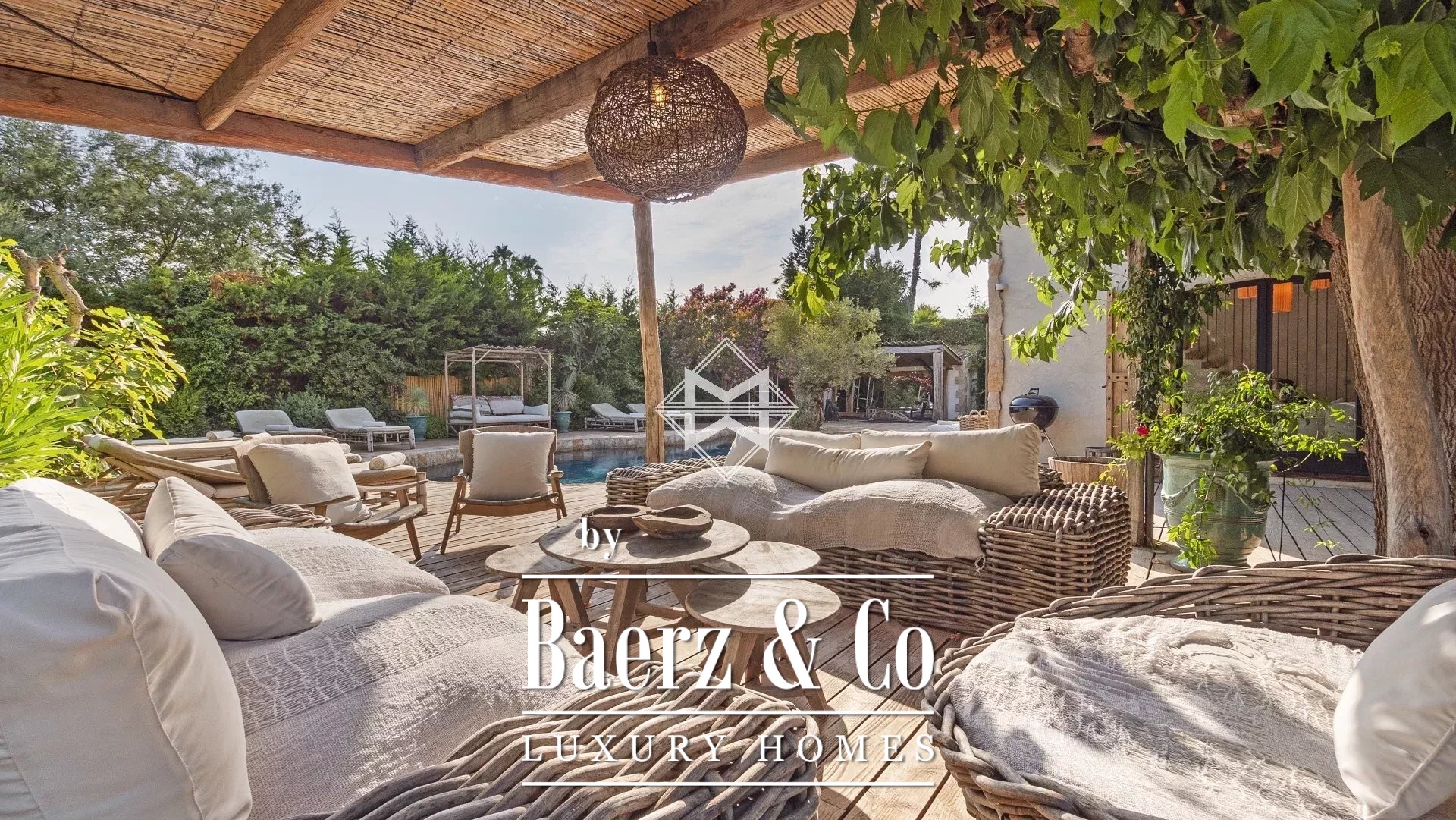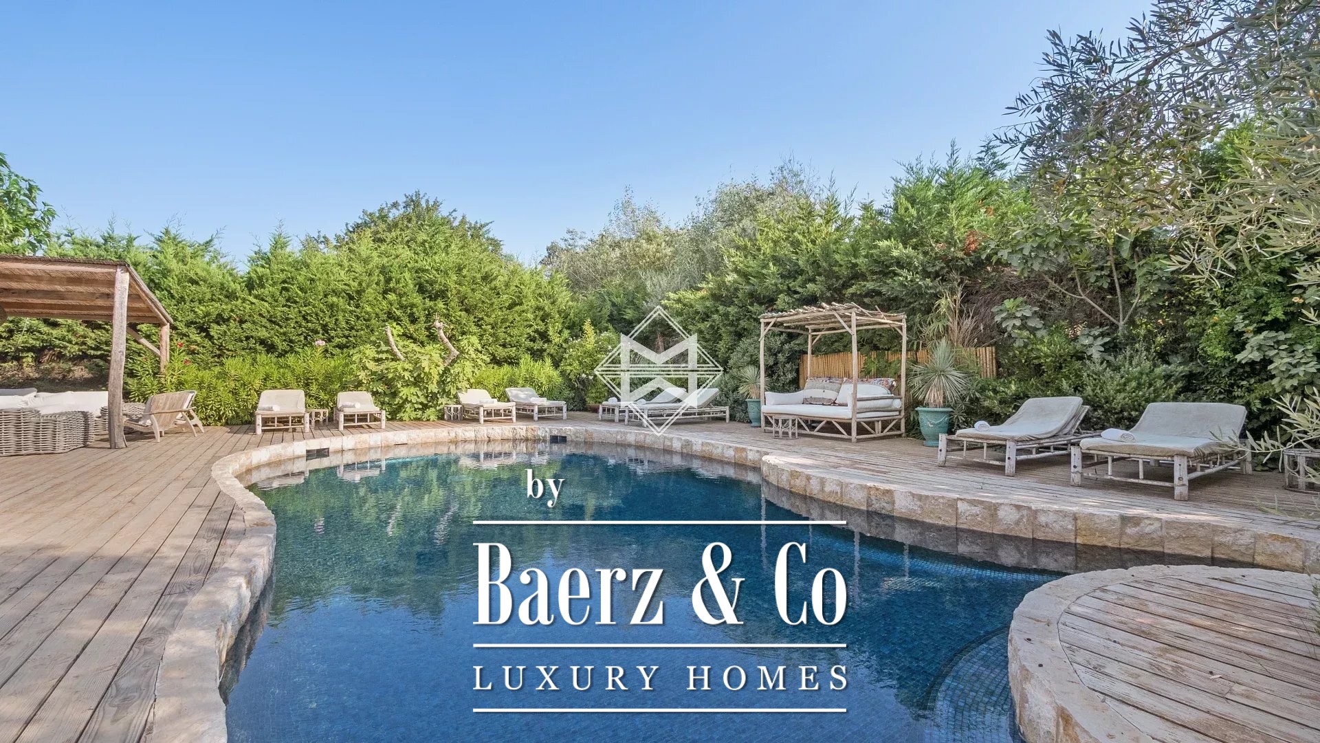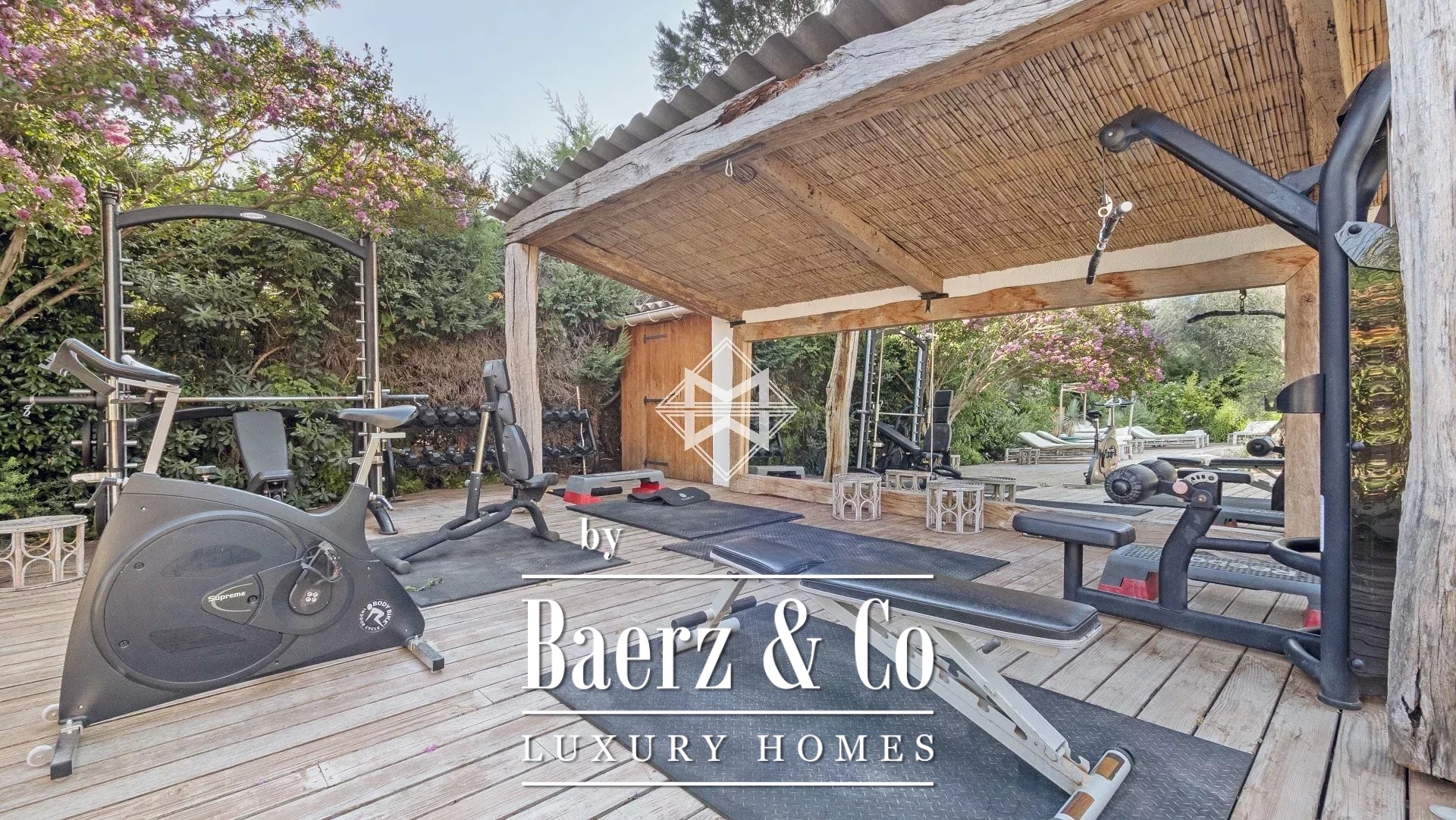 Outdoors, a heated swimming pool stands at the heart of the grounds, bordered by spaces for leisure and activity: a pétanque court, outdoor gym, mini football field, tennis table, and atmospheric lighting. Meticulous security, with an alarm system, cameras, and individual bedroom safes, ensures privacy. Parking accommodates up to six vehicles, reflecting practical luxury. This villa Grimaud is a testament to careful curation, offering a lifestyle of understated elegance and serene connection with its garden surroundings.