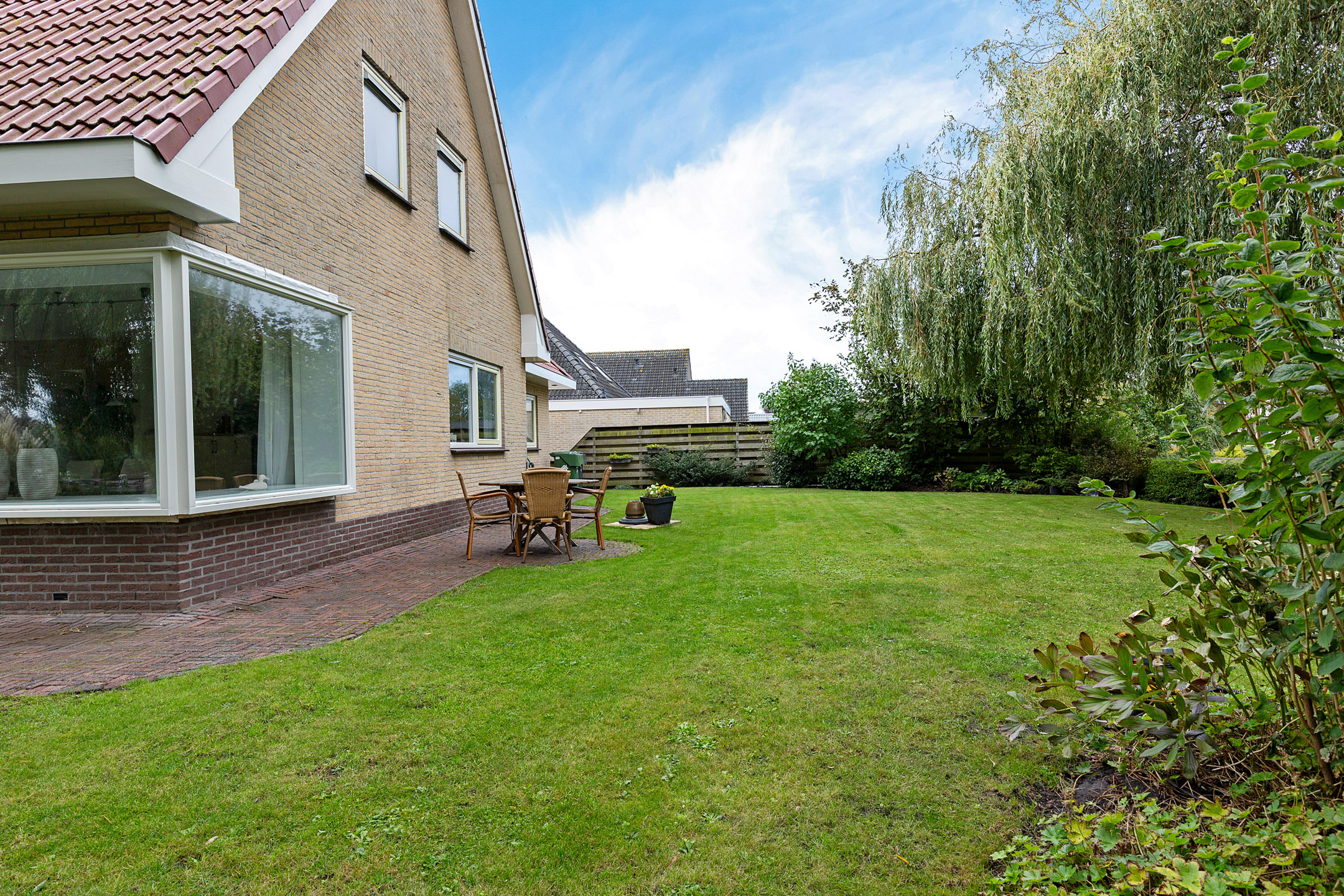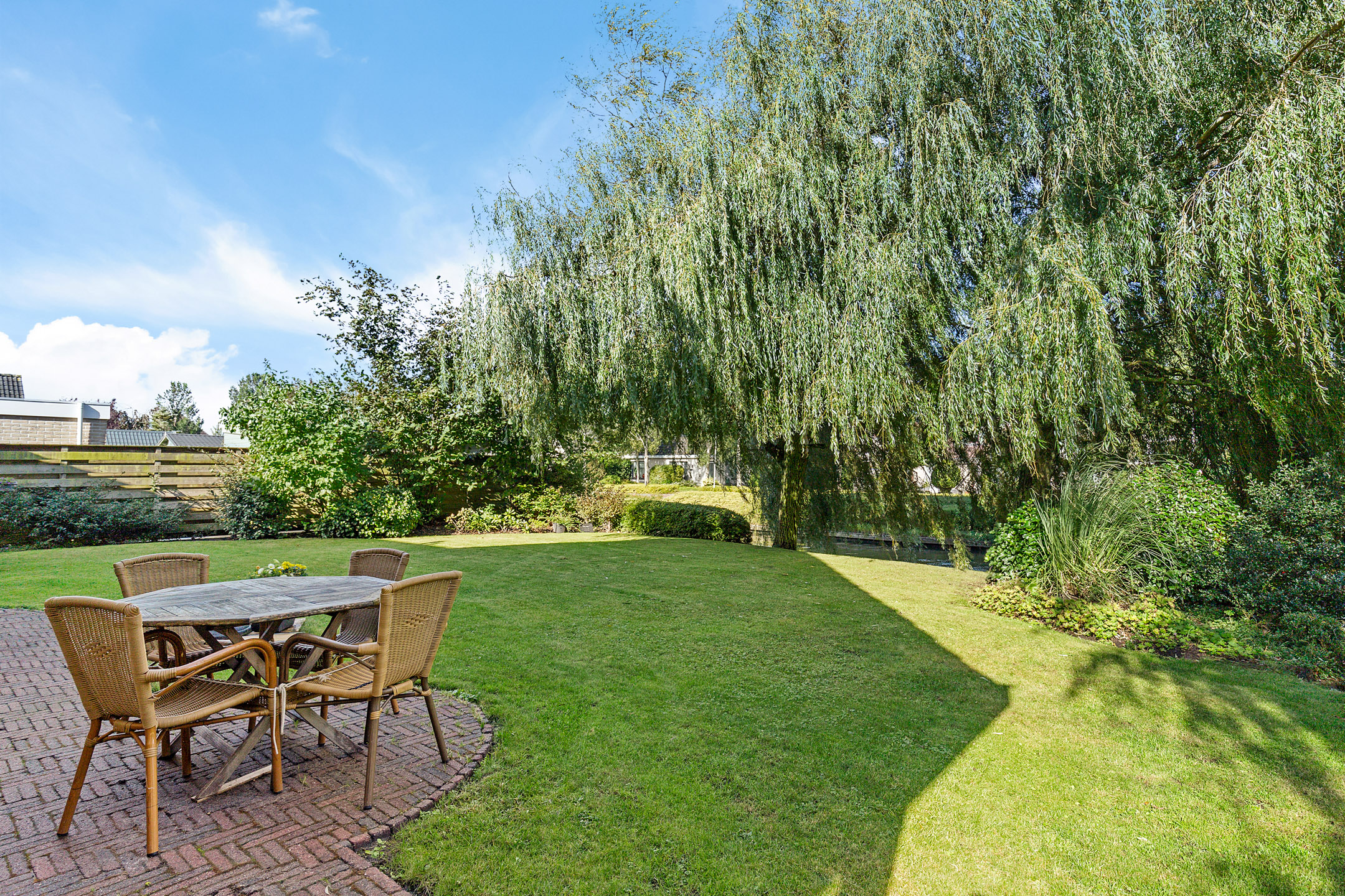 The beautifully landscaped garden with mature trees, shrubs, borders, and terraces ensures privacy and offers both sunny and shaded spots throughout the day. A sunken south-east facing terrace directly on the water, complete with a private swimming ladder, is the perfect place to enjoy your morning coffee or relax all day while watching boats pass by. The waterway is a branch of the famous *Bolswardervaart*, part of the historic Eleven Cities Route, and is accessible by boat.