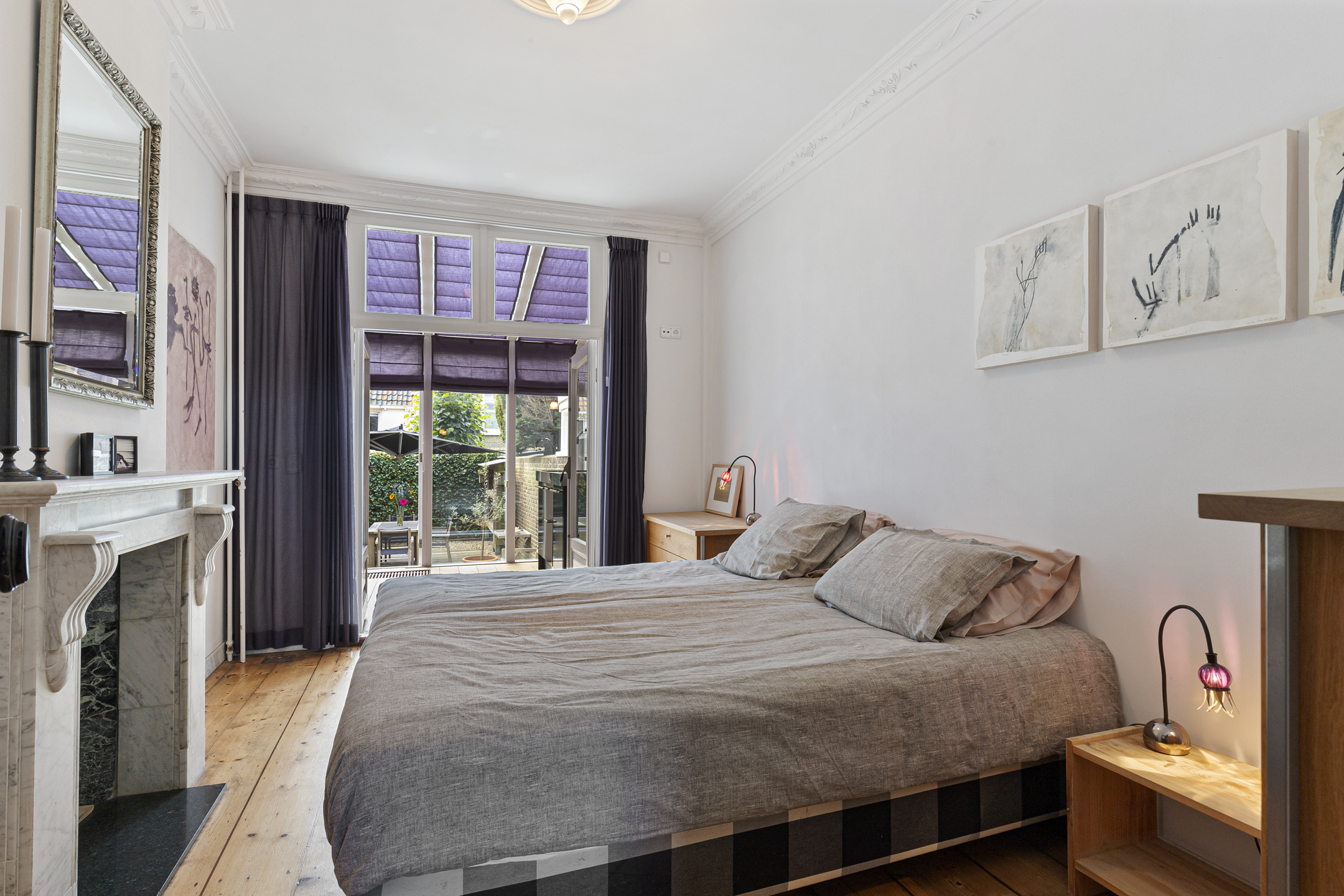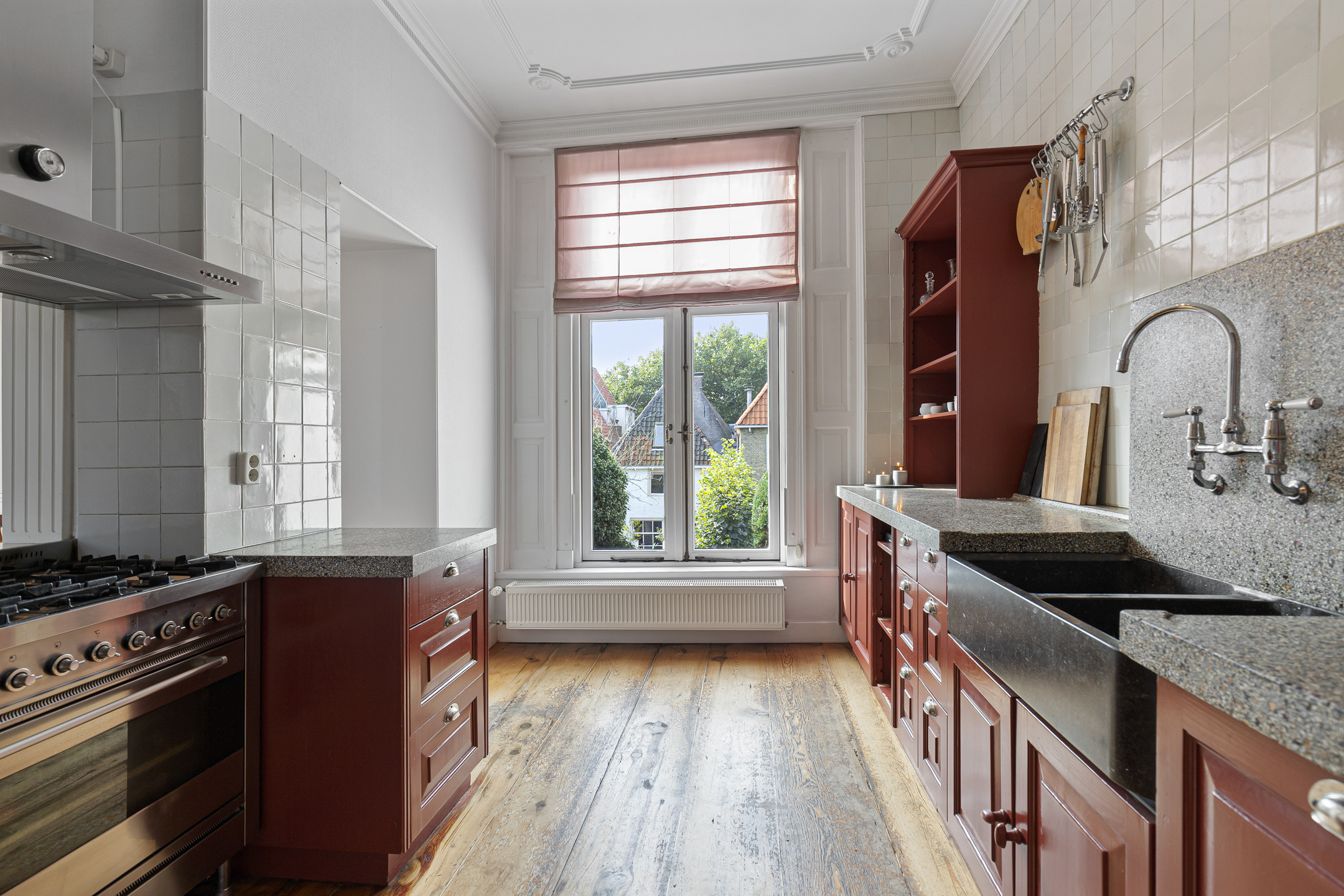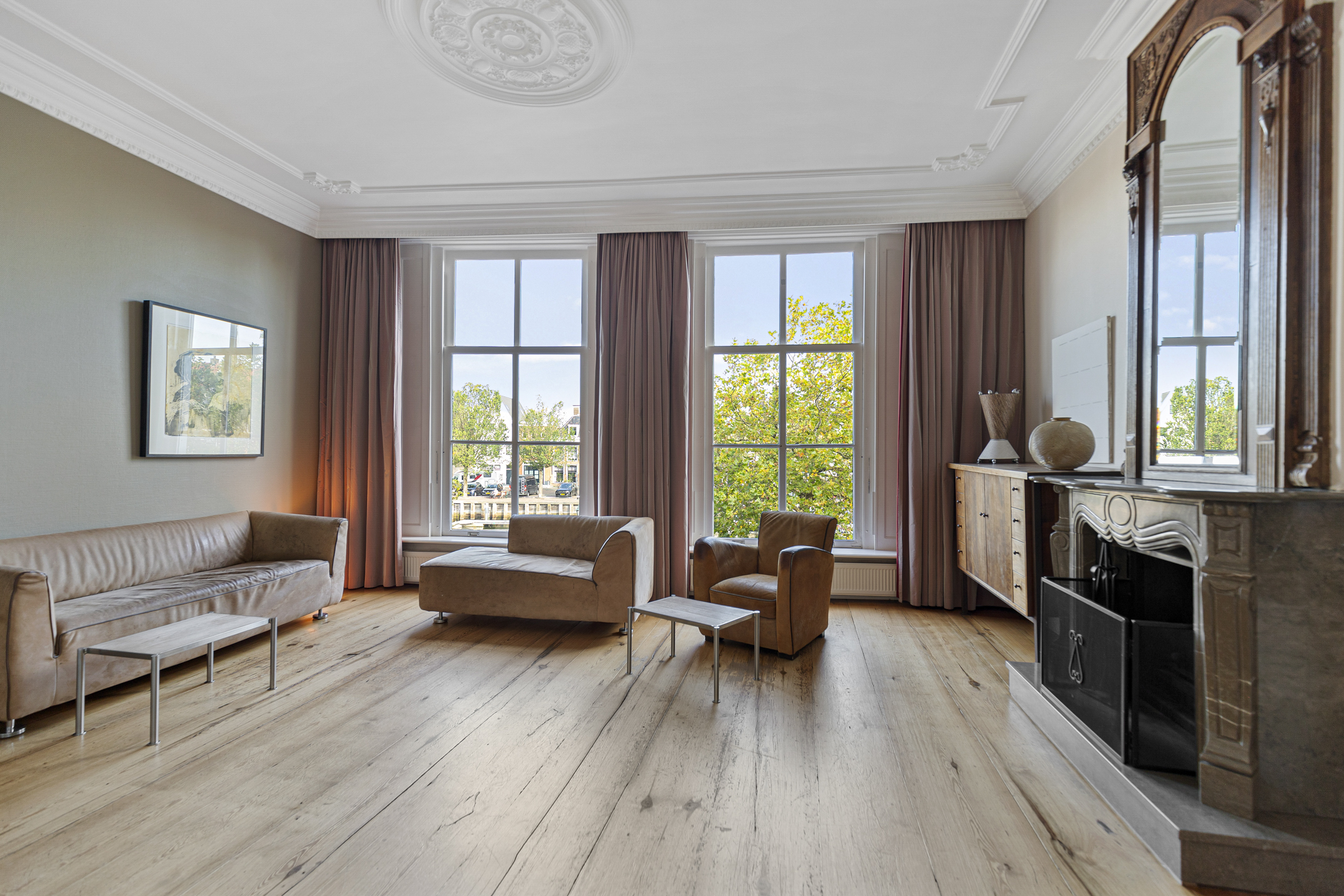 The bel étage features a refined office with vistas over the water and an expansive garden suite opening onto a private south-facing city garden. Living and dining spaces are arranged with reverence for historic detail—ornamental ceilings, antique wooden floors, marble fireplaces, and an authentic kitchen adorned with traditional Frisian tiles. The recently insulated and renewed roof, completed in 2015, harmonizes comfort with provenance.