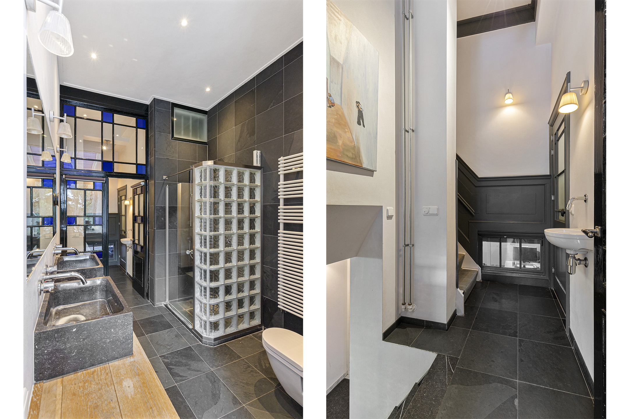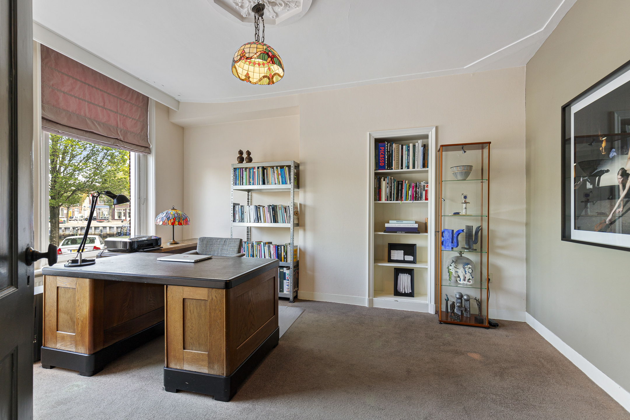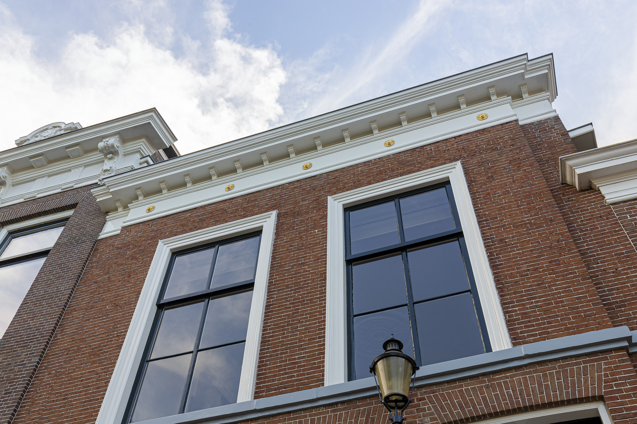 The bel étage features a refined office with vistas over the water and an expansive garden suite opening onto a private south-facing city garden. Living and dining spaces are arranged with reverence for historic detail—ornamental ceilings, antique wooden floors, marble fireplaces, and an authentic kitchen adorned with traditional Frisian tiles. The recently insulated and renewed roof, completed in 2015, harmonizes comfort with provenance.