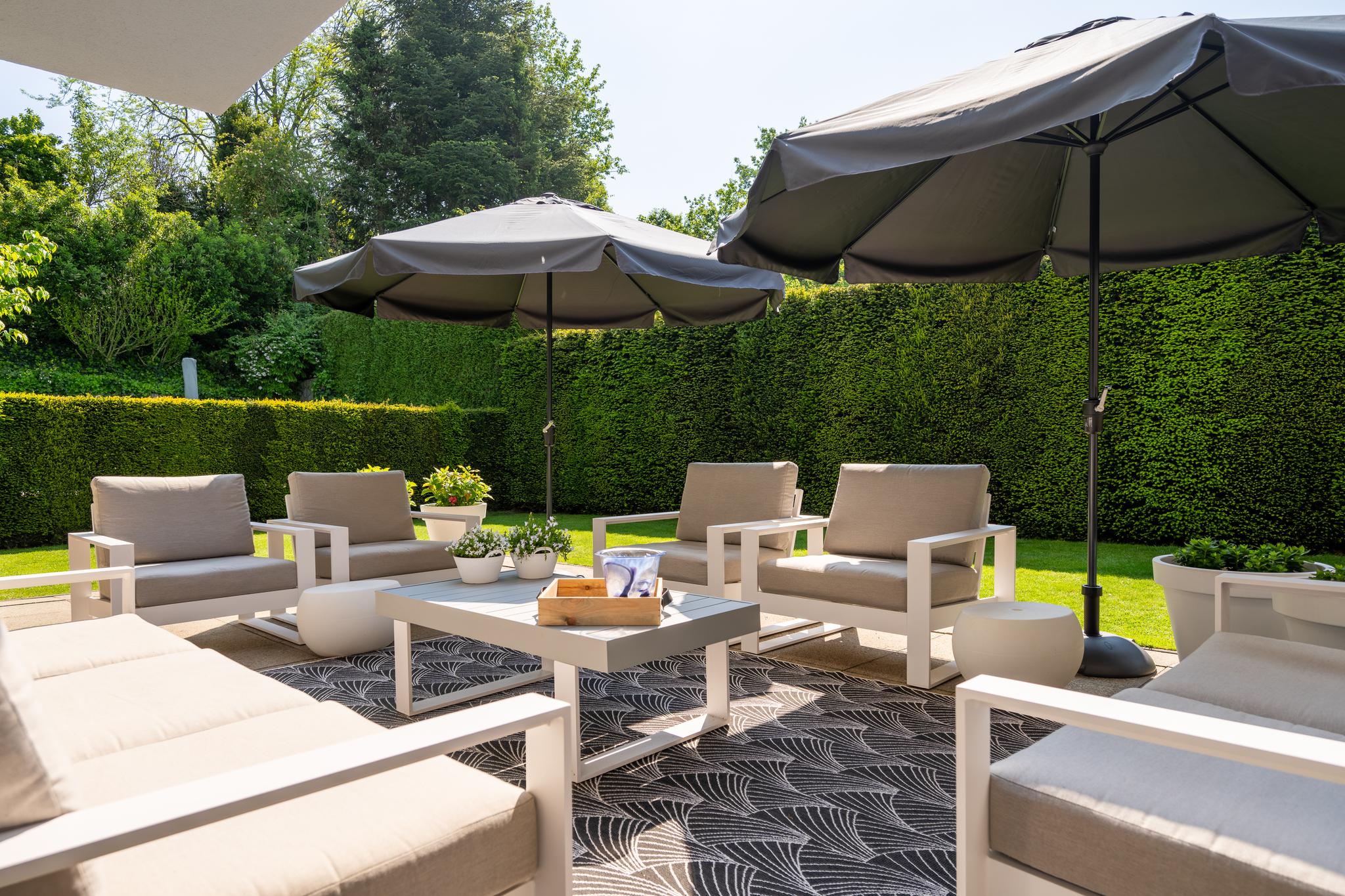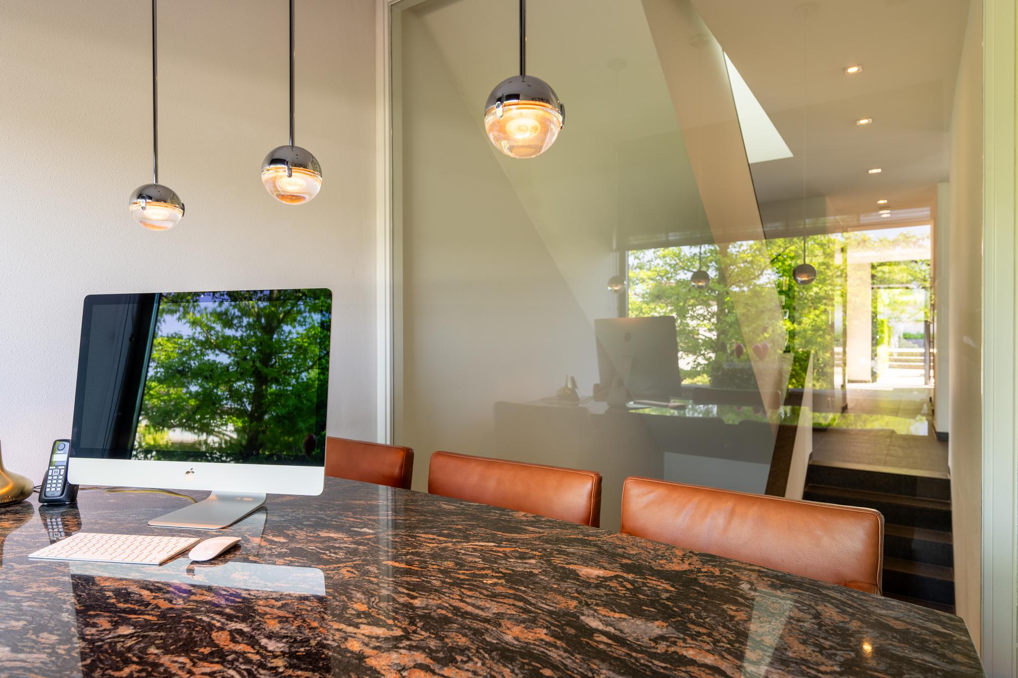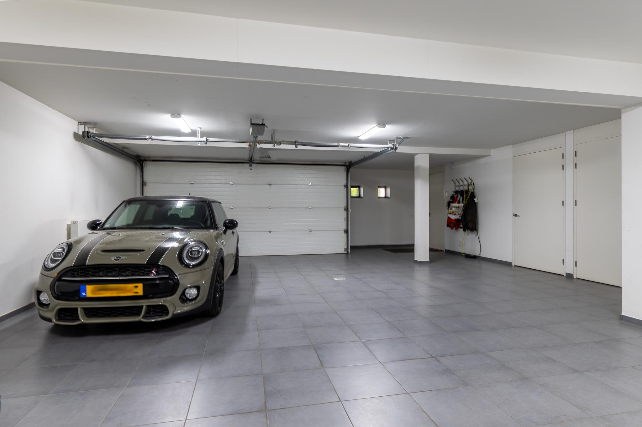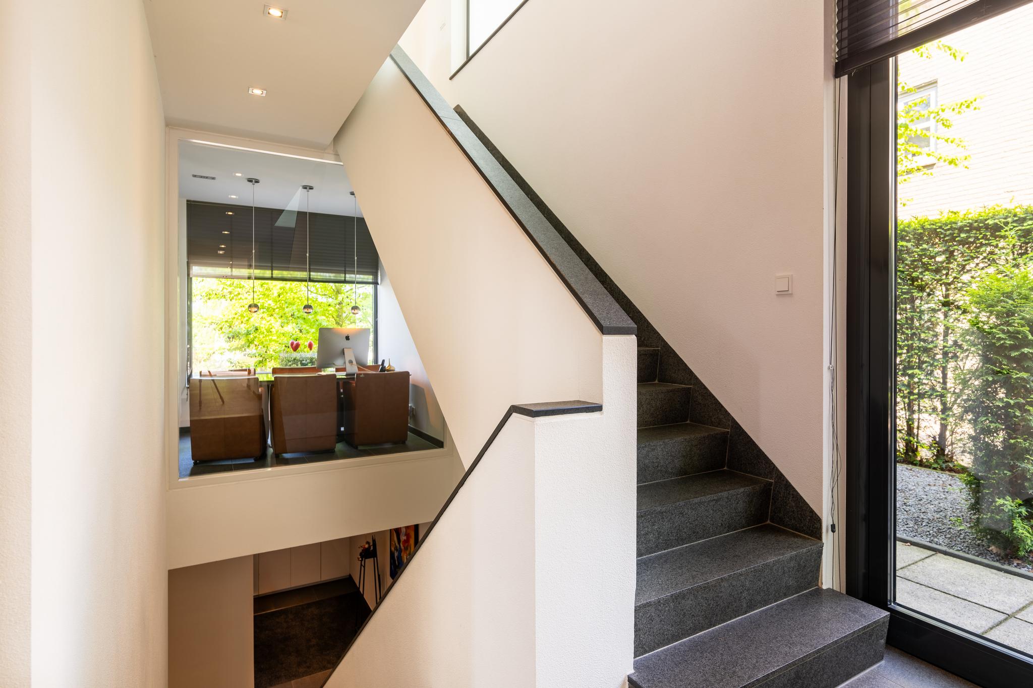 Via the spacious driveway, access is provided to the garage and covered entrance. The driveway is paved and offers space for parking multiple vehicles. Video intercom and mailbox. The entrance hall features built-in wardrobe cabinets, a utility meter cupboard, and access to the garage. Centrally located in the hall is a stately staircase leading to the living areas and the upper floor. The staircase is concrete with natural stone-finished steps. From the hall, the laundry room is accessible; it is equipped with a counter combination and connections for laundry machine. This room has a large glass sliding door, providing access to the patio and allowing ample daylight to enter. Adjacent is the studio space, which also offers access to the patio through a large glass door. The tranquility of the patio and the beautiful light make it a pleasant workspace. Behind this area is a spacious storage room. The garage accommodates multiple cars and has an extra-wide sectional door with an adjacent separate access door. Space for wine storage, a technical room with connections for the HR combi boiler (owned) and a reservoir for the central vacuum system. Storage space for waste/paper containers and an inverter for the solar panels.