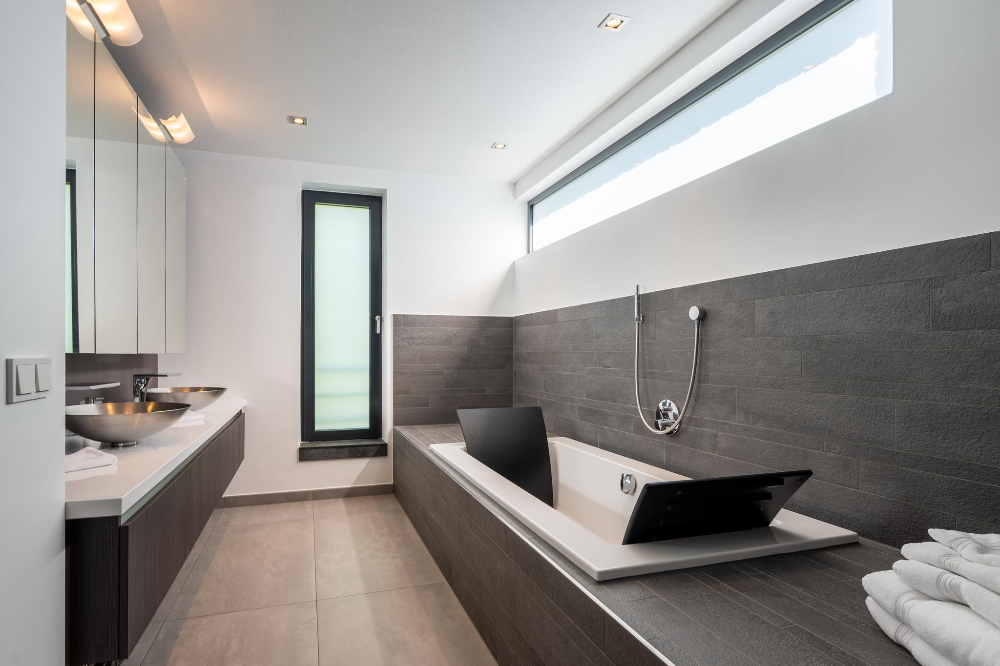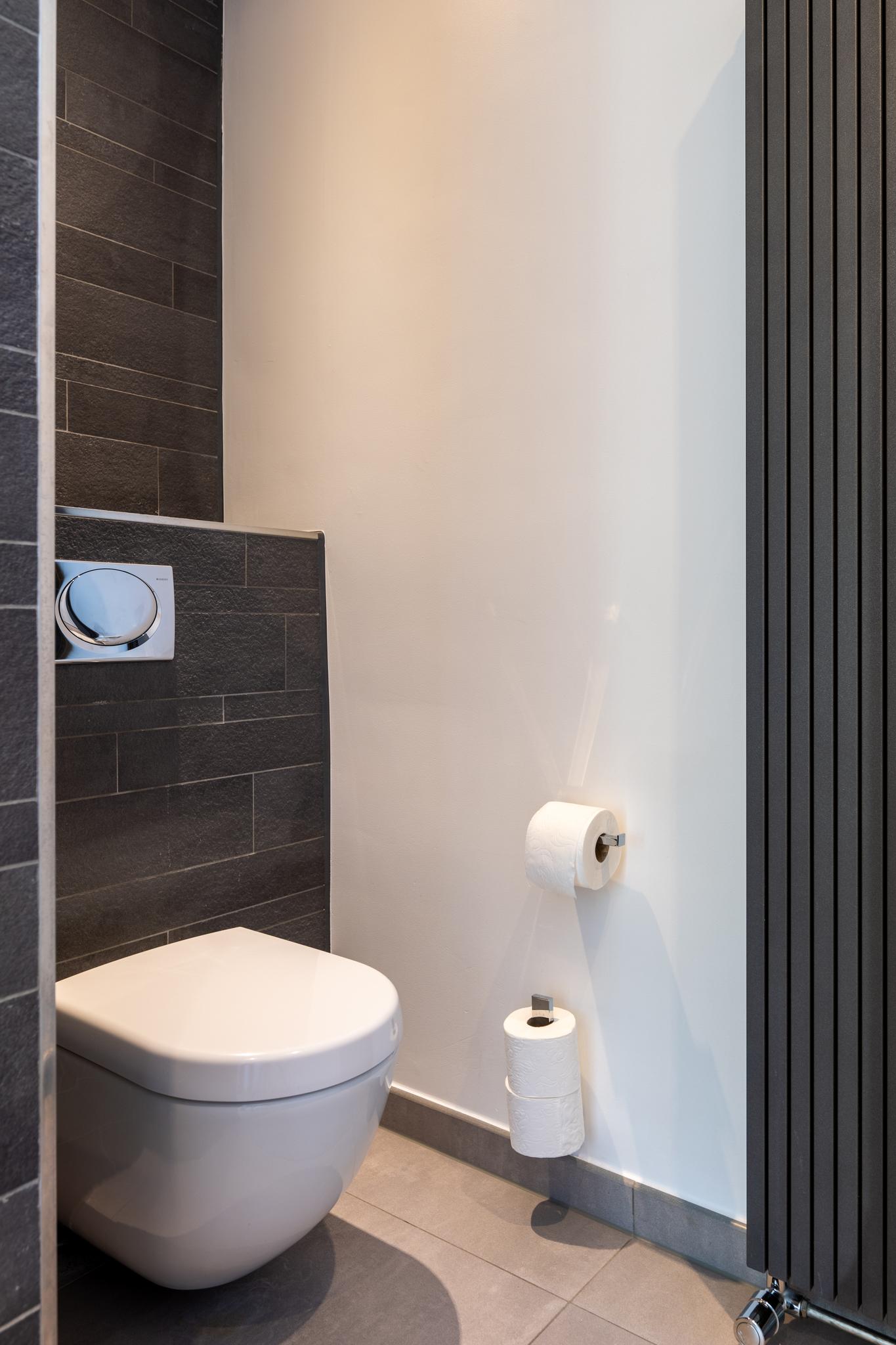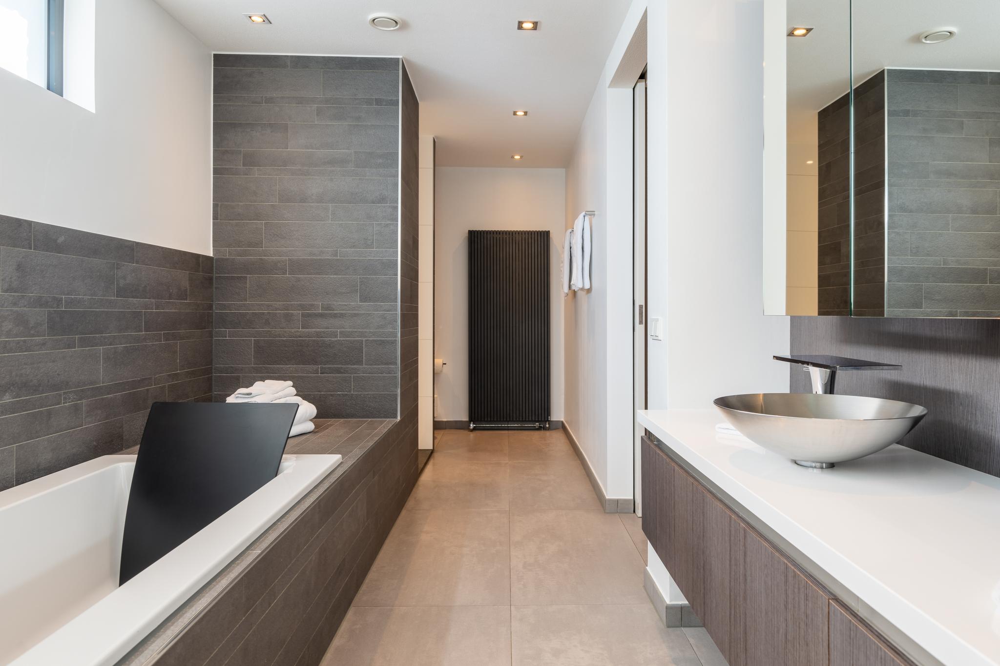 Generous distribution hall to the various living areas and access door to the side of the house. Fully tiled toilet room with free-hanging toilet, urinal, and design fountain. Laundry chute to the laundry room below. Via the double glass pivot doors, access to the living room. The playfully arranged living room is divided into various interconnected open spaces. At the front, a large panoramic window offers a view over "Douve Weien," with the lines of the Heuvelland visible in the distance. Centrally located in the living room is the fireplace with a gas fire, and from the spacious dining room, the sun terrace at the front is accessible. At the front, with access to the living room, the office space is situated. At the garden side, there is a cozy sitting area with access to the garden through large glass sections. Fully oriented towards the garden, the beautiful living kitchen is located, where indoor and outdoor spaces can merge by opening the large glass sections. The high-quality kitchen installation in wall and island configuration features granite worktops and the following "Miele" built-in appliances: microwave, steam oven, convection oven, refrigerator, freezer, dishwasher, stainless steel extractor hood, and induction cooktops (Smeg) with gas wok burner (Smeg). The entire living floor is finished with natural stone flooring with underfloor heating.