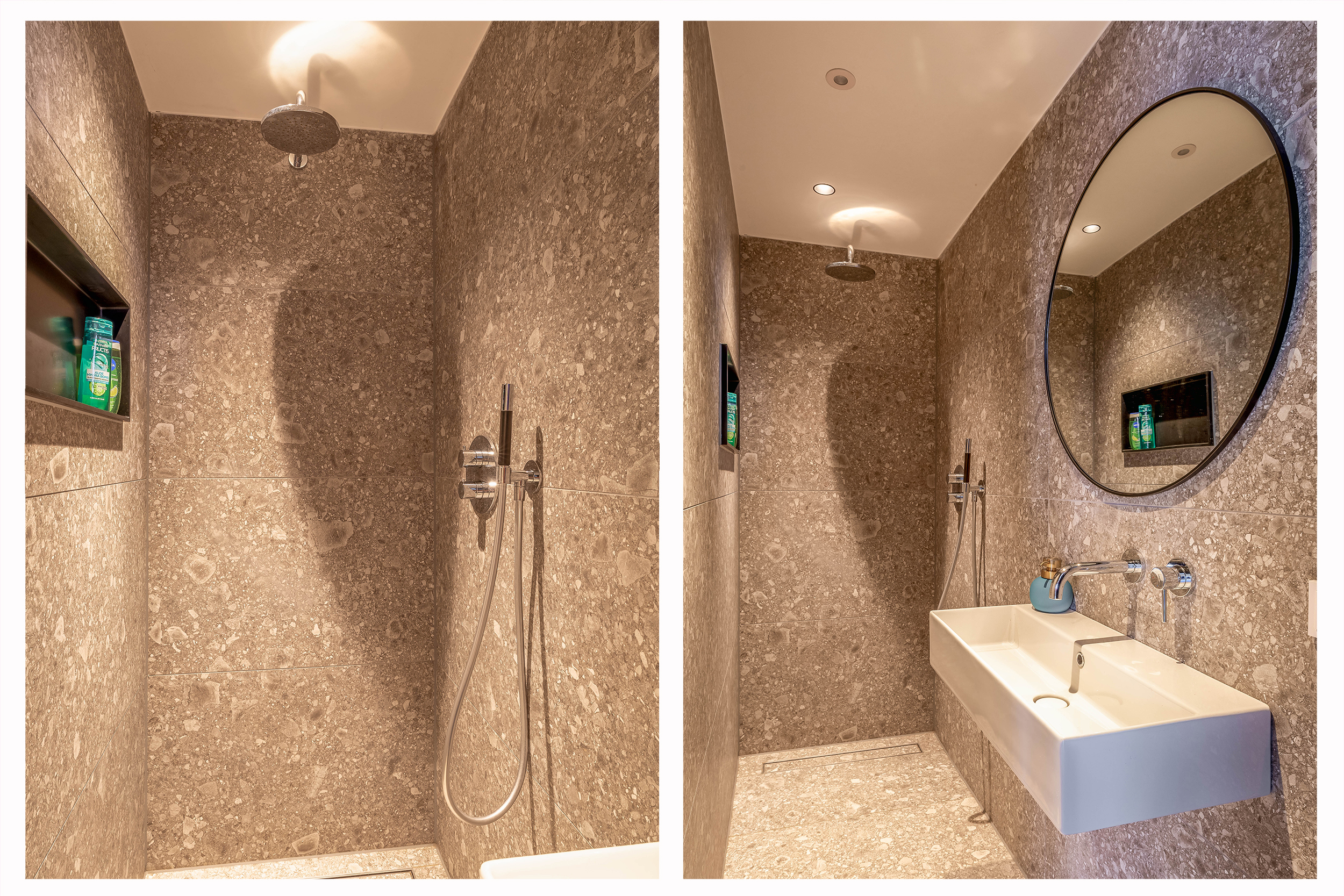 The adjacent (fully insulated) garden shed, with a high continuous ceiling, is perfect for use as a chill-out space, studio, or extra office. The garden shed is styled in harmony with the house. The garden, landscaped by an architect, is a true work of art with rich borders, elegant hedges, atmospheric pathways, and lush lawns. The carefully chosen boundary walls and playful materials create a dynamic and inviting outdoor experience. Not to mention the water paradise, which flows into a rustic pond area, creating a perfect balance between luxury and nature.