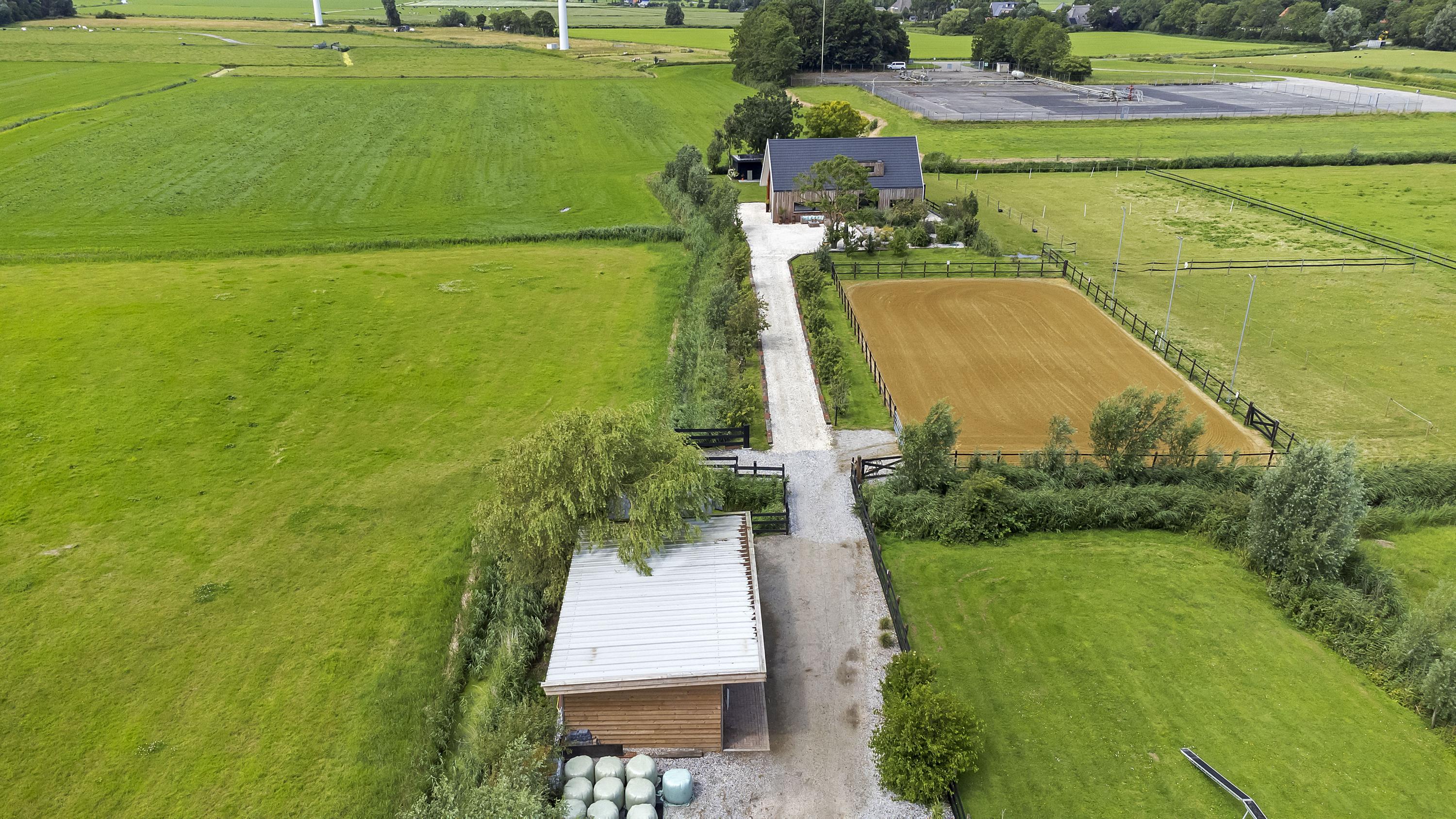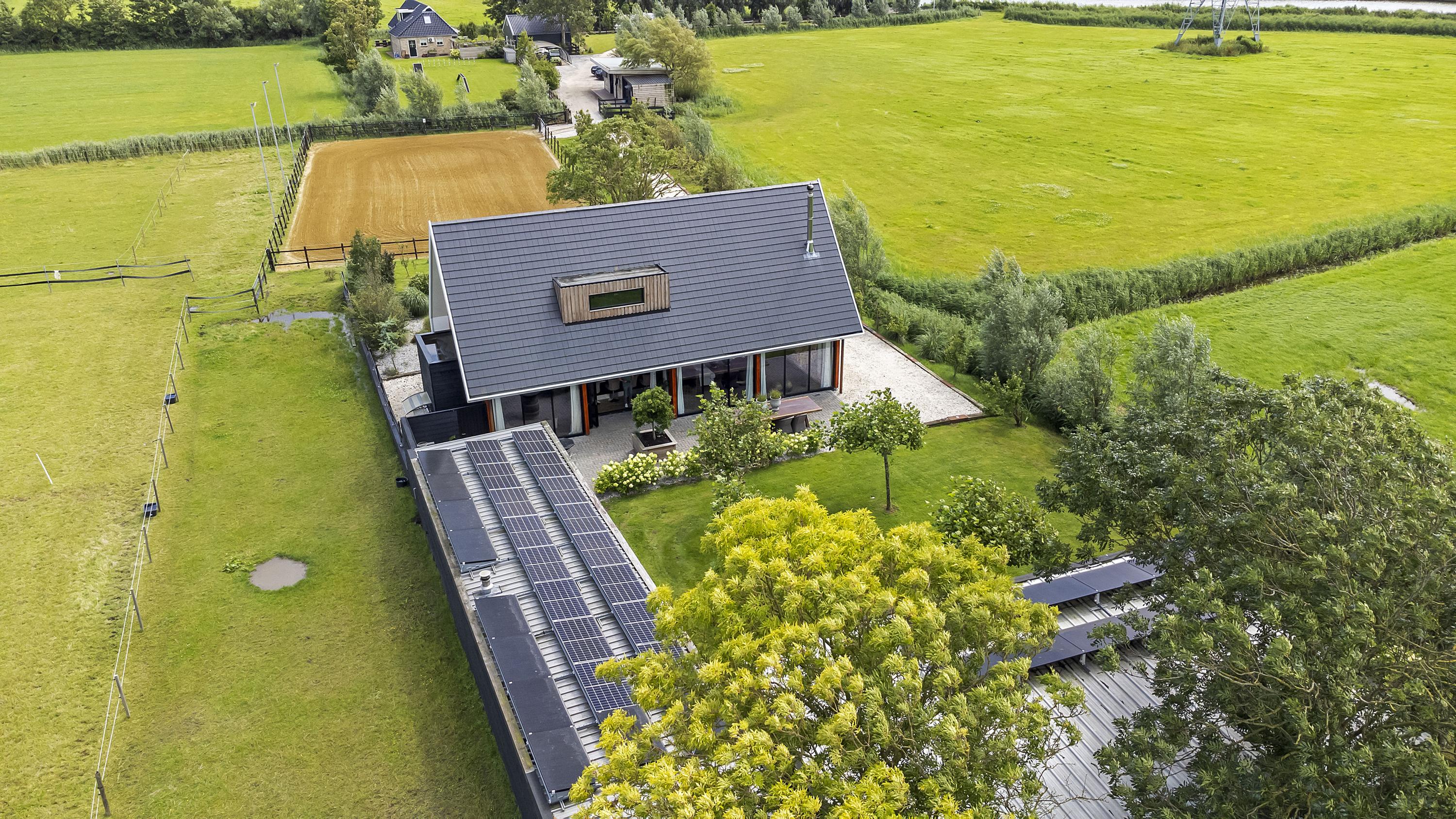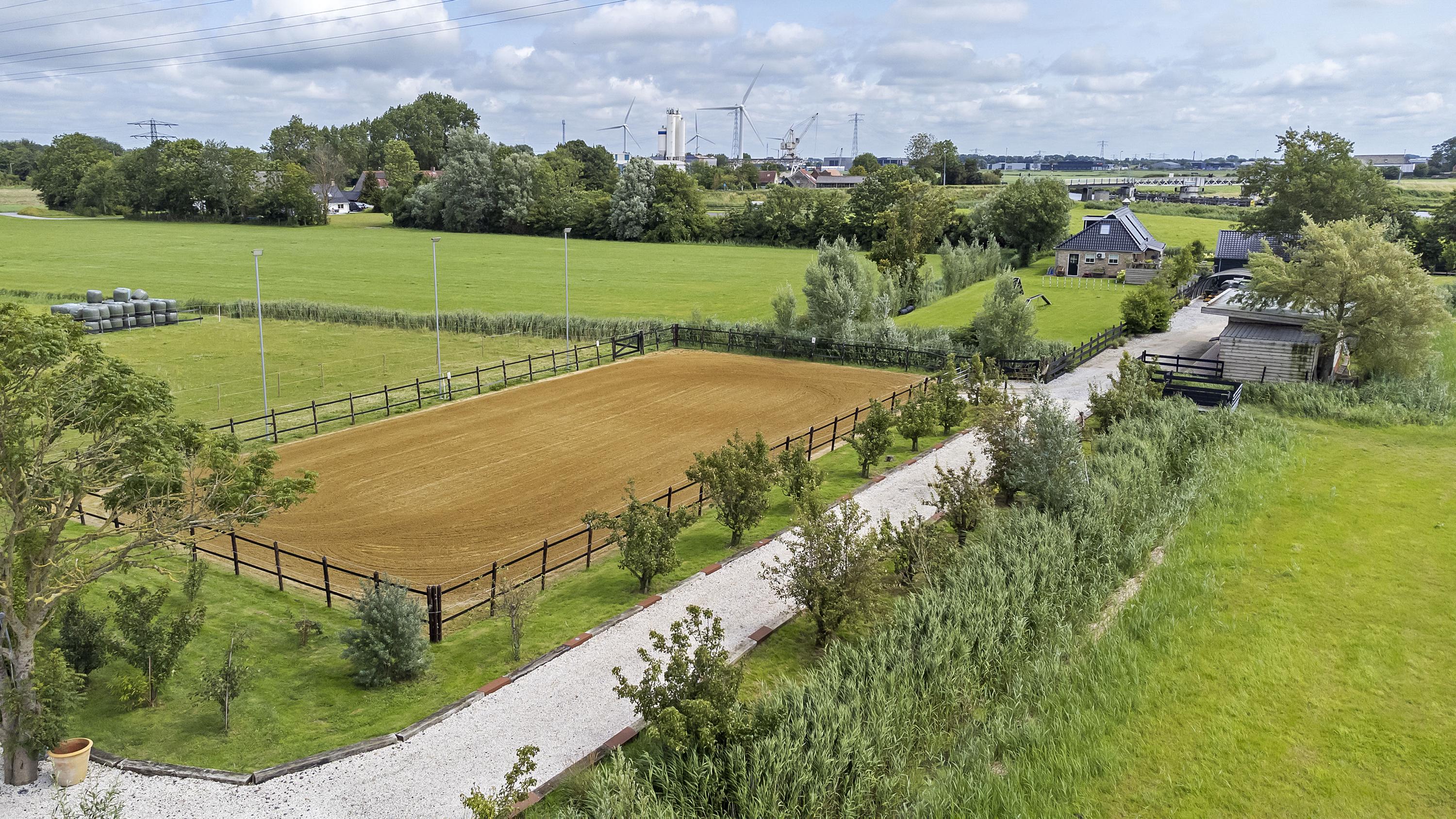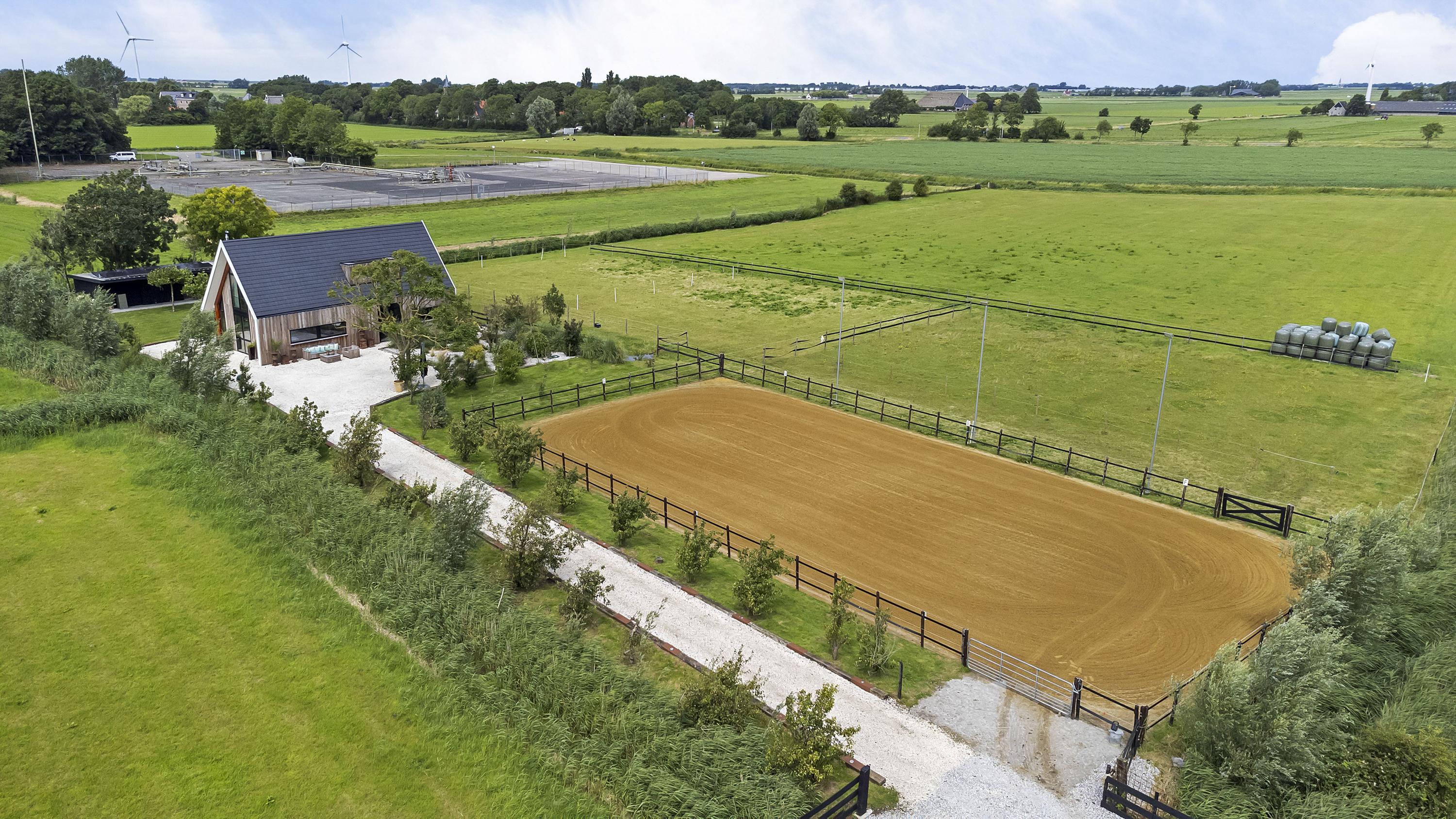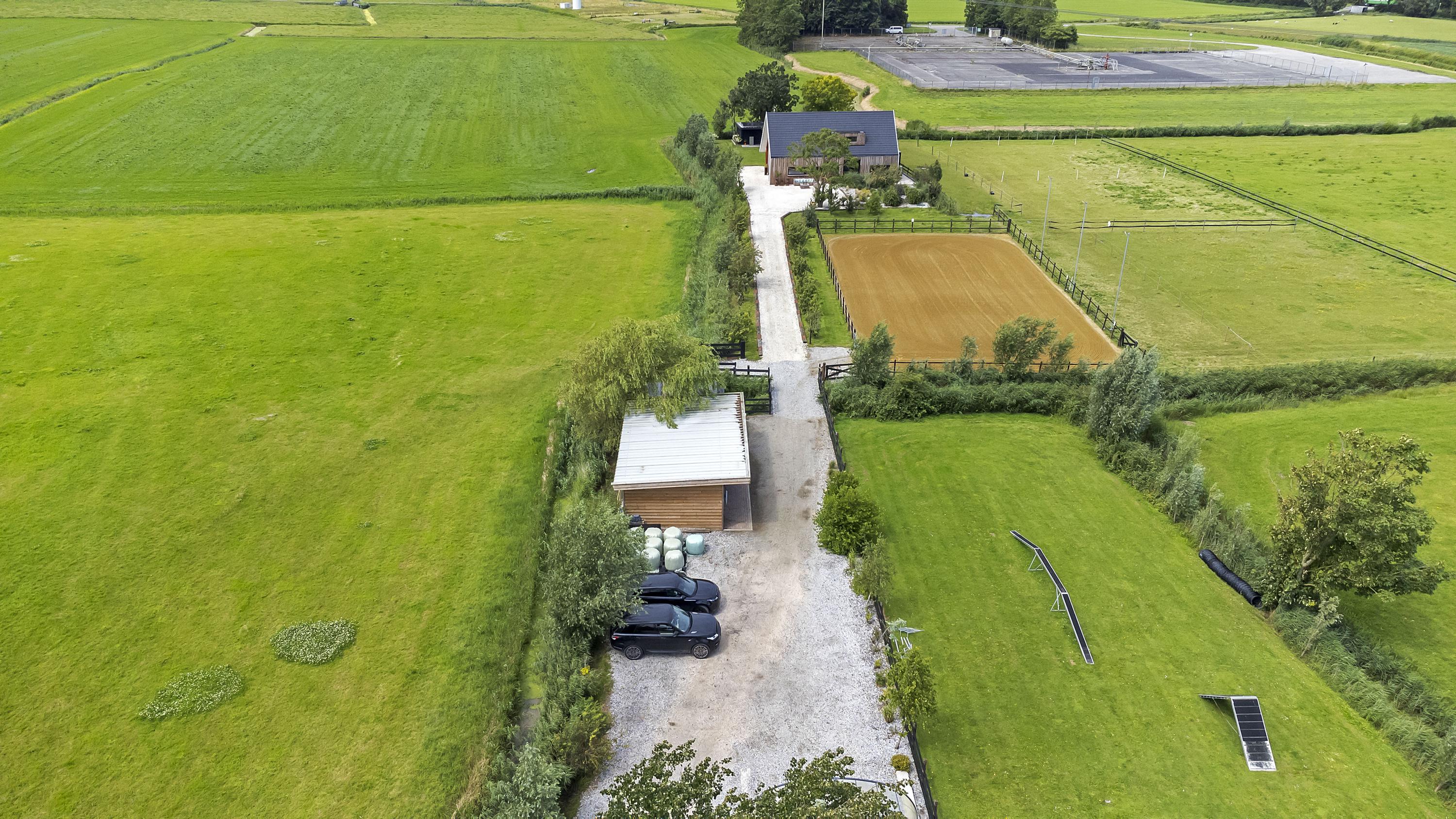 The driveway to the house, garages, and stable is covered with gravel with flower borders edged with corten steel and garden lighting. There is ample parking on the property, both at the stables and the house, for multiple cars. The garden directly around the house has several terraces in sun and shade, offering beautiful views from all angles over varying natural areas and the passing sailboats, pleasure yachts, and commercial vessels. The sheltered courtyard garden with the 4 linden trees, beautiful lighting, and outdoor kitchen offers the utmost privacy. There are many types of fruit trees, berry bushes, shrubs, and flower borders in the garden. The over 1.7 ha meadow, bordered by a ditch, has two access points and is located directly behind the stables along the Van Harinxmakanaal. In the current situation, the horses graze on the plot behind the house, but in the new situation, due to land consolidation, this will change to the front (canal and view side) of the house. The 20x40 riding arena is well-drained and equipped with a soft surface and lighting.