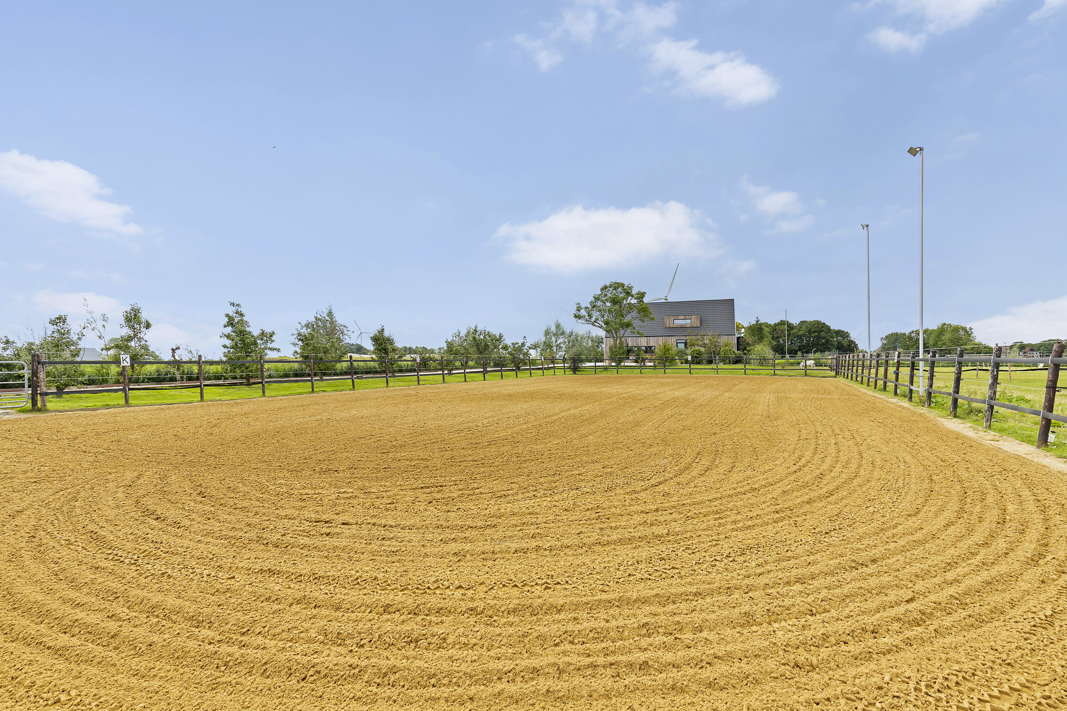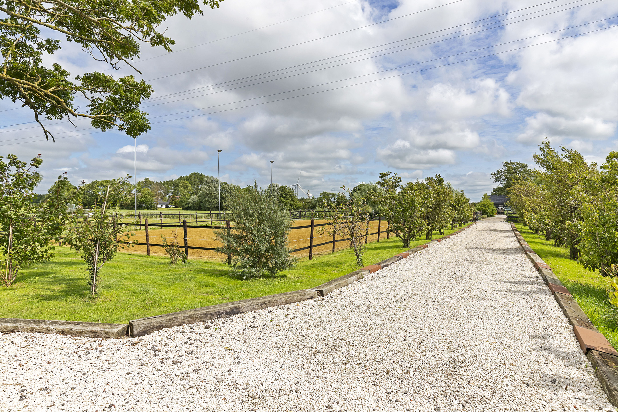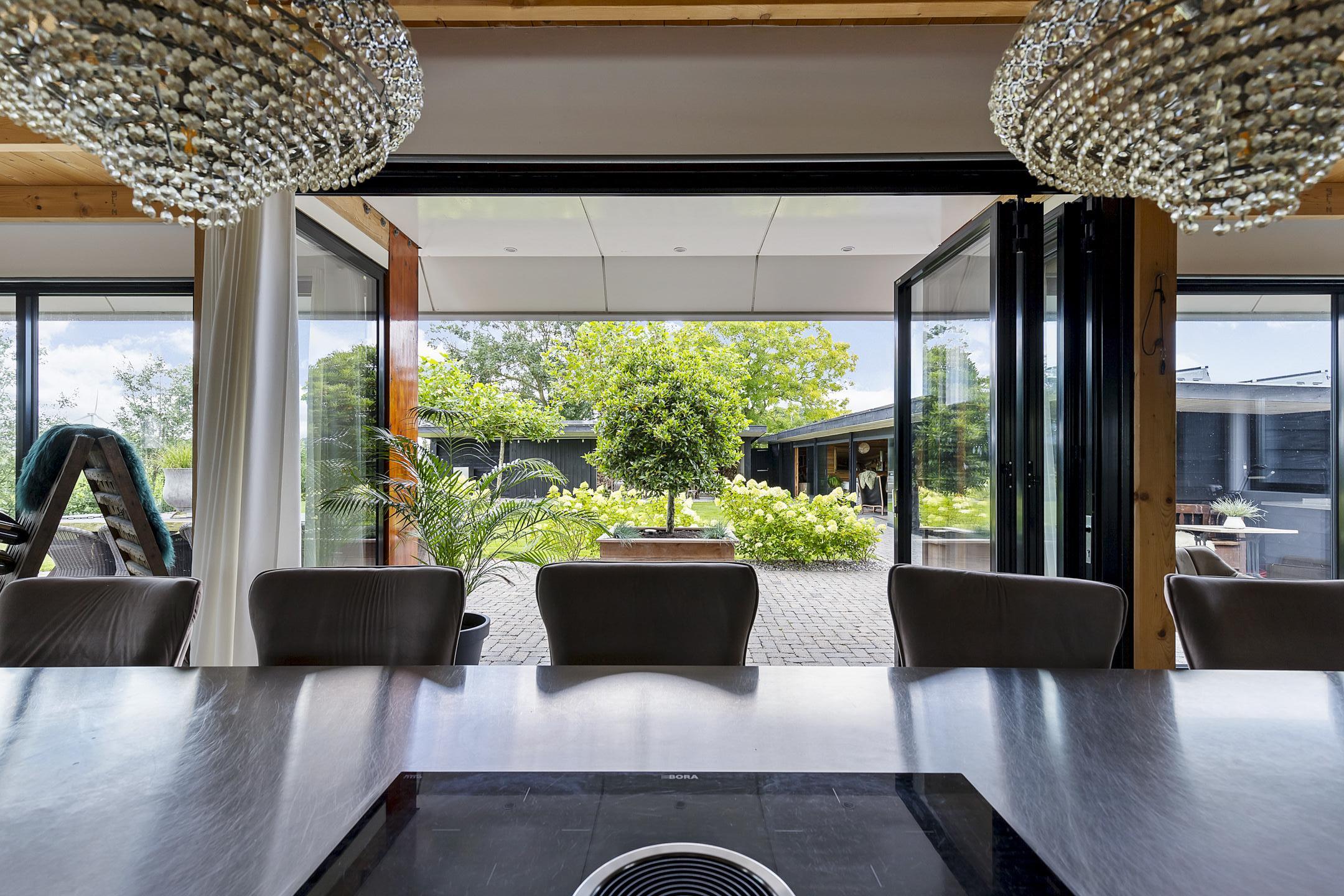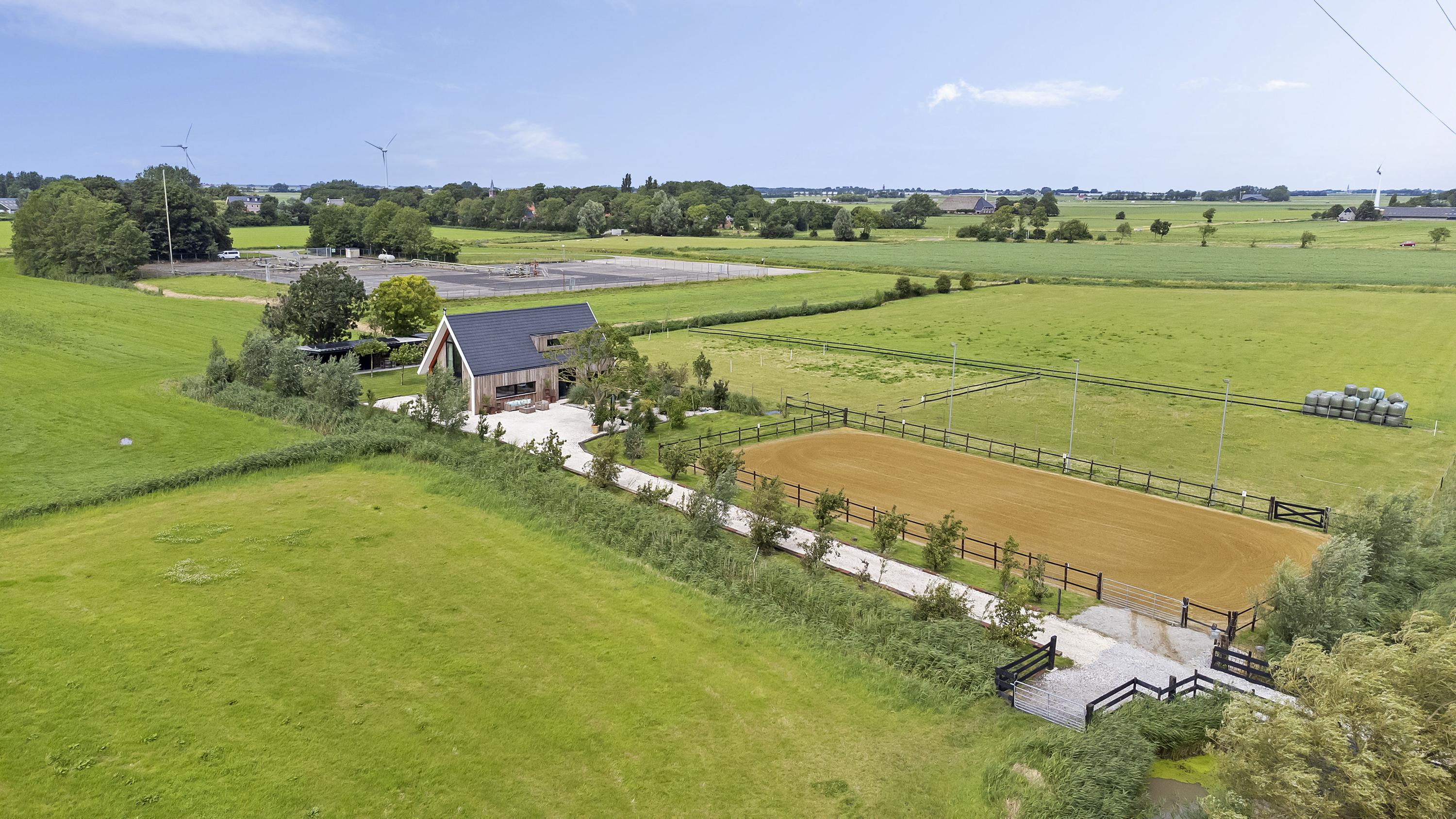 The driveway to the house, garages, and stable is covered with gravel with flower borders edged with corten steel and garden lighting. There is ample parking on the property, both at the stables and the house, for multiple cars. The garden directly around the house has several terraces in sun and shade, offering beautiful views from all angles over varying natural areas and the passing sailboats, pleasure yachts, and commercial vessels. The sheltered courtyard garden with the 4 linden trees, beautiful lighting, and outdoor kitchen offers the utmost privacy. There are many types of fruit trees, berry bushes, shrubs, and flower borders in the garden. The over 1.7 ha meadow, bordered by a ditch, has two access points and is located directly behind the stables along the Van Harinxmakanaal. In the current situation, the horses graze on the plot behind the house, but in the new situation, due to land consolidation, this will change to the front (canal and view side) of the house. The 20x40 riding arena is well-drained and equipped with a soft surface and lighting.