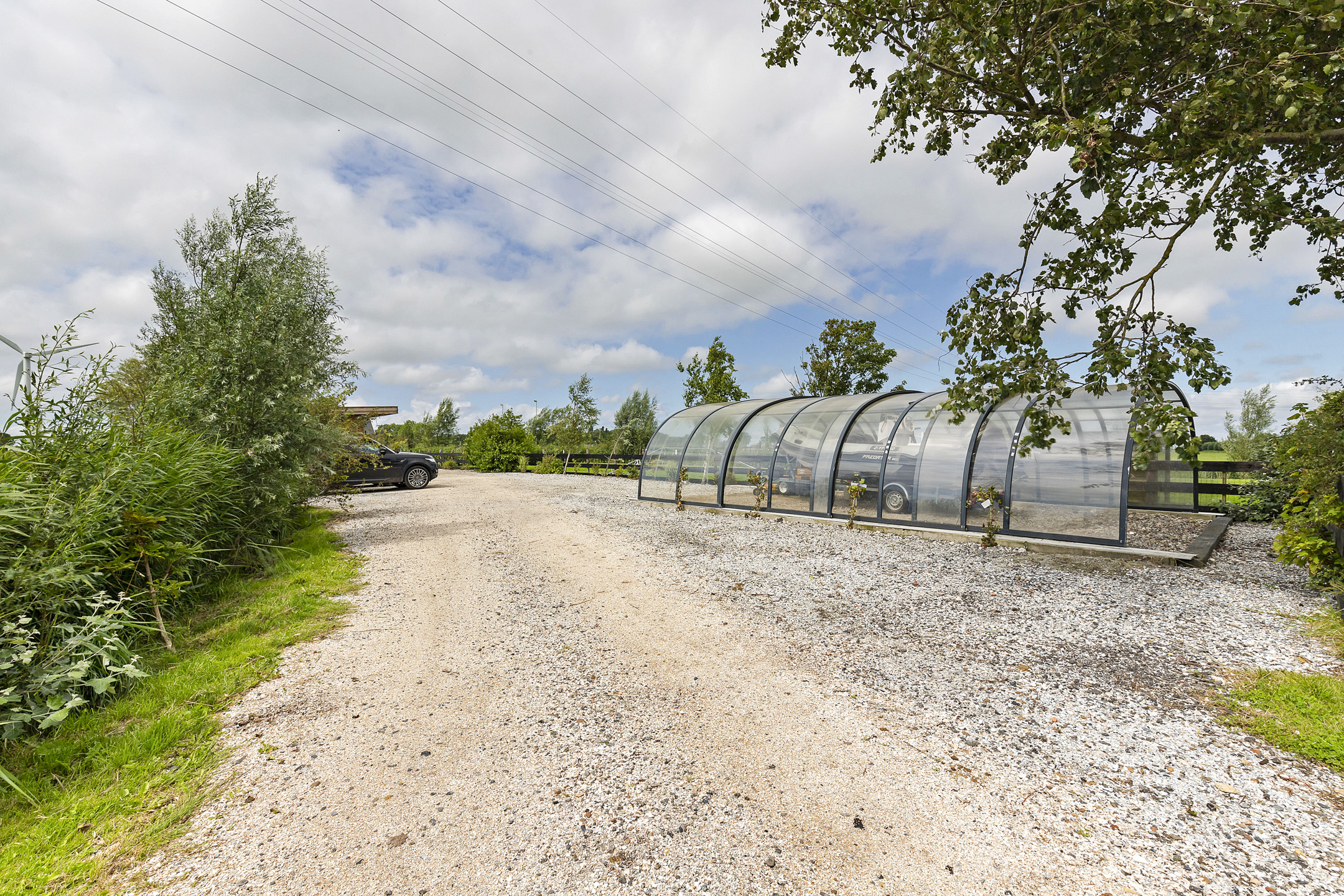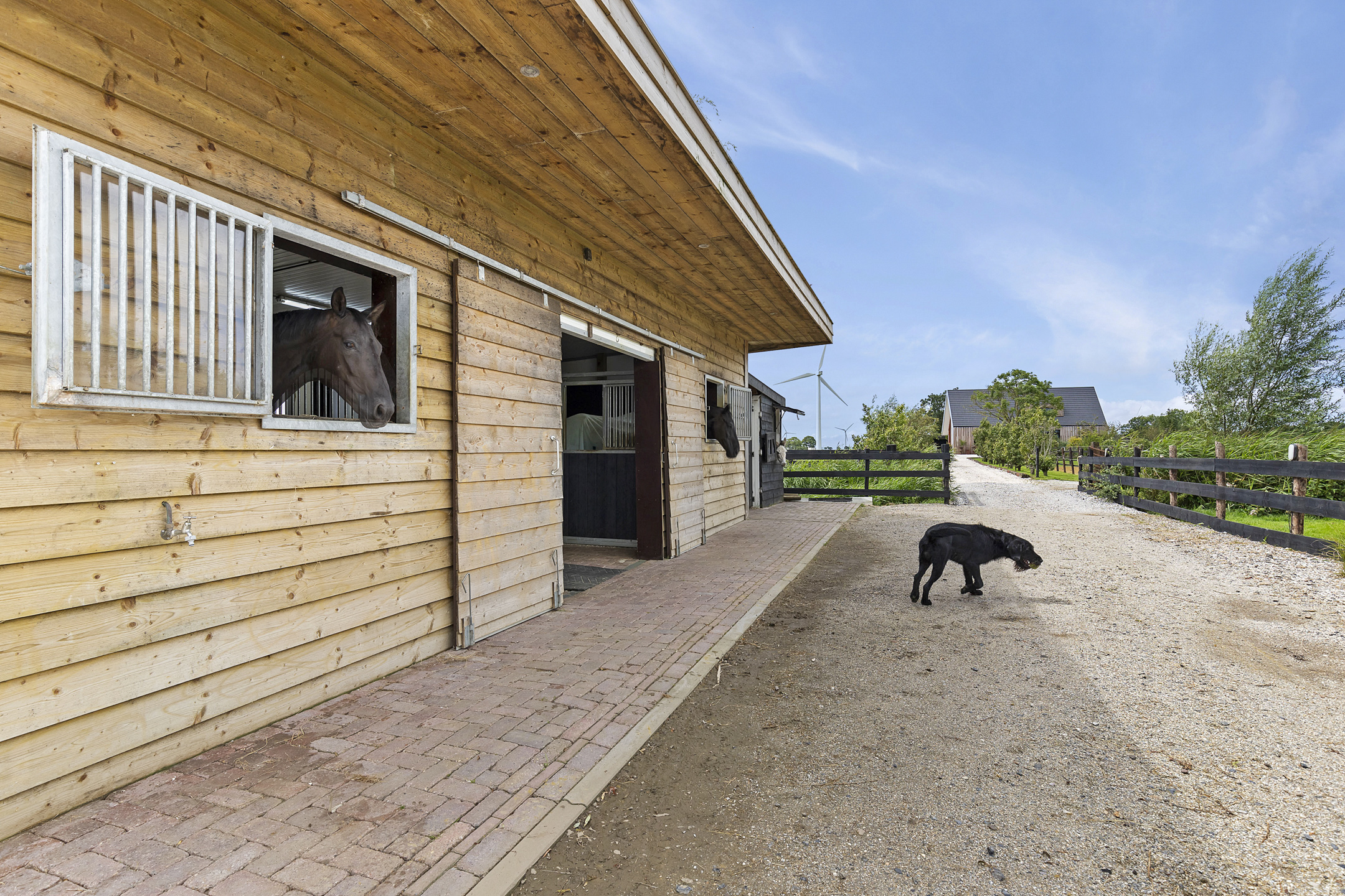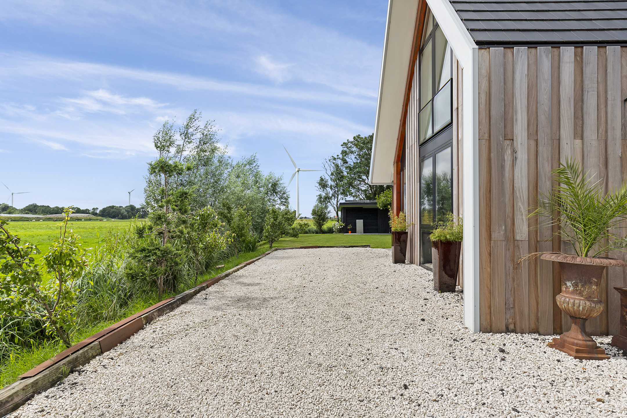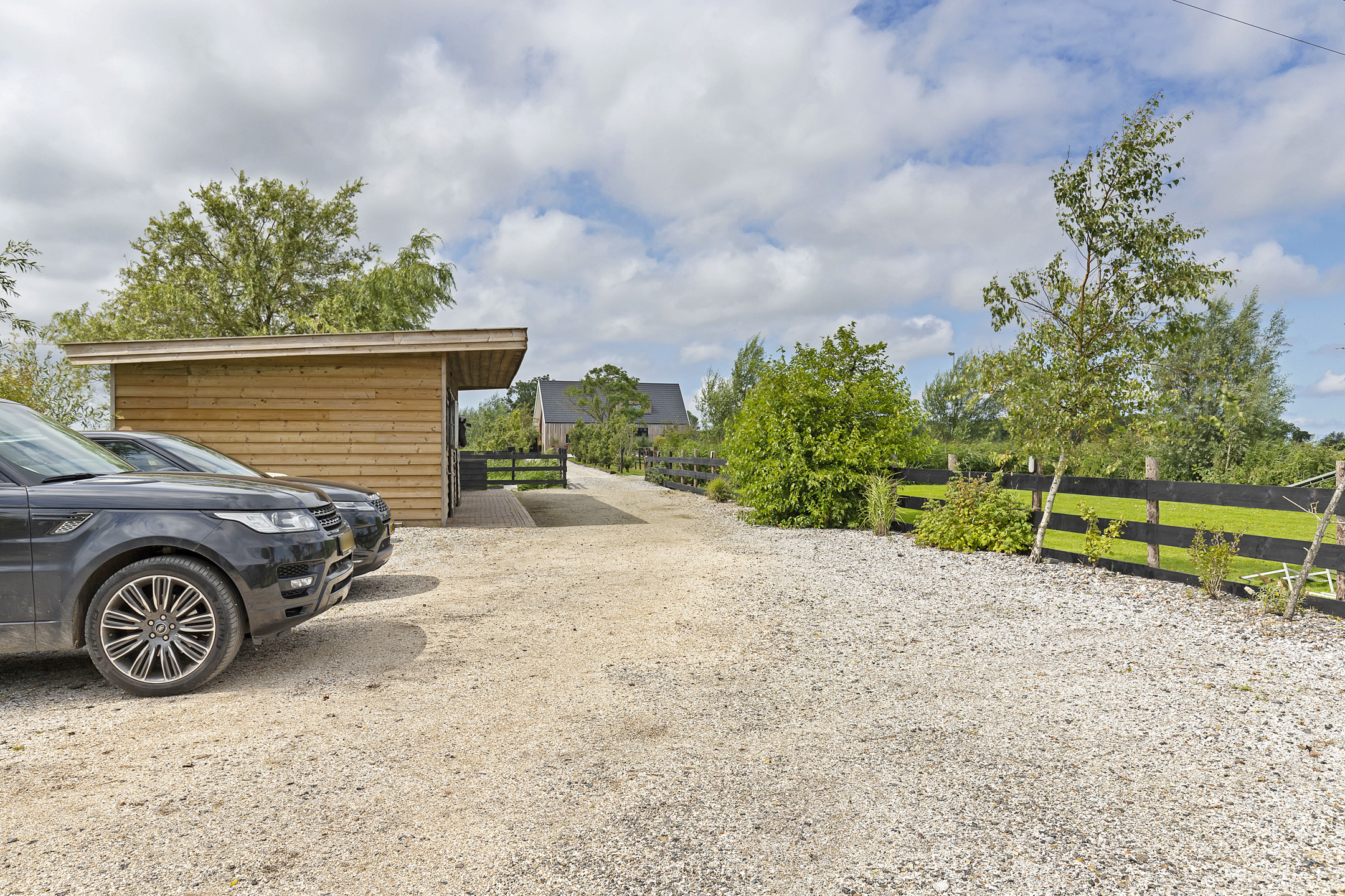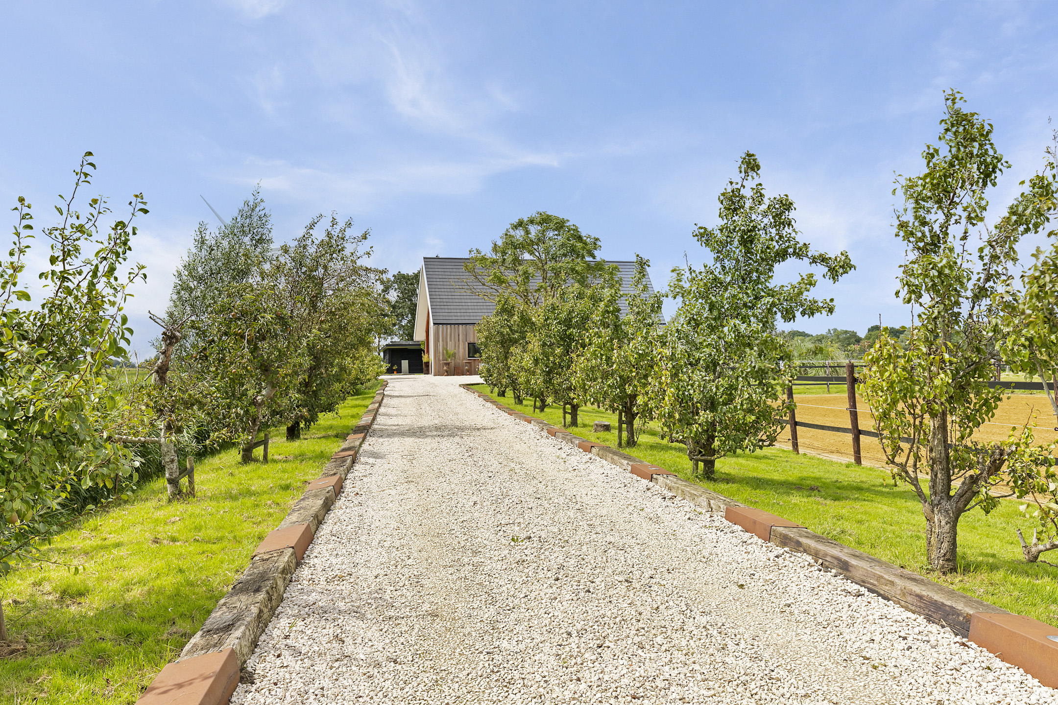 The driveway to the house, garages, and stable is covered with gravel with flower borders edged with corten steel and garden lighting. There is ample parking on the property, both at the stables and the house, for multiple cars. The garden directly around the house has several terraces in sun and shade, offering beautiful views from all angles over varying natural areas and the passing sailboats, pleasure yachts, and commercial vessels. The sheltered courtyard garden with the 4 linden trees, beautiful lighting, and outdoor kitchen offers the utmost privacy. There are many types of fruit trees, berry bushes, shrubs, and flower borders in the garden. The over 1.7 ha meadow, bordered by a ditch, has two access points and is located directly behind the stables along the Van Harinxmakanaal. In the current situation, the horses graze on the plot behind the house, but in the new situation, due to land consolidation, this will change to the front (canal and view side) of the house. The 20x40 riding arena is well-drained and equipped with a soft surface and lighting.
