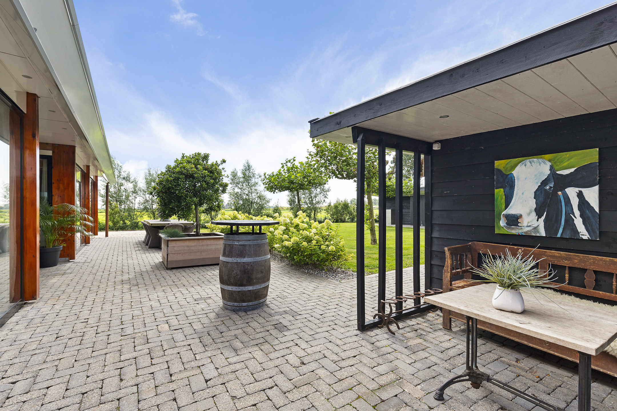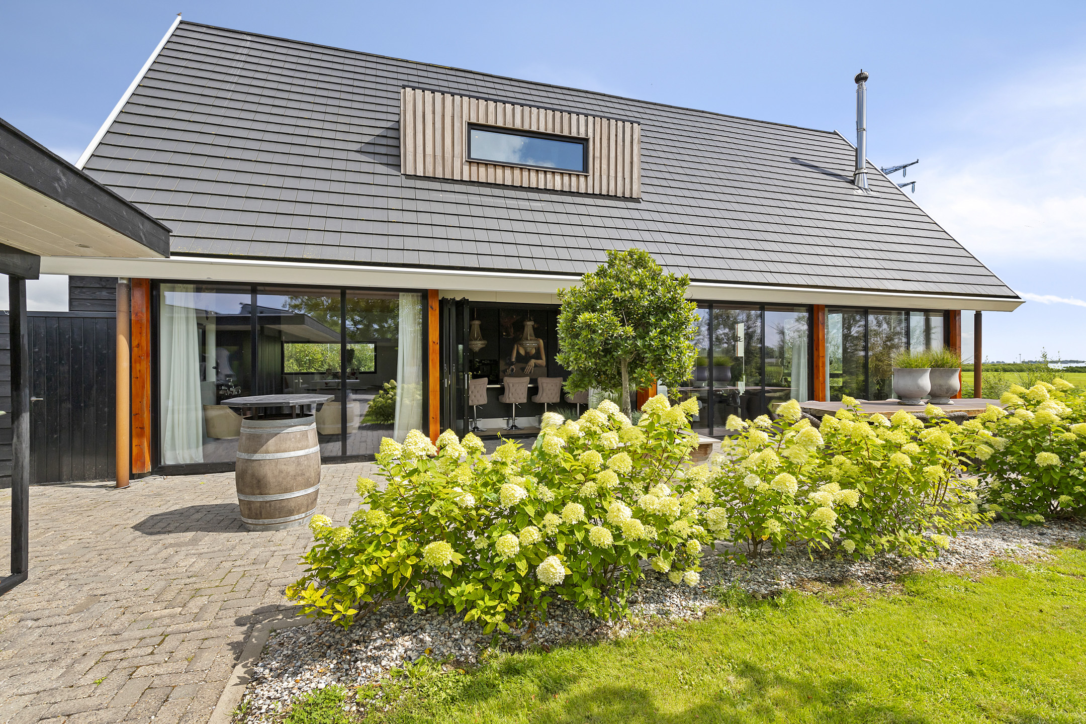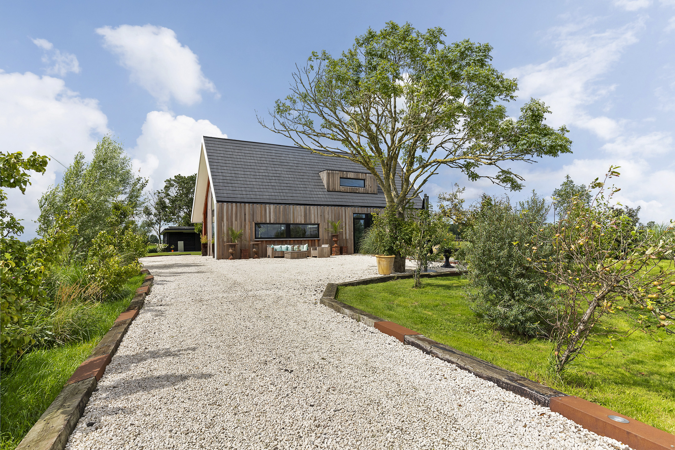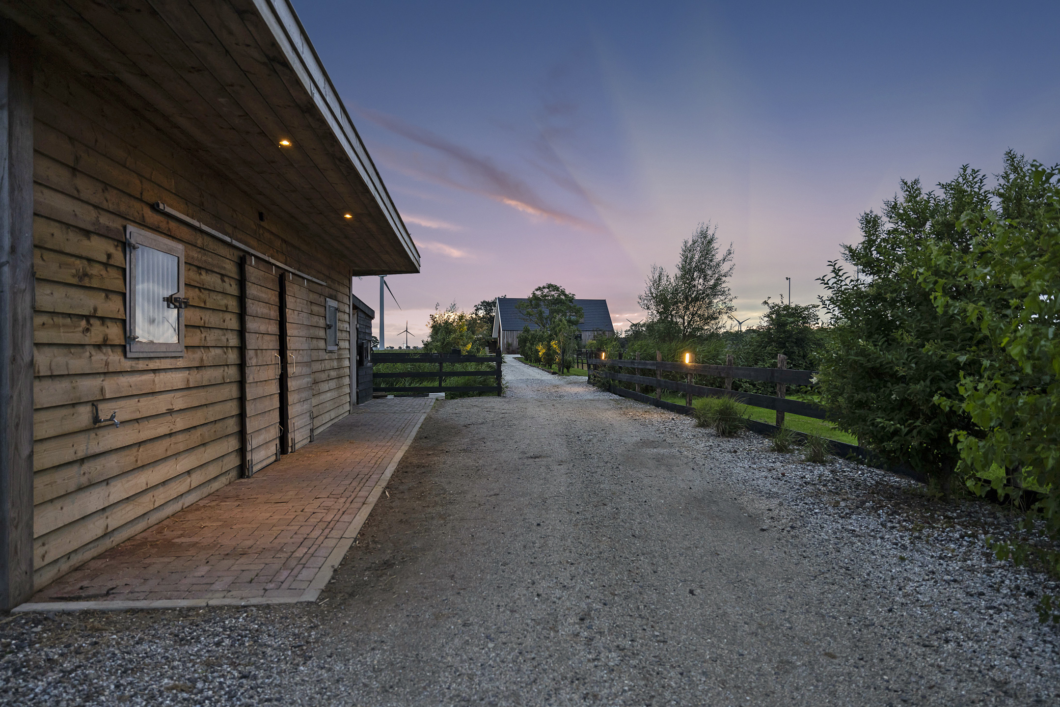 The driveway to the house, garages, and stable is covered with gravel with flower borders edged with corten steel and garden lighting. There is ample parking on the property, both at the stables and the house, for multiple cars. The garden directly around the house has several terraces in sun and shade, offering beautiful views from all angles over varying natural areas and the passing sailboats, pleasure yachts, and commercial vessels. The sheltered courtyard garden with the 4 linden trees, beautiful lighting, and outdoor kitchen offers the utmost privacy. There are many types of fruit trees, berry bushes, shrubs, and flower borders in the garden. The over 1.7 ha meadow, bordered by a ditch, has two access points and is located directly behind the stables along the Van Harinxmakanaal. In the current situation, the horses graze on the plot behind the house, but in the new situation, due to land consolidation, this will change to the front (canal and view side) of the house. The 20x40 riding arena is well-drained and equipped with a soft surface and lighting.